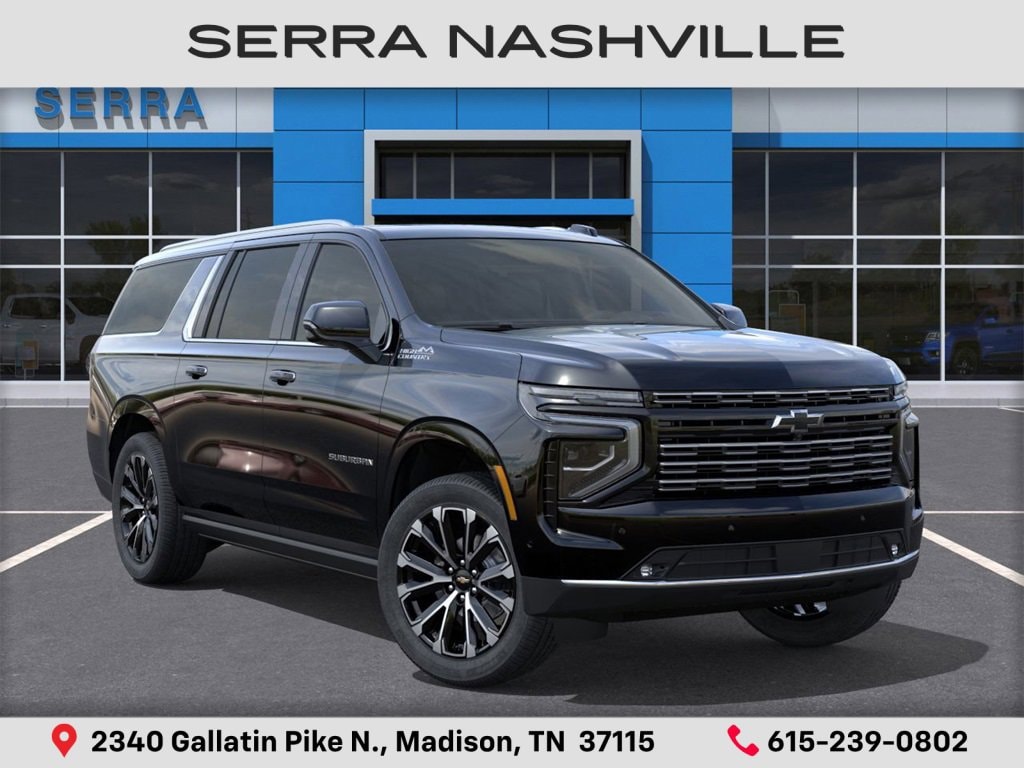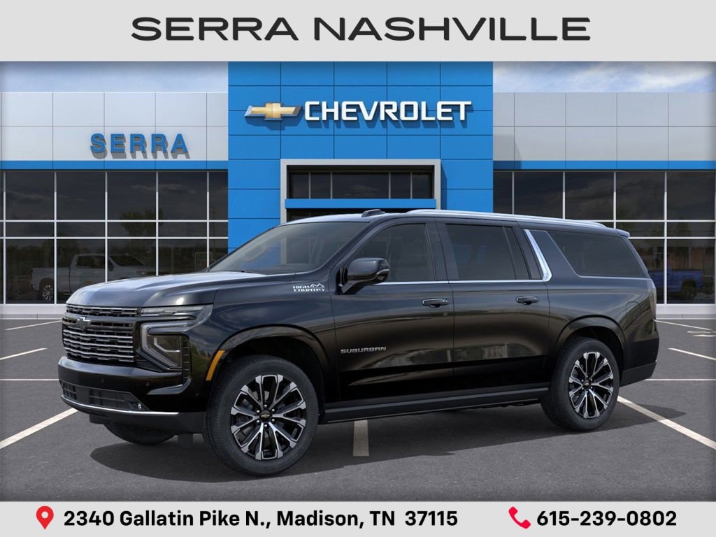 $7,448 off MSRP! 2025 Chevrolet Suburban High Country For sale at Serra Chevrolet Nashville - Serra Nashville has the largest selection of the new Chevrolet Suburban in Nashville. This vehicle is Black and well equipped with Advanced Security Package (Glass Breakage Sensor, Self-Powered Horn Theft-Deterrent Alarm System, Vehicle Inclination Sensor, and Vehicle Interior Movement Sensor), Advanced Trailering Package (Blind Zone Steering Assist w/Trailering, Hitch View w/Pan/Zoom Image Adjustment, and Smart Trailer Integration Indicator), High Country Deluxe (Air Ride Adaptive Suspension, Dual-Pane Power Panoramic Sunroof, and Power-Retractable Assist Steps), Max Trailering Package (2-Speed Active Electronic AutoTrac Transfer Case, Extra Capacity Cooling System, Hill Descent Control, and Integrated Trailer Brake Controller), Technology & Entertainment Package (Rear Seat Media System), Technology Package (AutoSense Hands-Free Power Liftgate), 10 Speakers, 15 Diagonal Multi-Color Head-Up Display, 3.23 Rear Axle Ratio, 3rd Row 60/40 Power-Folding Split-Bench, 3rd row seats: split-bench, 4-Way Power Driver Lumbar Seat Adjuster, 4-Way Power Front Passenger Lumbar Seat Adjuster, 4-Wheel Disc Brakes, 8-Way Power Driver Seat Adjuster, 8-Way Power Front Passenger Seat Adjuster, ABS brakes, Adaptive suspension, Air Conditioning, Alloy wheels, AM/FM radio: SiriusXM with 360L, Apple CarPlay/Android Auto, Auto High-beam Headlights, Auto-dimming door mirrors, Auto-dimming Rear-View mirror, Auto-leveling suspension, Automatic temperature control, Bose 10-Speaker Surround w/CenterPoint, Brake assist, Bright Front & Rear Door Sill Plates, Bumpers: body-color, Chrome Door Handles w/Body-Color Strip, Compass, Delay-off headlights, Driver door bin, Driver vanity mirror, Dual Exhaust System, Dual front impact airbags, Dual front side impact airbags, Electronic Stability Control, Emergency communication system: OnStar Services capable, Exterior Parking Camera Rear, Four wheel independent suspension, Front & Rear Black Bowtie Emblems (LPO), Front anti-roll bar, Front Bucket Seats, Front Center Armrest, Front dual zone A/C, Front fog lights, Front LED Fog Lamps, Front reading lights, Fully automatic headlights, Garage door transmitter, Heads-Up Display, Heated 2nd Row Outboard Seats, Heated door mirrors, Heated Driver & Front Passenger Seats, Heated front seats, Heated Power-Adjustable Outside Mirrors, Heated rear seats, Heated Steering Wheel, Heated steering wheel, Illuminated entry, Inside Rearview Auto-Dimming Rear Camera Mirror, LED Headlamps w/LED Daytime Running Lamps, LED Tail Lamps, Low tire pressure warning, Magnetic Ride Control Suspension, Memory seat, Memory Settings, Navigation system: Google built-in compatibility (select service plan required, terms and limitations apply), Occupant sensing airbag, Outside temperature display, Overhead airbag, Overhead console, Panic alarm, Passenger door bin, Passenger vanity mirror, Perforated Heated & Ventilated Seats, Perforated Leather Seating Surfaces, Power door mirrors, Power driver seat, Power Liftgate, Power passenger seat, Power Release 2nd Row Bucket Seats, Power steering, Power Tilt & Telescopic Steering Column, Power windows, Power-Sliding Center Floor Console, Radio data system, Radio: 17.7 Diagonal Advanced Color LCD Display, Rain sensing wipers, Rear air conditioning, Rear anti-roll bar, Rear Power Liftgate, Rear reading lights, Rear window defroster, Rear window wiper, Remote keyless entry, Security system, SiriusXM w/360L Trial Subscription, Speed control, Speed-sensing steering, Split folding rear seat, Spoiler, Steering wheel memory, Steering wheel mounted audio controls, Tachometer, Telescoping steering wheel, Tilt steering wheel, Traction control, Trailer Camera Provisions, Trailering Assist Guidelines, Trip computer, Turn signal indicator mirrors, Universal Home Remote, Variably intermittent wipers, Ventilated front seats, Voltmeter,