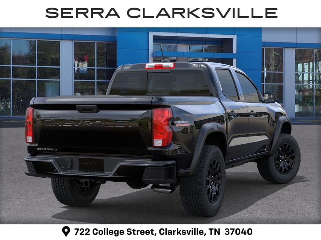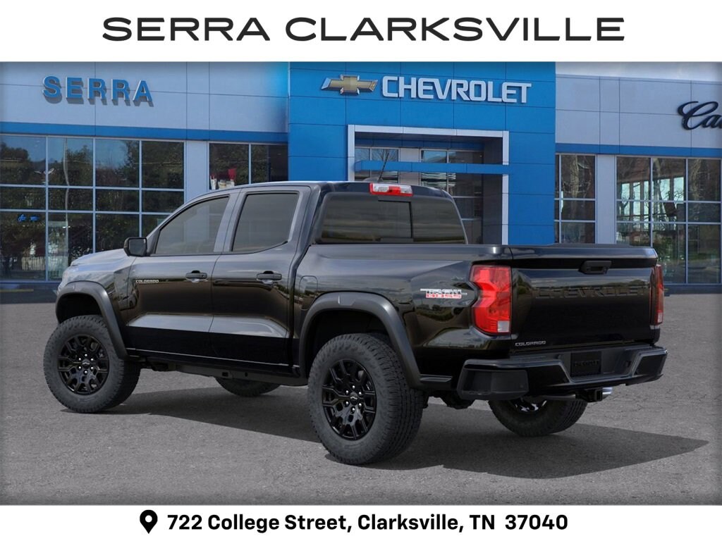 Black 2026 Chevrolet Colorado Trail Boss For sale at Serra Chevrolet Clarksville is well equipped: 4WD, 3.42 Rear Axle Ratio, 4-Way Manual Passenger Seat Adjuster, 4-Wheel Disc Brakes, 6 Speakers, 6-Speaker Audio System Feature, 6-Way Manual Driver Seat Adjuster, ABS brakes, Air Conditioning, Alloy wheels, AM/FM radio: SiriusXM with 360L, Apple CarPlay/Android Auto, Auto High-beam Headlights, Automatic Emergency Braking, Automatic temperature control, Brake assist, Chevy Safety Assist, Cloth Seat Trim, Compass, Delay-off headlights, Driver door bin, Driver vanity mirror, Dual front impact airbags, Dual front side impact airbags, Electronic Stability Control, Emergency communication system: OnStar, Following Distance Indicator, Forward Collision Alert, Front anti-roll bar, Front Bucket Seats, Front Center Armrest, Front dual zone A/C, Front Pedestrian and Bicyclist Braking, Front wheel independent suspension, Heated door mirrors, Illuminated entry, IntelliBeam Automatic High Beam on/Off, Lane Keep Assist with Lane Departure Warning, Low tire pressure warning, Navigation System, Occupant sensing airbag, Outside temperature display, Overhead airbag, Overhead console, Panic alarm, Passenger door bin, Passenger vanity mirror, Power door mirrors, Power steering, Power windows, Radio data system, Radio: 11.3 Diagonal Advanced Color LCD Display, Rear reading lights, Rear step bumper, Rear window defroster, Remote keyless entry, Security system, SiriusXM with 360L Trial Subscription, Speed control, Speed-sensing steering, Split folding rear seat, Steering Wheel Mounted Audio Controls, Steering wheel mounted audio controls, Tachometer, Tilt steering wheel, Traction control, Trip computer, Variably intermittent wipers, Wheels: 18 x 8.5 Black High Gloss Aluminum, and Wireless Phone Projection.