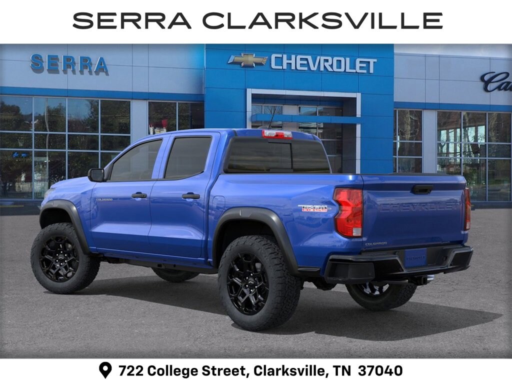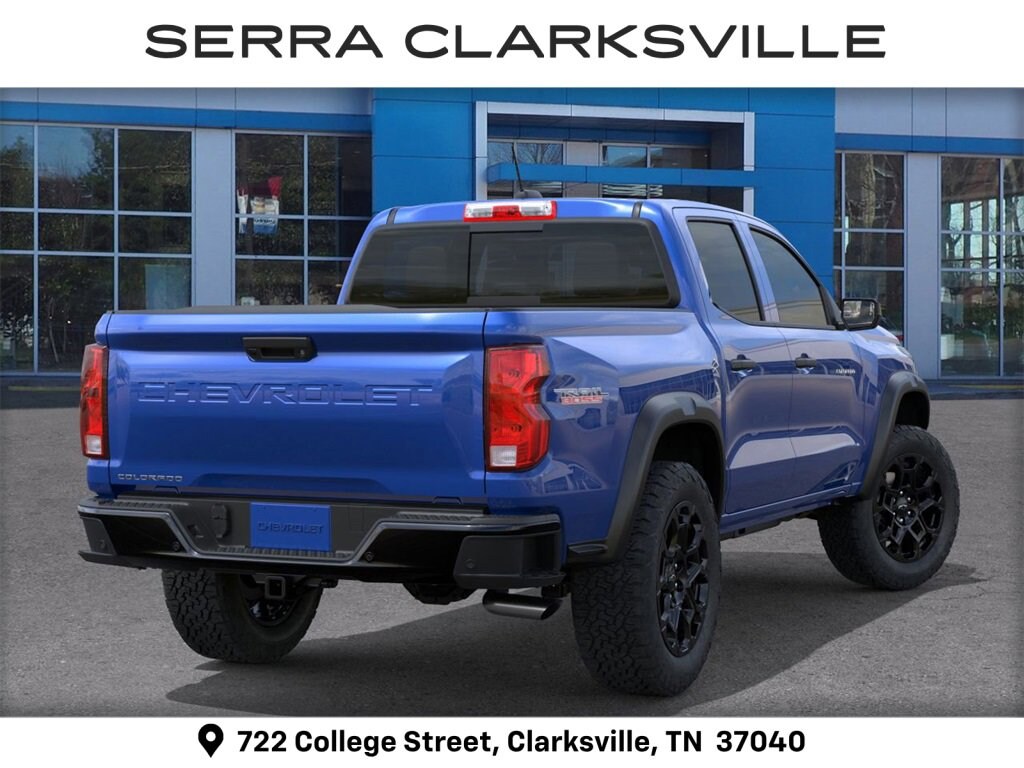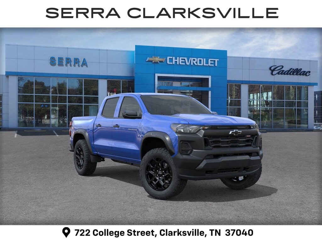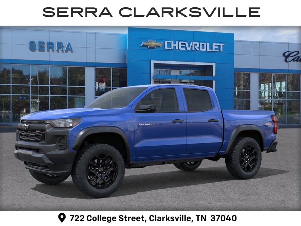 Blue 2026 Chevrolet Colorado Trail Boss For sale at Serra Chevrolet Clarksville is well equipped: 4WD, 3.42 Rear Axle Ratio, 4-Way Manual Passenger Seat Adjuster, 4-Wheel Disc Brakes, 6 Speakers, 6-Speaker Audio System Feature, 6-Way Manual Driver Seat Adjuster, ABS brakes, Air Conditioning, Alloy wheels, AM/FM radio: SiriusXM with 360L, Apple CarPlay/Android Auto, Auto High-beam Headlights, Automatic Emergency Braking, Automatic temperature control, Brake assist, Chevy Safety Assist, Cloth Seat Trim, Compass, Delay-off headlights, Driver door bin, Driver vanity mirror, Dual front impact airbags, Dual front side impact airbags, Electronic Stability Control, Emergency communication system: OnStar, Following Distance Indicator, Forward Collision Alert, Front anti-roll bar, Front Bucket Seats, Front Center Armrest, Front dual zone A/C, Front Pedestrian and Bicyclist Braking, Front wheel independent suspension, Heated door mirrors, Illuminated entry, IntelliBeam Automatic High Beam on/Off, Lane Keep Assist with Lane Departure Warning, Low tire pressure warning, Navigation System, Occupant sensing airbag, Outside temperature display, Overhead airbag, Overhead console, Panic alarm, Passenger door bin, Passenger vanity mirror, Power door mirrors, Power steering, Power windows, Radio data system, Radio: 11.3 Diagonal Advanced Color LCD Display, Rear reading lights, Rear step bumper, Rear window defroster, Remote keyless entry, Security system, SiriusXM with 360L Trial Subscription, Speed control, Speed-sensing steering, Split folding rear seat, Steering Wheel Mounted Audio Controls, Steering wheel mounted audio controls, Tachometer, Tilt steering wheel, Traction control, Trip computer, Variably intermittent wipers, Wheels: 18 x 8.5 Black High Gloss Aluminum, and Wireless Phone Projection.