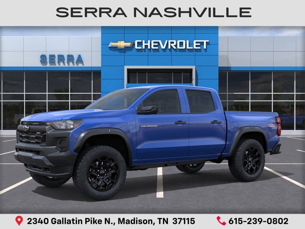$1,305 off MSRP! Reef Blue Metallic 2026 Chevrolet Colorado Trail Boss For sale at Serra Chevrolet Nashville and well equipped: Preferred Equipment Group 0TR (Automatic Emergency Braking, Chevy Safety Assist, Following Distance Indicator, Forward Collision Alert, Front Pedestrian & Bicyclist Braking, IntelliBeam Automatic High Beam On/Off, and Lane Keep Assist w/Lane Departure Warning), 3.42 Rear Axle Ratio, 4-Way Manual Passenger Seat Adjuster, 4-Wheel Disc Brakes, 6 Speakers, 6-Speaker Audio System Feature, 6-Way Manual Driver Seat Adjuster, ABS brakes, Air Conditioning, Alloy wheels, AM/FM radio: SiriusXM with 360L, Apple CarPlay/Android Auto, Auto High-beam Headlights, Automatic temperature control, Brake assist, Cloth Seat Trim, Compass, Delay-off headlights, Driver door bin, Driver vanity mirror, Dual front impact airbags, Dual front side impact airbags, Electronic Stability Control, Emergency communication system: OnStar, Front anti-roll bar, Front Bucket Seats, Front Center Armrest, Front dual zone A/C, Front wheel independent suspension, Heated door mirrors, Illuminated entry, Low tire pressure warning, Navigation System, Occupant sensing airbag, Outside temperature display, Overhead airbag, Overhead console, Panic alarm, Passenger door bin, Passenger vanity mirror, Power door mirrors, Power steering, Power windows, Radio data system, Radio: 11.3 Diagonal Advanced Color LCD Display, Rear reading lights, Rear step bumper, Rear window defroster, Remote keyless entry, Security system, SiriusXM w/360L Trial Subscription, Speed control, Speed-sensing steering, Split folding rear seat, Steering Wheel Mounted Audio Controls, Steering wheel mounted audio controls, Tachometer, Tilt steering wheel, Traction control, Trip computer, Variably intermittent wipers, Wheels: 18 x 8.5 Black High Gloss Aluminum, Wheels: 20 x 9 High Gloss Black Aluminum, and Wireless Phone Projection.