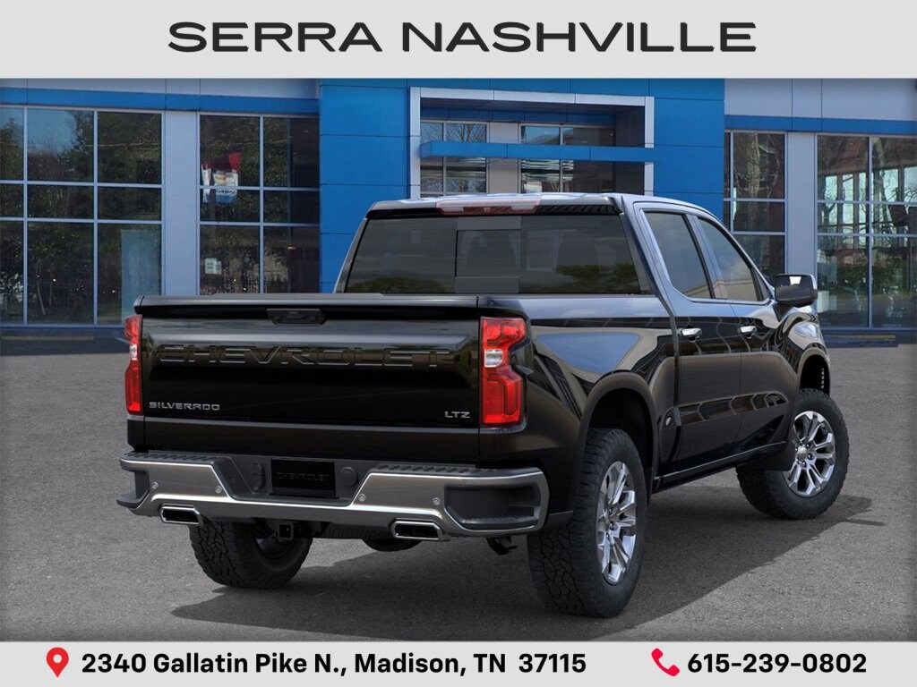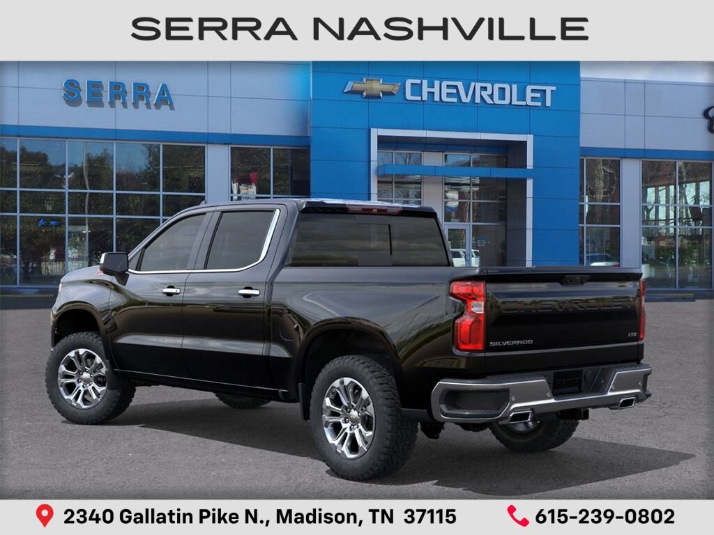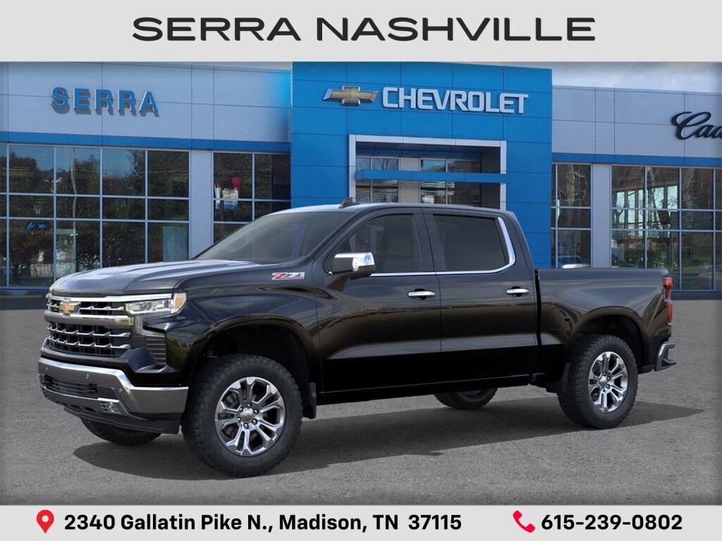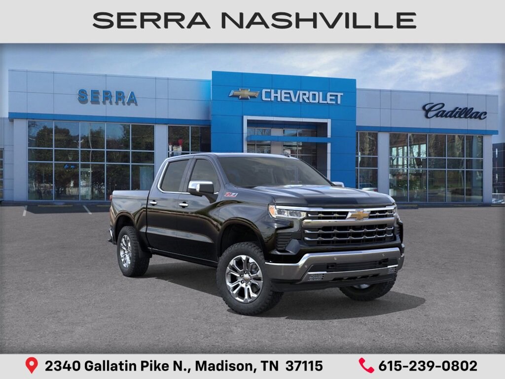 2026 Chevrolet Silverado 1500 LTZ For sale at Serra Chevrolet Nashville - Serra Nashville has the largest selection of the new Chevrolet Silverado 1500 in Nashville. This vehicle is Black and well equipped with High Capacity Suspension Package, LTZ Convenience Package (2 USB Data Ports, Floor Mounted Center Console, Front Bucket Seats, Power Tilt and Telescoping Steering Column, Premium Bose 7-Speaker Sound System, Ventilated Driver and Front Passenger Seats, and Wireless Charging), LTZ Convenience Package II (2nd Row Heated Outboard Seats, Adaptive Cruise Control, Power Sliding Rear Window with Rear Defogger, and Universal Home Remote), LTZ Plus Package, LTZ Premium Package (Power Sunroof), Preferred Equipment Group 1LZ (10-Way Power Driver Seat with Lumbar, 10-Way Power Passenger Seat Adjuster with Lumbar, 12.3 Multicolor Reconfigurable Digital Display, 120-Volt Bed Mounted Power Outlet, 120-Volt Interior Power Outlet, Auto-Dimming Inside Rear-View Mirror, Auto-Locking Rear Differential, Bluetooth® For Phone, Chrome Mirror Caps, Color-Keyed Carpeting Floor Covering, Deep-Tinted Glass, Driver Memory, Dual Rear USB Ports (charge Only), Electric Rear-Window Defogger, Electronic Cruise Control, Front Frame-Mounted Black Recovery Hooks, Front LED Fog Lamps, Front Rain-Sensing Wipers, Front Rubberized Vinyl Floor Mats, Heated Driver and Front Outboard Passenger Seats, Heated Steering Wheel, Hitch Guidance with Hitch View, in-Vehicle Trailering System App, Integrated Trailer Brake Controller, Keyless Open and Start, LED Cargo Area Lighting, OnStar Services Capable, Outside Heated Power-Adjustable Mirrors, Power Front Passenger Windows with Express Up/Down, Power Front Windows with Driver Express Up/Down, Power Rear Windows with Express Down, Power Tailgate, Rear Rubberized-Vinyl Floor Mats, Rear Wheelhouse Liners, Remote Vehicle Starter System, SiriusXM with 360L Trial Subscription, Standard Tailgate, Steering Wheel Audio Controls, Teen Driver, Theft Deterrent System (unauthorized Entry), Tire Pressure Monitoring System, Wi-Fi Hot Spot Capable, and Wrapped Steering Wheel), Safety Package (HD Surround Vision, Perimeter Lighting, Rear Cross Traffic Braking, Rear Pedestrian Alert, Safety Alert Seat, Trailer Camera Provisions, Trailer Side Blind Zone Alert, and Ultrasonic Front and Rear Park Assist), Technology Package (15 Diagonal Multicolor Head-Up Display, Bed View Camera, and Rear Camera Mirror), Trailering Package (Hitch Guidance), Up-Level Rear Seat with Storage Package, Z71 Off-Road and Protection Package (All-Weather Floor Liner and Chevytec Spray-on Black Bedliner), Z71 Off-Road Package (Heavy-Duty Air Filter, Hill Descent Control, and Off-Road Suspension), 10-Speed Automatic, 4WD, Gideon/Very Dark Atmosphere Leather, 170 Amp Alternator, 220 Amp Alternator, 4-Wheel Disc Brakes, 7 Speakers, ABS brakes, Air Conditioning, Alloy wheels, AM/FM radio: SiriusXM with 360L, Apple CarPlay/Android Auto, Auto High-beam Headlights, Auto-dimming door mirrors, Auto-dimming Rear-View mirror, Automatic Emergency Braking, Automatic temperature control, Brake assist, Bumpers: chrome, Compass, Delay-off headlights, Driver door bin, Driver vanity mirror, Dual Exhaust with Polished Outlets, Dual front impact airbags, Dual front side impact airbags, Electronic Stability Control, Electronic Transmission Range Selector Shifter, Emergency communication system: OnStar, Engine Block Heater, Following Distance Indicator, Forward Collision Alert, Front anti-roll bar, Front Center Armrest, Front dual zone A/C, Front fog lights, Front License Plate Kit, Front Pedestrian Braking, Front reading lights, Front wheel independent suspension, Fully automatic headlights, Heated door mirrors, Heated front seats, Heated steering wheel, Illuminated entry, IntelliBeam Automatic High Beam on/Off, Lane Keep Assist with Lane Departure Warning, Low tire pressure warning, Memory seat, Occupant sensing airbag, Outside temperat