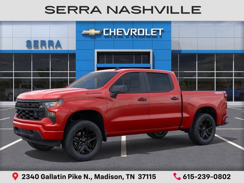 $6,594 off MSRP! Priced below KBB Fair Purchase Price! 2026 Chevrolet Silverado 1500 Custom For sale at Serra Chevrolet Nashville - Serra Nashville has the largest selection of the new Chevrolet Silverado 1500 in Nashville. This vehicle is Red Hot and well equipped with Custom Convenience Package (Electric Rear-Window Defogger, EZ Lift Power Lock and Release Tailgate, LED Cargo Area Lighting, Remote Vehicle Starter System, and Theft Deterrent System (unauthorized Entry)), Custom Value Package, Dark Essentials Package (Black Name Plates and Front Black Bowtie Emblem), High Capacity Suspension Package, Preferred Equipment Group 1CX (10-Way Power Driver Seat with Lumbar, 120-Volt Bed Mounted Power Outlet, 120-Volt Interior Power Outlet, 3.5 Monochromatic Display Driver Info Center, 40/20/40 Front Split-Bench Seat, Bluetooth® For Phone, Cloth Seat Trim, Color-Keyed Carpeting Floor Covering, Deep-Tinted Glass, Dual Rear USB Ports (charge Only), Electronic Cruise Control, Front Frame-Mounted Black Recovery Hooks, Front Rubberized Vinyl Floor Mats, HD Rear Vision Camera, Manual Tilt Wheel Steering Column, OnStar Services Capable, Power Front Windows with Driver Express Up/Down, Power Front Windows with Passenger Express Down, Power Rear Windows with Express Down, Rear 60/40 Folding Bench Seat (folds Up), Rear Rubberized-Vinyl Floor Mats, Remote Keyless Entry, SiriusXM Trial Subscription, Standard Tailgate, Teen Driver, Tire Pressure Monitoring System, and Wi-Fi Hot Spot Capable), Trailering Package (Hitch Guidance), 8-Speed Automatic, 4WD, Jet Black Cloth, 3.42 Rear Axle Ratio, 4-Wheel Disc Brakes, 6 Speakers, 6-Speaker Audio System, ABS brakes, Air Conditioning, All-Weather Floor Liner, Alloy wheels, AM/FM radio: SiriusXM, Apple CarPlay/Android Auto, Auto High-beam Headlights, Automatic Emergency Braking, Brake assist, Bumpers: body-color, Compass, Delay-off headlights, Driver door bin, Driver vanity mirror, Dual front impact airbags, Dual front side impact airbags, Electronic Stability Control, Emergency communication system: OnStar, Following Distance Indicator, Forward Collision Alert, Front anti-roll bar, Front Center Armrest w/Storage, Front License Plate Kit, Front Pedestrian Braking, Front reading lights, Front wheel independent suspension, Fully automatic headlights, Heated door mirrors, Illuminated entry, IntelliBeam Automatic High Beam on/Off, Lane Keep Assist with Lane Departure Warning, Low tire pressure warning, Multi-Flex Tailgate, Occupant sensing airbag, Outside temperature display, Overhead airbag, Overhead console, Panic alarm, Passenger door bin, Passenger vanity mirror, Power door mirrors, Power driver seat, Power steering, Power windows, Premium audio system: Chevrolet Infotainment 3, Radio data system, Radio: Chevrolet Infotainment 3 System, Rear reading lights, Rear step bumper, Rear window defroster, Remote keyless entry, Security system, Speed control, Speed-sensing steering, Split folding rear seat, Tachometer, Tilt steering wheel, Traction control, Trip computer, Variably intermittent wipers, Voltmeter, Wheels: 20 x 9 Bright Silver Painted Aluminum, and Wheels: 20 x 9 High Gloss Black Painted Aluminum.