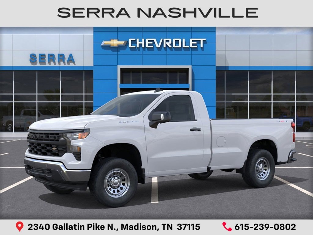 $4,000 off MSRP! Priced below KBB Fair Purchase Price! 2026 Chevrolet Silverado 1500 WT For sale at Serra Chevrolet Nashville - Serra Nashville has the largest selection of the new Chevrolet Silverado 1500 in Nashville. This vehicle is Summit White and well equipped with Standard Suspension Package, Trailering Package (Hitch Guidance), WT Convenience Package (Deep-Tinted Glass and Electric Rear-Window Defogger), WT Safety Package (Front Chrome Bumper, High Gloss Black Mirror Caps, Lane Change Alert with Side Blind Zone Alert, Perimeter Lighting, Rear Chrome Bumper, Rear Cross Traffic Braking, Rear Pedestrian Alert, and Ultrasonic Front and Rear Park Assist), WT Value Package, 8-Speed Automatic, 4WD, Jet Black Vinyl, 120-Volt Bed Mounted Power Outlet, 120-Volt Interior Power Outlet, 2 Speakers, 2-Speaker Audio System, 220 Amp Alternator, 3.42 Rear Axle Ratio, 3.5 Monochromatic Display Driver Info Center, 4-Way Manual Driver Seat Adjuster, 4-Wheel Disc Brakes, 40/20/40 Front Split Bench Seat, ABS brakes, Air Conditioning, Apple CarPlay/Android Auto, Auto High-beam Headlights, Automatic Emergency Braking, Black (Semi-Gloss) Front Bumper, Black (Semi-Gloss) Rear Bumper, Black Work Step (LPO), Bluetooth® For Phone, Brake assist, Compass, Delay-off headlights, Driver door bin, Dual front impact airbags, Dual front side impact airbags, Electronic Cruise Control, Electronic Stability Control, Emergency communication system: OnStar, EZ Lift Power Lock and Release Tailgate, Following Distance Indicator, Forward Collision Alert, Front anti-roll bar, Front Center Armrest w/Storage, Front Frame-Mounted Black Recovery Hooks, Front Pedestrian Braking, Front reading lights, Front wheel independent suspension, Fully automatic headlights, HD Rear Vision Camera, Heated door mirrors, Heated Power-Adjustable Outside Mirrors, Illuminated entry, Inside Rearview Mirror with Tilt, IntelliBeam Automatic High Beam on/Off, Lane Keep Assist with Lane Departure Warning, Locking Tailgate, Low tire pressure warning, Manual Tailgate Function with No EZ Lift, Manual Tilt Wheel Steering Column, Occupant sensing airbag, OnStar Services Capable, Outside temperature display, Overhead airbag, Overhead console, Panic alarm, Passenger door bin, Passenger vanity mirror, Power door mirrors, Power Front Windows with Driver Express Up/Down, Power steering, Power windows, Premium audio system: Chevrolet Infotainment 3, Radio data system, Radio: Chevrolet Infotainment 3 System, Rear reading lights, Rear step bumper, Remote Keyless Entry, Remote keyless entry, Rubberized-Vinyl Floor Covering, SiriusXM Delete, Solar Absorbing Tinted Glass, Speed control, Speed-sensing steering, Standard Tailgate, Tachometer, Teen Driver, Tilt steering wheel, Tire Pressure Monitoring System, Traction control, Trip computer, Upfitter Switch Kit (5), Variably intermittent wipers, Vinyl Seat Trim, Voltmeter, Wheels: 17 x 8 Ultra Silver Painted Steel, and Wi-Fi Hot Spot Capable.