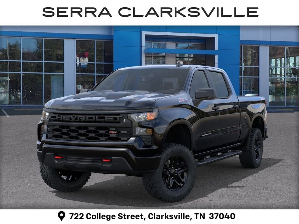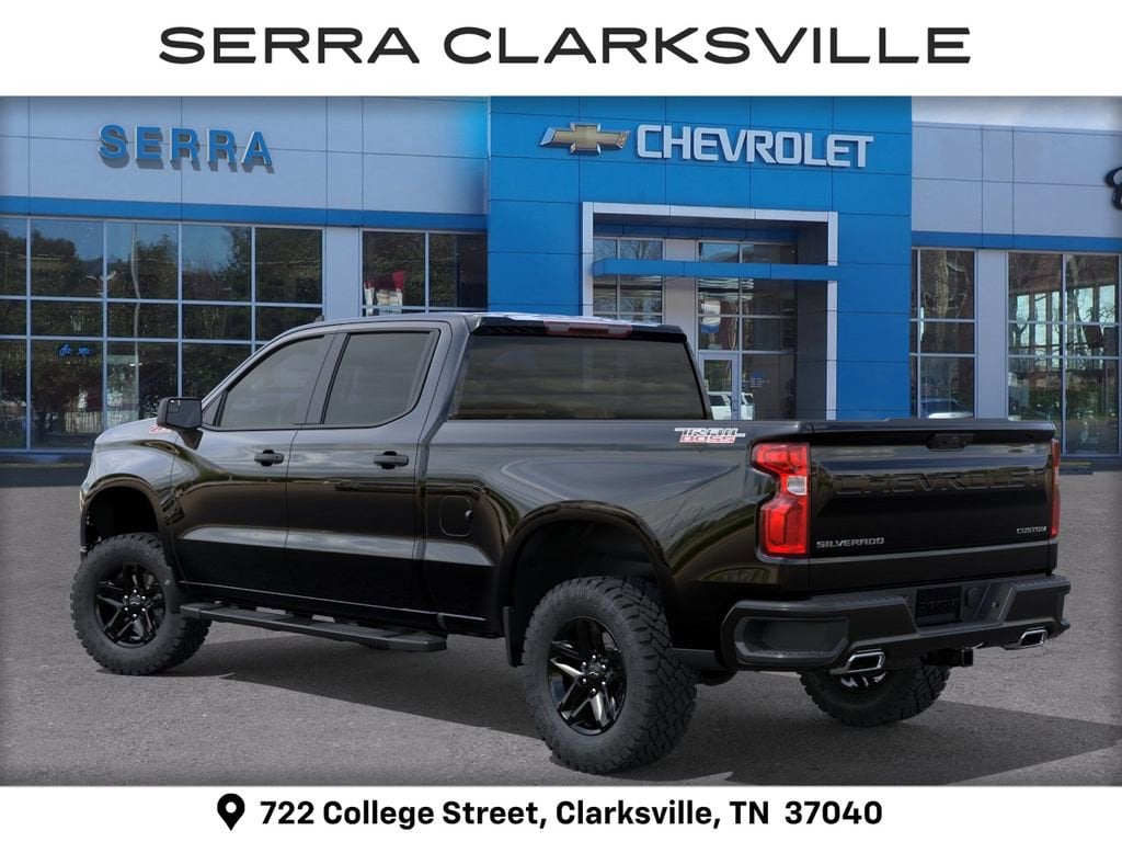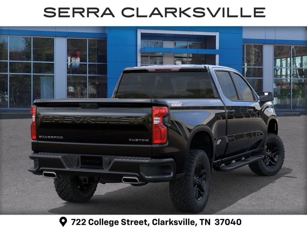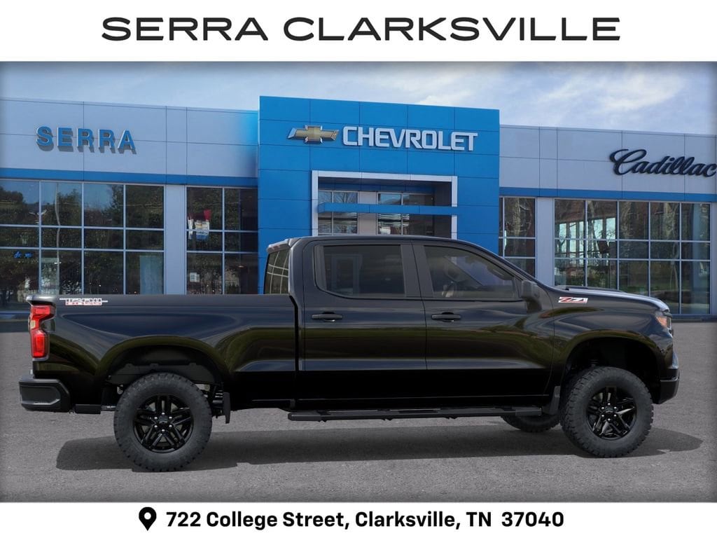 Black 2026 Chevrolet Silverado 1500 Custom Trail Boss For sale at Serra Chevrolet Clarksville is well equipped: Custom Convenience Package (Electric Rear-Window Defogger, EZ Lift Power Lock and Release Tailgate, LED Cargo Area Lighting, Remote Vehicle Starter System, and Theft Deterrent System (unauthorized Entry)), Suspension Package (Heavy-Duty Air Filter and Hill Descent Control), Trailering Package (Hitch Guidance), 10-Speed Automatic, 4WD, Jet Blk Clth Cloth, 10-Way Power Driver Seat with Lumbar, 120-Volt Bed Mounted Power Outlet, 120-Volt Interior Power Outlet, 220 Amp Alternator, 3.42 Rear Axle Ratio, 3.5 Monochromatic Display Driver Info Center, 4-Wheel Disc Brakes, 40/20/40 Front Split-Bench Seat, 6 Speakers, 6-Speaker Audio System, ABS brakes, Air Conditioning, Alloy wheels, AM/FM radio: SiriusXM, Apple CarPlay/Android Auto, Auto High-beam Headlights, Auto-Locking Rear Differential, Automatic Emergency Braking, Bluetooth® For Phone, Brake assist, Cloth Seat Trim, Color-Keyed Carpeting Floor Covering, Compass, Deep-Tinted Glass, Delay-off headlights, Driver door bin, Driver vanity mirror, Dual front impact airbags, Dual front side impact airbags, Dual Rear USB Ports (charge Only), Electronic Cruise Control, Electronic Stability Control, Emergency communication system: OnStar, Following Distance Indicator, Forward Collision Alert, Front anti-roll bar, Front Center Armrest w/Storage, Front Pedestrian Braking, Front reading lights, Front Rubberized Vinyl Floor Mats, Front wheel independent suspension, Fully automatic headlights, HD Rear Vision Camera, Heated door mirrors, Illuminated entry, IntelliBeam Automatic High Beam on/Off, Lane Keep Assist with Lane Departure Warning, Low tire pressure warning, Manual Tilt Wheel Steering Column, Occupant sensing airbag, OnStar Services Capable, Outside temperature display, Overhead airbag, Overhead console, Panic alarm, Passenger door bin, Passenger vanity mirror, Performance Red Recovery Hooks, Power door mirrors, Power driver seat, Power Front Windows with Driver Express Up/Down, Power Front Windows with Passenger Express Down, Power Rear Windows with Express Down, Power steering, Power windows, Premium audio system: Chevrolet Infotainment 3, Radio data system, Radio: Chevrolet Infotainment 3 System, Rear 60/40 Folding Bench Seat (folds Up), Rear reading lights, Rear Rubberized-Vinyl Floor Mats, Rear step bumper, Rear window defroster, Remote Keyless Entry, Remote keyless entry, Security system, Single Outlet Exhaust, SiriusXM Trial Subscription, Speed control, Speed-sensing steering, Split folding rear seat, Standard Tailgate, Tachometer, Teen Driver, Tilt steering wheel, Tire Pressure Monitoring System, Traction control, Trip computer, Variably intermittent wipers, Voltmeter, Wheels: 18 x 8.5 Black Painted Aluminum, and Wi-Fi Hot Spot Capable.