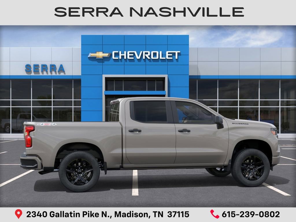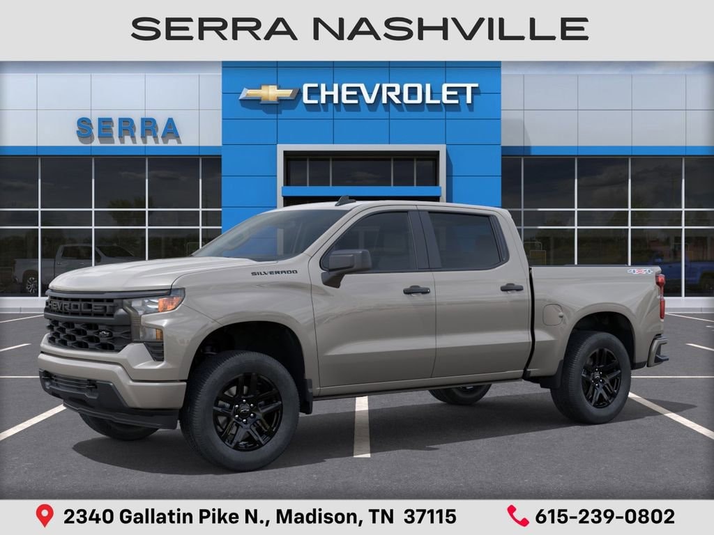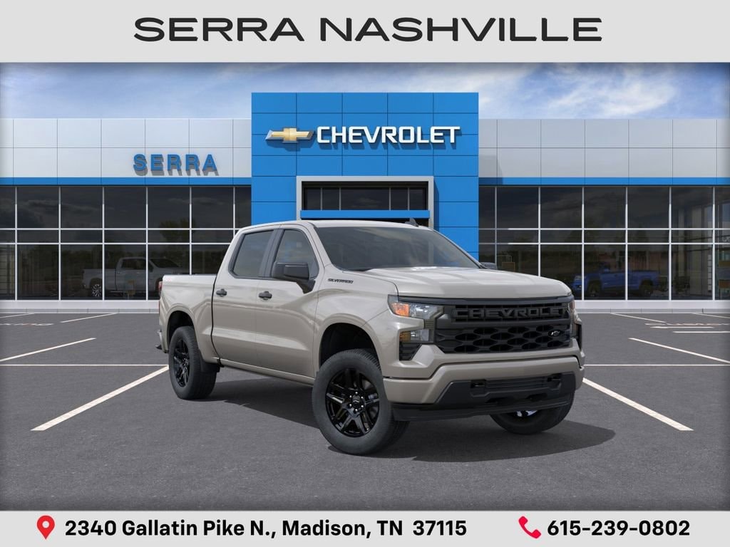 $5,082 off MSRP! Priced below KBB Fair Purchase Price! 2026 Chevrolet Silverado 1500 Custom For sale at Serra Chevrolet Nashville - Serra Nashville has the largest selection of the new Chevrolet Silverado 1500 in Nashville. This vehicle is White Sands and well equipped with Custom Convenience Package (Electric Rear-Window Defogger, EZ Lift Power Lock and Release Tailgate, LED Cargo Area Lighting, Remote Vehicle Starter System, and Theft Deterrent System (unauthorized Entry)), Custom Value Package, Dark Essentials Package (Black Name Plates and Front Black Bowtie Emblem), High Capacity Suspension Package, Preferred Equipment Group 1CX (10-Way Power Driver Seat with Lumbar, 120-Volt Bed Mounted Power Outlet, 120-Volt Interior Power Outlet, 3.5 Monochromatic Display Driver Info Center, 40/20/40 Front Split-Bench Seat, Bluetooth® For Phone, Cloth Seat Trim, Color-Keyed Carpeting Floor Covering, Deep-Tinted Glass, Dual Rear USB Ports (charge Only), Electronic Cruise Control, Front Frame-Mounted Black Recovery Hooks, Front Rubberized Vinyl Floor Mats, HD Rear Vision Camera, Manual Tilt Wheel Steering Column, OnStar Services Capable, Power Front Windows with Driver Express Up/Down, Power Front Windows with Passenger Express Down, Power Rear Windows with Express Down, Rear 60/40 Folding Bench Seat (folds Up), Rear Rubberized-Vinyl Floor Mats, Remote Keyless Entry, SiriusXM Trial Subscription, Standard Tailgate, Teen Driver, Tire Pressure Monitoring System, and Wi-Fi Hot Spot Capable), Trailering Package (Hitch Guidance), 8-Speed Automatic, 4WD, Jet Black Cloth, 3.42 Rear Axle Ratio, 4-Wheel Disc Brakes, 6 Speakers, 6-Speaker Audio System, ABS brakes, Air Conditioning, All-Weather Floor Liner, Alloy wheels, AM/FM radio: SiriusXM, Apple CarPlay/Android Auto, Auto High-beam Headlights, Automatic Emergency Braking, Brake assist, Bumpers: body-color, Compass, Delay-off headlights, Driver door bin, Driver vanity mirror, Dual front impact airbags, Dual front side impact airbags, Electronic Stability Control, Emergency communication system: OnStar, Following Distance Indicator, Forward Collision Alert, Front anti-roll bar, Front Center Armrest w/Storage, Front License Plate Kit, Front Pedestrian Braking, Front reading lights, Front wheel independent suspension, Fully automatic headlights, Heated door mirrors, Illuminated entry, IntelliBeam Automatic High Beam on/Off, Lane Keep Assist with Lane Departure Warning, Low tire pressure warning, Multi-Flex Tailgate, Occupant sensing airbag, Outside temperature display, Overhead airbag, Overhead console, Panic alarm, Passenger door bin, Passenger vanity mirror, Power door mirrors, Power driver seat, Power steering, Power windows, Premium audio system: Chevrolet Infotainment 3, Radio data system, Radio: Chevrolet Infotainment 3 System, Rear reading lights, Rear step bumper, Rear window defroster, Remote keyless entry, Security system, Speed control, Speed-sensing steering, Split folding rear seat, Tachometer, Tilt steering wheel, Traction control, Trip computer, Variably intermittent wipers, Voltmeter, Wheels: 20 x 9 Bright Silver Painted Aluminum, and Wheels: 20 x 9 High Gloss Black Painted Aluminum.