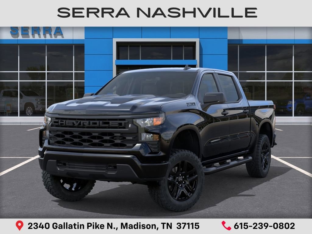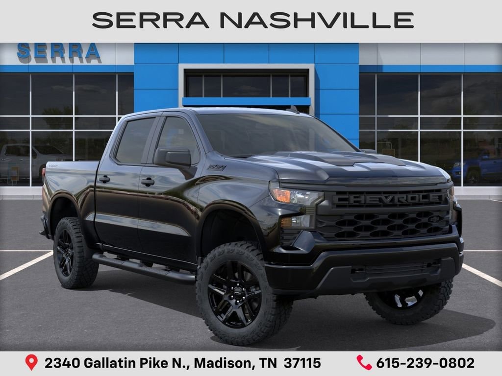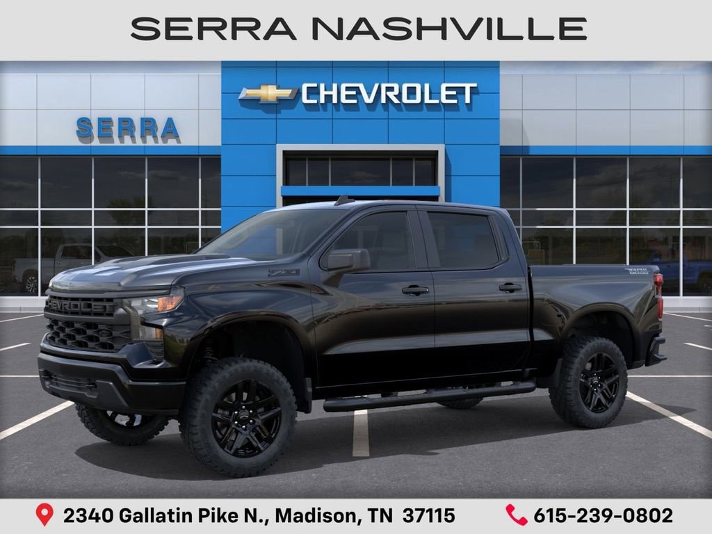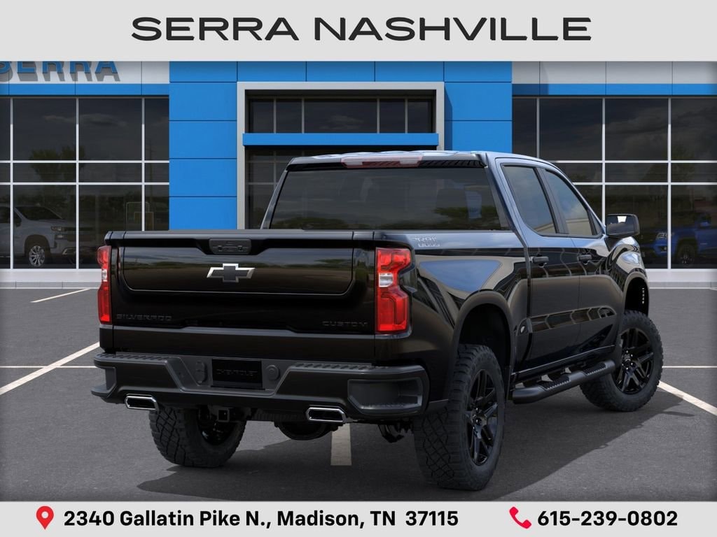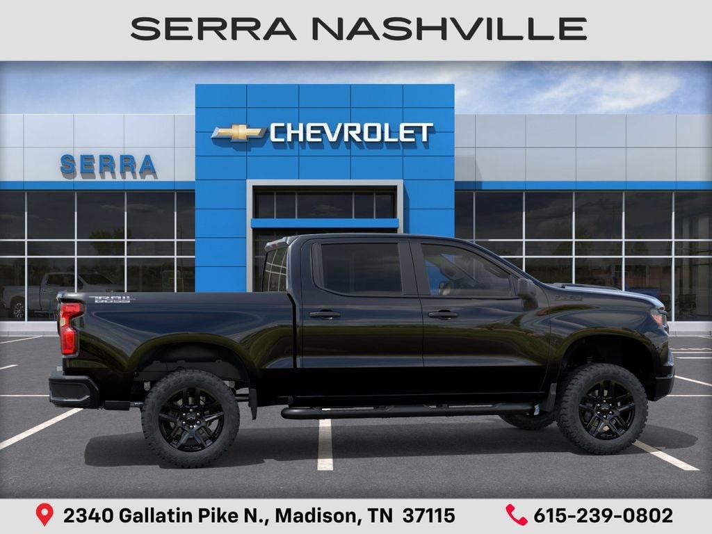 $8,518 off MSRP! 2026 Chevrolet Silverado 1500 Custom Trail Boss For sale at Serra Chevrolet Nashville - Serra Nashville has the largest selection of the new Chevrolet Silverado 1500 in Nashville. This vehicle is Black and well equipped with Custom Convenience Package (Electric Rear-Window Defogger, EZ Lift Power Lock and Release Tailgate, LED Cargo Area Lighting, Remote Vehicle Starter System, and Theft Deterrent System (unauthorized Entry)), Midnight Edition (All-Weather Floor Liner, Black Dual Exhaust Tips, Chevytec Spray-on Black Bedliner, Front Frame-Mounted Black Recovery Hooks, and Silver-Hammer Interior Trim Kit), Suspension Package (Heavy-Duty Air Filter and Hill Descent Control), Trailering Package (Hitch Guidance), 10-Speed Automatic, 4WD, Jet Black Cloth, 10-Way Power Driver Seat with Lumbar, 120-Volt Bed Mounted Power Outlet, 120-Volt Interior Power Outlet, 220 Amp Alternator, 3.5 Monochromatic Display Driver Info Center, 4-Wheel Disc Brakes, 4 Black Round Assist Steps, 40/20/40 Front Split-Bench Seat, 6 Speakers, 6-Speaker Audio System, ABS brakes, Air Conditioning, Alloy wheels, AM/FM radio: SiriusXM, Apple CarPlay/Android Auto, Auto High-beam Headlights, Auto-Locking Rear Differential, Automatic Emergency Braking, Bluetooth® For Phone, Brake assist, Cloth Seat Trim, Color-Keyed Carpeting Floor Covering, Compass, Deep-Tinted Glass, Delay-off headlights, Driver door bin, Driver vanity mirror, Dual front impact airbags, Dual front side impact airbags, Dual Rear USB Ports (charge Only), Electronic Cruise Control, Electronic Stability Control, Emergency communication system: OnStar, Following Distance Indicator, Forward Collision Alert, Front anti-roll bar, Front Center Armrest w/Storage, Front Pedestrian Braking, Front reading lights, Front Rubberized Vinyl Floor Mats, Front wheel independent suspension, Fully automatic headlights, HD Rear Vision Camera, Heated door mirrors, Illuminated entry, IntelliBeam Automatic High Beam on/Off, Lane Keep Assist with Lane Departure Warning, Low tire pressure warning, Manual Tilt Wheel Steering Column, Multi-Flex Tailgate, Occupant sensing airbag, OnStar Services Capable, Outside temperature display, Overhead airbag, Overhead console, Panic alarm, Passenger door bin, Passenger vanity mirror, Performance Red Recovery Hooks, Power door mirrors, Power driver seat, Power Front Windows with Driver Express Up/Down, Power Front Windows with Passenger Express Down, Power Rear Windows with Express Down, Power steering, Power windows, Premium audio system: Chevrolet Infotainment 3, Radio data system, Radio: Chevrolet Infotainment 3 System, Rear 60/40 Folding Bench Seat (folds Up), Rear reading lights, Rear Rubberized-Vinyl Floor Mats, Rear step bumper, Rear window defroster, Remote Keyless Entry, Remote keyless entry, Security system, Single Outlet Exhaust, SiriusXM Trial Subscription, Speed control, Speed-sensing steering, Split folding rear seat, Standard Tailgate, Tachometer, Teen Driver, Tilt steering wheel, Tire Pressure Monitoring System, Traction control, Trip computer, Variably intermittent wipers, Voltmeter, Wheels: 18 x 8.5 Black Painted Aluminum, Wheels: 20 x 9 High Gloss Black Painted Aluminum, and Wi-Fi Hot Spot Capable.