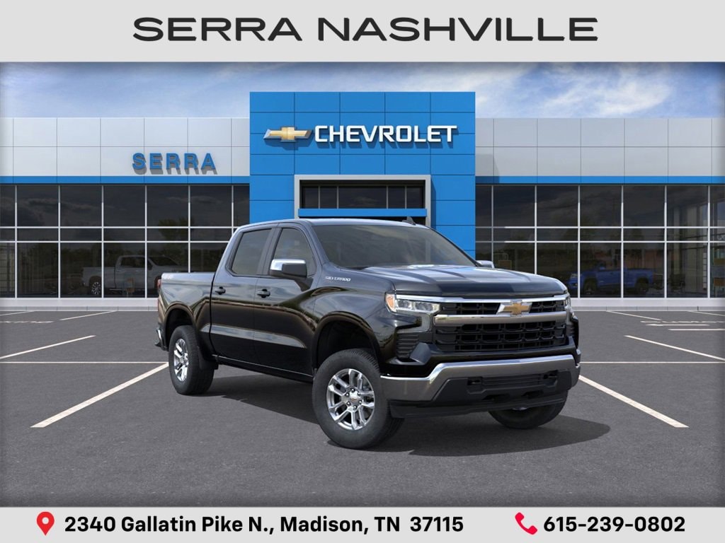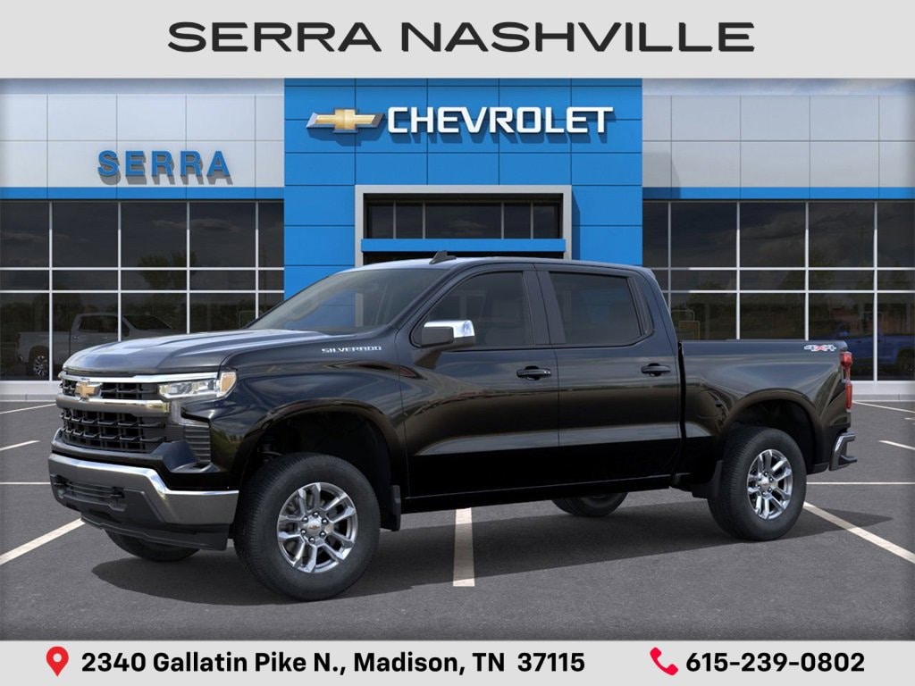 $4,000 off MSRP! Priced below KBB Fair Purchase Price! 2026 Chevrolet Silverado 1500 LT For sale at Serra Chevrolet Nashville - Serra Nashville has the largest selection of the new Chevrolet Silverado 1500 in Nashville. This vehicle is Black and well equipped with Convenience Package (120-Volt Bed Mounted Power Outlet, 120-Volt Interior Power Outlet, Dual-Zone Automatic Climate Control, Heated Steering Wheel, LED Cargo Area Lighting, Manual Tilt/Telescoping Steering Column, and Wrapped Steering Wheel), Standard Suspension Package, Trailering Package (Hitch Guidance), 8-Speed Automatic, 4WD, Jet Black Cloth, 12.3 Multicolor Reconfigurable Digital Display, 3.42 Rear Axle Ratio, 4-Wheel Disc Brakes, 40/20/40 Front Split-Bench Seat, 6 Speakers, 6-Speaker Audio System, ABS brakes, Air Conditioning, All-Star Edition, Alloy wheels, AM/FM radio: SiriusXM with 360L, Apple CarPlay/Android Auto, Auto High-beam Headlights, Auto-Locking Rear Differential, Automatic Emergency Braking, Automatic temperature control, Bluetooth® For Phone, Brake assist, Bumpers: chrome, Chrome Mirror Caps, Cloth Seat Trim, Color-Keyed Carpeting Floor Covering, Compass, Deep-Tinted Glass, Delay-off headlights, Driver door bin, Driver vanity mirror, Dual front impact airbags, Dual front side impact airbags, Electric Rear-Window Defogger, Electronic Cruise Control, Electronic Stability Control, Emergency communication system: OnStar, Following Distance Indicator, Forward Collision Alert, Front anti-roll bar, Front Center Armrest w/Storage, Front dual zone A/C, Front Frame-Mounted Black Recovery Hooks, Front Pedestrian Braking, Front reading lights, Front wheel independent suspension, Fully automatic headlights, HD Rear Vision Camera, Heated door mirrors, Heated front seats, Heated steering wheel, Illuminated entry, Integrated Trailer Brake Controller, Low tire pressure warning, Occupant sensing airbag, OnStar Services Capable, Outside temperature display, Overhead airbag, Overhead console, Panic alarm, Passenger door bin, Passenger vanity mirror, Power door mirrors, Power driver seat, Power steering, Power windows, Premium audio system: Chevrolet Infotainment 3 Premium, Radio data system, Radio: Chevrolet Infotainment 3 Premium System, Rear reading lights, Rear step bumper, Rear window defroster, Remote keyless entry, Remote Vehicle Starter System, Security system, Speed control, Speed-sensing steering, Split folding rear seat, Steering Wheel Audio Controls, Steering wheel mounted audio controls, Tachometer, Teen Driver, Telescoping steering wheel, Tilt steering wheel, Tire Pressure Monitoring System, Traction control, Trip computer, Variably intermittent wipers, Voltmeter, Wheels: 18 x 8.5 Bright Silver Painted Aluminum, and Wi-Fi Hot Spot Capable.