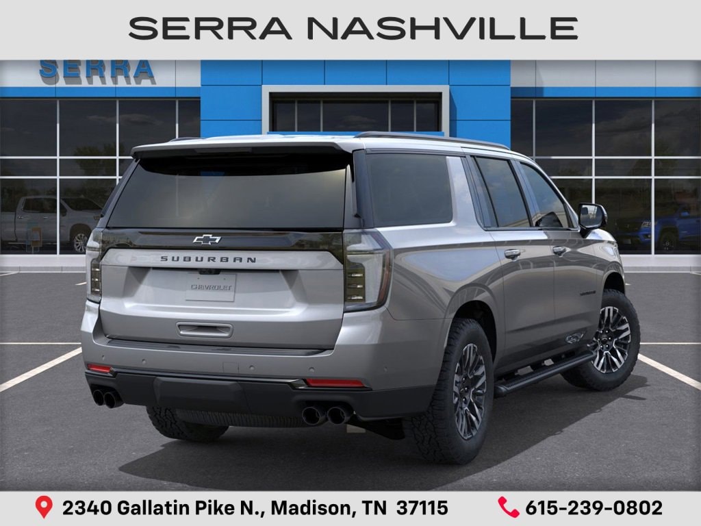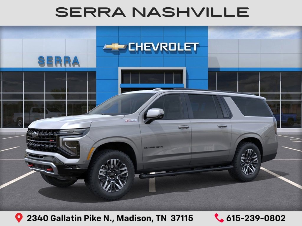 2026 Chevrolet Suburban Z71 For sale at Serra Chevrolet Nashville - Serra Nashville has the largest selection of the new Chevrolet Suburban in Nashville. This vehicle is Sterling Gray Metallic and well equipped with All-Weather Liner Protection Package (1st and 2nd Rows All-Weather Floor Liners, 3rd Row All-Weather Floor Liners, and All-Weather Cargo Mat), Comfort Package (2nd Row Power Release 60/40 Split-Folding Bench Seat, 3rd Row 60/40 Power-Folding Split-Bench, Bose 10-Speaker Surround with CenterPoint, Heated 2nd Row Outboard Seats, Heated Power-Adjustable Outside Mirrors, Heated Steering Wheel, LED Headlamps with LED Daytime Running Lamps, LED Tail Lamps, and Memory Settings), 2-Speed Active Electronic AutoTrac Transfer Case, 2-Way Driver Power Lumbar Seat Adjuster, 2-Way Front Passenger Power Lumbar Seat Adjuster, 3.23 Rear Axle Ratio, 3rd row seats: split-bench, 4-Wheel Disc Brakes, 6 Speakers, 6-Speaker Audio System, 8-Way Power Driver Seat Adjuster, 8-Way Power Front Passenger Seat Adjuster, ABS brakes, Air Conditioning, Alloy wheels, AM/FM radio: SiriusXM with 360L, Apple CarPlay/Android Auto, Auto High-beam Headlights, Auto-Dimming Inside Rear-View Mirror, Auto-dimming Rear-View mirror, Automatic temperature control, Black Tubular Assist Steps, Brake assist, Bright Front and Rear Door Sill Plates, Bumpers: body-color, Compass, Delay-off headlights, Driver door bin, Driver vanity mirror, Dual Exhaust System, Dual front impact airbags, Dual front side impact airbags, Dual-Pane Power Panoramic Sunroof, Electronic Stability Control, Emergency communication system: OnStar Services capable, Exterior Parking Camera Rear, Four wheel independent suspension, Front anti-roll bar, Front Bucket Seats, Front Center Armrest, Front dual zone A/C, Front fog lights, Front High-Approach Angle Fascia, Front LED Fog Lamps, Front reading lights, Fully automatic headlights, Garage door transmitter, Heated door mirrors, Heated Driver and Front Passenger Seats, Heated front seats, Heavy-Duty Air Filter, Hill Descent Control, Illuminated entry, Interior Camera, Leather-Appointed Seating, Low tire pressure warning, Memory seat, Memory Settings For Driver, Navigation system: Google built-in compatibility (select service plan required, terms and limitations apply), Occupant sensing airbag, Outside temperature display, Overhead airbag, Overhead console, Panic alarm, Passenger door bin, Passenger vanity mirror, Power door mirrors, Power driver seat, Power Liftgate, Power passenger seat, Power Release 2nd Row Bucket Seats, Power steering, Power windows, Premium Smooth Ride Suspension, Radio data system, Radio: 17.7 Diagonal Advanced Color LCD Display, Rain sensing wipers, Rear air conditioning, Rear anti-roll bar, Rear Power Liftgate, Rear reading lights, Rear seat center armrest, Rear window defroster, Rear window wiper, Red Recovery Hooks, Remote keyless entry, Security system, SiriusXM with 360L Trial Subscription, Speed control, Speed-sensing steering, Split folding rear seat, Spoiler, Steering wheel mounted audio controls, Tachometer, Telescoping steering wheel, Tilt steering wheel, Traction control, Trip computer, Universal Home Remote, Variably intermittent wipers, Voltmeter, Wheels: 20 x 9 Bright Machined Aluminum, Wireless Apple CarPlay/Wireless Android Auto, Wireless Phone Charging, and Z71 Exterior Features.