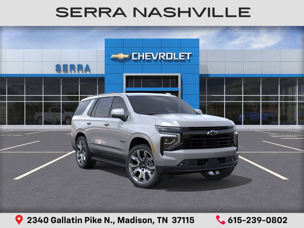 2026 Chevrolet Tahoe RST For sale at Serra Chevrolet Nashville - Serra Nashville has the largest selection of the new Chevrolet Tahoe in Nashville. This vehicle is Sterling Gray Metallic and well equipped with Advanced Trailering Package (Blind Zone Steering Assist with Trailering, Hitch View with Pan/Zoom Image Adjustment, and Smart Trailer Integration Indicator), All-Weather Liner Protection Package (1st and 2nd Rows All-Weather Floor Liners, 3rd Row All-Weather Floor Liners, and All-Weather Cargo Mat), Comfort Package (2nd Row Power Release 60/40 Split-Folding Bench Seat, 3rd Row 60/40 Power-Folding Split-Bench Seat, Bose 10-Speaker Centerpoint Surround Audio System Feature, Heated 2nd Row Outboard Seats, Heated Steering Wheel, LED Headlamps with LED Daytime Running Lamps, LED Tail Lamps, Memory Settings, and Outside Heated Power-Adjustable Mirrors), Max Trailering Package (2-Speed Active Electronic AutoTrac Transfer Case, Hill Descent Control, and Integrated Trailer Brake Controller), Preferred Equipment Group 1SP (1st and 2nd Row Color-Keyed Carpeted Floor Mats, 3-Spoke Wrapped Steering Wheel, 3rd Row Manual 60/40 Split-Folding Bench Seats, Auto-Dimming Inside Rear-View Mirror, Bright Front and Rear Door Sill Plates, Color-Keyed Carpeting Floor Covering, Dual Exhaust System, Floor Console with Storage Area, Front Bucket Seats, Front LED Fog Lamps, Frontal Driver and Outboard Passenger Airbags, Interior Camera, Key Card, Memory Settings For Driver, Rear Power Liftgate, Remote Start, RST Exterior Features, Set of 4 Wheel Locks, SiriusXM with 360L Trial Subscription, Universal Home Remote, USB Ports, Wheels: 22 x 9 Bright Machined, and Wireless Phone Charging), Premium Liner Protection Package (First and Second Rows Premium Floor Liners), RST Capability Package (Air Ride Adaptive Suspension, Floor Console, and Magnetic Ride Control Suspension), 4WD, Red Leather, 2-Way Power Driver Lumbar Seat Adjuster, 2-Way Power Front Passenger Lumbar Seat Adjuster, 3.23 Rear Axle Ratio, 3rd row seats: split-bench, 4-Wheel Disc Brakes, 6 Speakers, 6-Speaker Audio System Feature, 8-Way Power Driver Seat Adjuster, 8-Way Power Front Passenger Seat Adjuster, ABS brakes, Air Conditioning, Alloy wheels, AM/FM radio: SiriusXM with 360L, Apple CarPlay/Android Auto, Auto High-beam Headlights, Auto-dimming Rear-View mirror, Automatic temperature control, Brake assist, Bumpers: body-color, Compass, Console Mounted Safe, Delay-off headlights, Driver door bin, Driver vanity mirror, Dual front impact airbags, Dual front side impact airbags, Dual-Pane Power Panoramic Sunroof, Electronic Stability Control, Emergency communication system: OnStar and Chevrolet connected services capable, Exterior Parking Camera Rear, Extra Capacity Cooling System, Four wheel independent suspension, Front anti-roll bar, Front Center Armrest, Front dual zone A/C, Front fog lights, Front reading lights, Fully automatic headlights, Garage door transmitter, Heated door mirrors, Heated Driver and Front Passenger Seats, Heated front seats, Illuminated entry, Low tire pressure warning, Memory seat, Navigation system: Google built-in compatibility (select service plan required, terms and limitations apply), Occupant sensing airbag, Outside temperature display, Overhead airbag, Overhead console, Panic alarm, Passenger door bin, Passenger vanity mirror, Perforated Leather Seat Trim, Power door mirrors, Power driver seat, Power Liftgate, Power passenger seat, Power Release 2nd Row Bucket Seats, Power steering, Power windows, Premium audio system: Chevrolet Infotainment 3 Premium, Premium Smooth Ride Suspension, Radio data system, Radio: 17.7 Diagonal Advanced Color LCD Display, Rain sensing wipers, Rear air conditioning, Rear anti-roll bar, Rear reading lights, Rear seat center armrest, Rear window defroster, Rear window wiper, Remote keyless entry, Security system, Speed control, Speed-sensing steering, Split folding rear seat, Spoiler