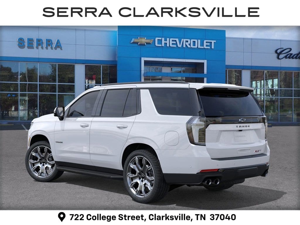 Summit White 2026 Chevrolet Tahoe RST For sale at Serra Chevrolet Clarksville is well equipped: Comfort Package (2nd Row Power Release 60/40 Split-Folding Bench Seat, 3rd Row 60/40 Power-Folding Split-Bench Seat, Bose 10-Speaker Centerpoint Surround Audio System Feature, Heated 2nd Row Outboard Seats, Heated Steering Wheel, LED Headlamps with LED Daytime Running Lamps, LED Tail Lamps, Memory Settings, and Outside Heated Power-Adjustable Mirrors), Preferred Equipment Group 1SP (1st and 2nd Row Color-Keyed Carpeted Floor Mats, 3-Spoke Wrapped Steering Wheel, 3rd Row Manual 60/40 Split-Folding Bench Seats, Auto-Dimming Inside Rear-View Mirror, Bright Front and Rear Door Sill Plates, Color-Keyed Carpeting Floor Covering, Dual Exhaust System, Floor Console with Storage Area, Front Bucket Seats, Front LED Fog Lamps, Frontal Driver and Outboard Passenger Airbags, Interior Camera, Key Card, Memory Settings For Driver, Rear Power Liftgate, Remote Start, RST Exterior Features, Set of 4 Wheel Locks, SiriusXM with 360L Trial Subscription, Universal Home Remote, USB Ports, Wheels: 22 x 9 Bright Machined, and Wireless Phone Charging), RST Capability Package (Air Ride Adaptive Suspension, Floor Console, and Magnetic Ride Control Suspension), 4WD, Jet Blk/Victory Red Perfo Leather, 2-Way Power Driver Lumbar Seat Adjuster, 2-Way Power Front Passenger Lumbar Seat Adjuster, 3.23 Rear Axle Ratio, 3rd row seats: split-bench, 4-Wheel Disc Brakes, 6 Speakers, 6-Speaker Audio System Feature, 8-Way Power Driver Seat Adjuster, 8-Way Power Front Passenger Seat Adjuster, ABS brakes, Air Conditioning, Alloy wheels, AM/FM radio: SiriusXM with 360L, Apple CarPlay/Android Auto, Auto High-beam Headlights, Auto-dimming Rear-View mirror, Automatic temperature control, Brake assist, Bumpers: body-color, Compass, Delay-off headlights, Driver door bin, Driver vanity mirror, Dual front impact airbags, Dual front side impact airbags, Dual-Pane Power Panoramic Sunroof, Electronic Stability Control, Emergency communication system: OnStar and Chevrolet connected services capable, Exterior Parking Camera Rear, Four wheel independent suspension, Front anti-roll bar, Front Center Armrest, Front dual zone A/C, Front fog lights, Front reading lights, Fully automatic headlights, Garage door transmitter, Heated door mirrors, Heated Driver and Front Passenger Seats, Heated front seats, Illuminated entry, Low tire pressure warning, Memory seat, Navigation system: Google built-in compatibility (select service plan required, terms and limitations apply), Occupant sensing airbag, Outside temperature display, Overhead airbag, Overhead console, Panic alarm, Passenger door bin, Passenger vanity mirror, Perforated Leather Seat Trim, Power door mirrors, Power driver seat, Power Liftgate, Power passenger seat, Power Release 2nd Row Bucket Seats, Power steering, Power windows, Premium audio system: Chevrolet Infotainment 3 Premium, Premium Smooth Ride Suspension, Radio data system, Radio: 17.7 Diagonal Advanced Color LCD Display, Rain sensing wipers, Rear air conditioning, Rear anti-roll bar, Rear reading lights, Rear seat center armrest, Rear window defroster, Rear window wiper, Remote keyless entry, Security system, Speed control, Speed-sensing steering, Split folding rear seat, Spoiler, Steering wheel mounted audio controls, Tachometer, Telescoping steering wheel, Tilt steering wheel, Traction control, Trip computer, Variably intermittent wipers, Voltmeter, and Wheels: 24 x 9.5 Machined.
