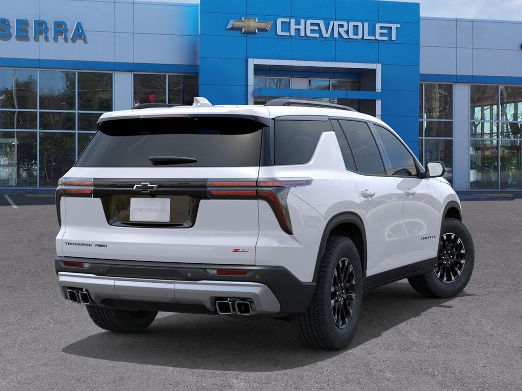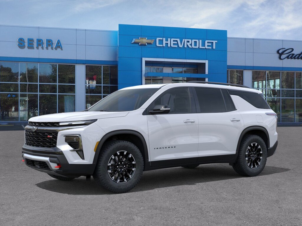 Polar White 2026 Chevrolet Traverse Z71 For sale at Serra Chevrolet Clarksville is well equipped: AWD, 3rd row seats: split-bench, 4-Way Manual Front Passenger Seat Adjuster, 4-Wheel Disc Brakes, 6 Speakers, 6-Speaker Audio System Feature, 8-Way Power Driver Seat Adjuster, ABS brakes, Air Conditioning, Alloy wheels, AM/FM radio: SiriusXM with 360L, Apple CarPlay/Android Auto, Auto High-beam Headlights, Automatic temperature control, Brake assist, Child-Seat-Sensing Airbag, Compass, Delay-off headlights, Driver door bin, Driver vanity mirror, Dual front impact airbags, Dual front side impact airbags, Electronic Stability Control, Emergency communication system: OnStar, Evotex Seat Trim, Four wheel independent suspension, Front anti-roll bar, Front Bucket Seats, Front Center Armrest, Front dual zone A/C, Front reading lights, Fully automatic headlights, Heated door mirrors, Heated Driver & Front Passenger Seats, Heated front seats, Heated steering wheel, Illuminated entry, Low tire pressure warning, Navigation System, Occupant sensing airbag, Outside temperature display, Overhead airbag, Overhead console, Panic alarm, Passenger door bin, Passenger vanity mirror, Power door mirrors, Power driver seat, Power Liftgate, Power steering, Power windows, Radio data system, Radio: Audio System w/17.7 Diagonal Display, Rear air conditioning, Rear anti-roll bar, Rear reading lights, Rear window defroster, Rear window wiper, Remote keyless entry, Security system, SiriusXM w/360L Trial Subscription, Speed control, Speed-sensing steering, Spoiler, Steering wheel mounted audio controls, Tachometer, Telescoping steering wheel, Tilt steering wheel, Traction control, Trip computer, Turn signal indicator mirrors, Variably intermittent wipers, Voltmeter, and Wheels: 18 High Gloss Black Painted Aluminum.