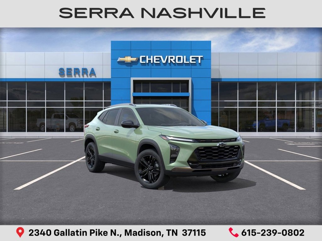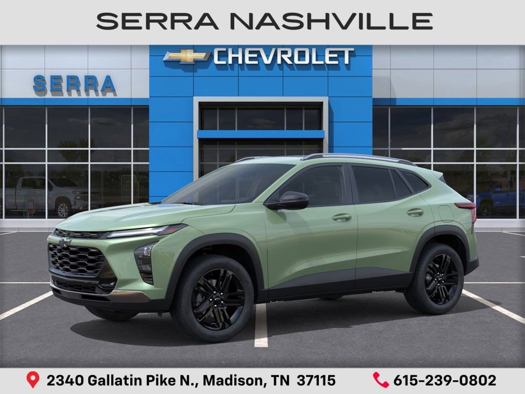 2026 Chevrolet Trax ACTIV For sale at Serra Chevrolet Nashville - Serra Nashville has the largest selection of the new Chevrolet Trax in Nashville. This vehicle is Cacti Green and well equipped with Driver Confidence Package (Adaptive Cruise Control, Lane Change Alert with Side Blind Zone Alert, Rear Cross Traffic Alert, and Rear Park Assist), Sunroof Package (Power Sliding Glass Sunroof with Manual Shade and Wireless Charging), 2-Way Adjustable Front Head Restraints, 2-Way Power Driver Lumbar Seat Adjuster, 3.50 Final Drive Axle Ratio, 4-Way Manual Front Passenger Seat Adjuster, 4-Wheel Disc Brakes, 6 Speakers, 6-Speaker Audio System Feature, 8-Way Power Driver Seat Adjuster, ABS brakes, Air Conditioning, Alloy wheels, AM/FM radio: SiriusXM, Auto High-beam Headlights, Automatic temperature control, Brake assist, Bumpers: body-color, Compass, Delay-off headlights, Driver door bin, Driver vanity mirror, Dual front impact airbags, Dual front side impact airbags, Electronic Stability Control, Emergency communication system: OnStar One Essentials, Evotex Seat Trim, Exterior Parking Camera Rear, Front and Rear Jet Black All-Weather Floor Liners, Front anti-roll bar, Front Bucket Seats, Front Center Armrest, Front reading lights, Front wheel independent suspension, Fully automatic headlights, Heated door mirrors, Heated Driver and Front Passenger Seats, Heated front seats, Heated steering wheel, Illuminated entry, Leather steering wheel, Low tire pressure warning, Occupant sensing airbag, Outside temperature display, Overhead airbag, Overhead console, Panic alarm, Passenger door bin, Passenger vanity mirror, Power door mirrors, Power driver seat, Power steering, Power windows, Premium audio system: Chevrolet Infotainment 3, Radio data system, Radio: AM/FM Stereo Audio System, Rear window defroster, Rear window wiper, Remote keyless entry, Security system, SiriusXM Trial Subscription, Speed control, Split folding rear seat, Spoiler, Steering wheel mounted audio controls, Tachometer, Telescoping steering wheel, Tilt steering wheel, Traction control, Trip computer, Variably intermittent wipers, Wheels: 18 Black-Painted Aluminum, and Wireless Apple CarPlay/Wireless Android Auto.
