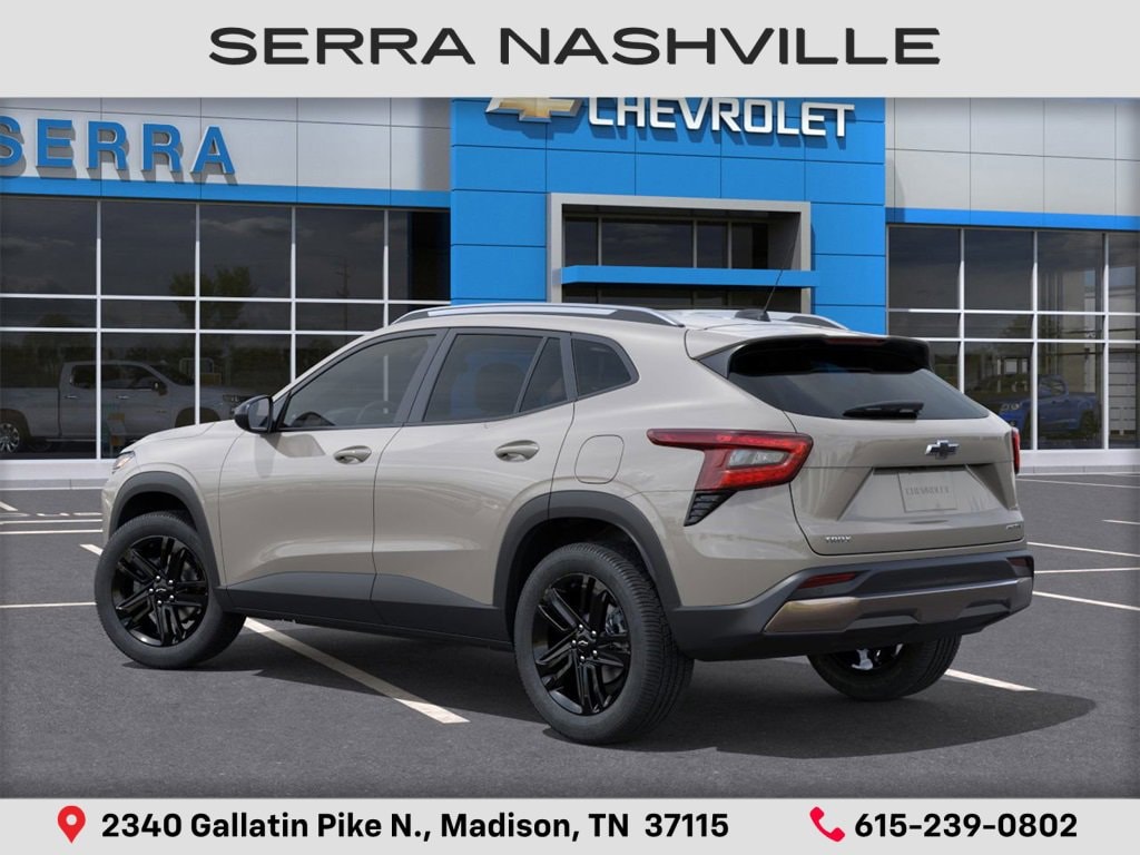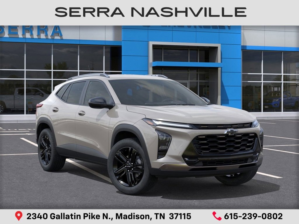White Sands 2026 Chevrolet Trax ACTIV For sale at Serra Chevrolet Nashville and well equipped: Driver Confidence Package (Adaptive Cruise Control, Lane Change Alert w/Side Blind Zone Alert, Rear Cross Traffic Alert, and Rear Park Assist), 2-Way Adjustable Front Head Restraints, 2-Way Power Driver Lumbar Seat Adjuster, 3.50 Final Drive Axle Ratio, 4-Way Manual Front Passenger Seat Adjuster, 4-Wheel Disc Brakes, 6 Speakers, 6-Speaker Audio System Feature, 8-Way Power Driver Seat Adjuster, ABS brakes, Air Conditioning, Alloy wheels, AM/FM radio: SiriusXM, Auto High-beam Headlights, Automatic temperature control, Brake assist, Bumpers: body-color, Compass, Delay-off headlights, Driver door bin, Driver vanity mirror, Dual front impact airbags, Dual front side impact airbags, Electronic Stability Control, Emergency communication system: OnStar One Essentials, Evotex Seat Trim, Exterior Parking Camera Rear, Front & Rear Jet Black All-Weather Floor Liners (LPO), Front anti-roll bar, Front Bucket Seats, Front Center Armrest, Front reading lights, Front wheel independent suspension, Fully automatic headlights, Heated door mirrors, Heated Driver & Front Passenger Seats, Heated front seats, Heated steering wheel, Illuminated entry, Leather steering wheel, Low tire pressure warning, Occupant sensing airbag, Outside temperature display, Overhead airbag, Overhead console, Panic alarm, Passenger door bin, Passenger vanity mirror, Power door mirrors, Power driver seat, Power steering, Power windows, Premium audio system: Chevrolet Infotainment 3, Radio data system, Radio: AM/FM Stereo Audio System, Rear window defroster, Rear window wiper, Remote keyless entry, Security system, SiriusXM Trial Subscription, Speed control, Split folding rear seat, Spoiler, Steering wheel mounted audio controls, Tachometer, Telescoping steering wheel, Tilt steering wheel, Traction control, Trip computer, Variably intermittent wipers, Wheels: 18 Black-Painted Aluminum, and Wireless Apple CarPlay/Wireless Android Auto.