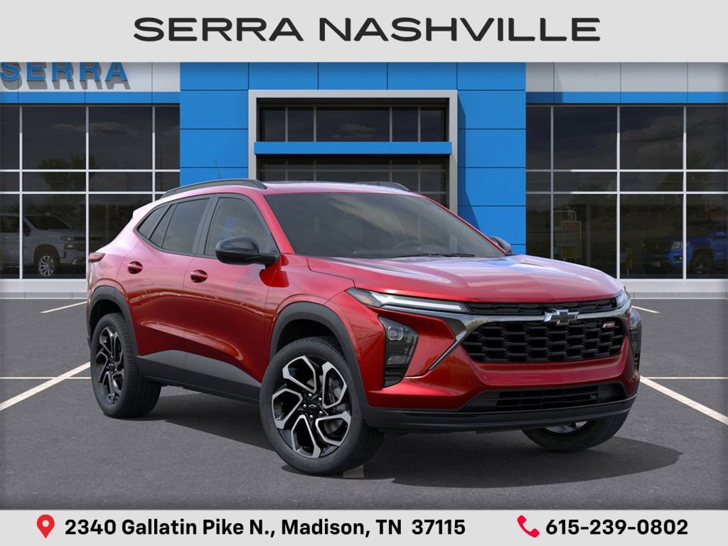 Apex Red 2026 Chevrolet Trax 2RS For sale at Serra Chevrolet Nashville and well equipped: Driver Confidence Package (Adaptive Cruise Control, Lane Change Alert w/Side Blind Zone Alert, Rear Cross Traffic Alert, and Rear Park Assist), Sunroof Package (Power Sliding Glass Sunroof w/Manual Shade and Wireless Charging), 2-Way Adjustable Front Head Restraints, 2-Way Power Driver Lumbar Seat Adjuster, 3.50 Final Drive Axle Ratio, 4-Way Manual Front Passenger Seat Adjuster, 4-Wheel Disc Brakes, 6 Speakers, 6-Speaker Audio System Feature, 8-Way Power Driver Seat Adjuster, ABS brakes, Air Conditioning, Alloy wheels, AM/FM radio: SiriusXM, Auto High-beam Headlights, Automatic temperature control, Brake assist, Bumpers: body-color, Compass, Delay-off headlights, Driver door bin, Driver vanity mirror, Dual front impact airbags, Dual front side impact airbags, Electronic Stability Control, Emergency communication system: OnStar One Essentials, Evotex Seat Trim, Exterior Parking Camera Rear, Front & Rear Jet Black All-Weather Floor Liners (LPO), Front anti-roll bar, Front Bucket Seats, Front Center Armrest, Front reading lights, Front wheel independent suspension, Fully automatic headlights, Heated door mirrors, Heated Driver & Front Passenger Seats, Heated front seats, Heated steering wheel, Illuminated entry, Leather steering wheel, Low tire pressure warning, Occupant sensing airbag, Outside temperature display, Overhead airbag, Overhead console, Panic alarm, Passenger door bin, Passenger vanity mirror, Power door mirrors, Power driver seat, Power steering, Power windows, Premium audio system: Chevrolet Infotainment 3, Radio data system, Radio: AM/FM Stereo Audio System, Rear window defroster, Rear window wiper, Remote keyless entry, Security system, SiriusXM Trial Subscription, Speed control, Split folding rear seat, Spoiler, Sport steering wheel, Steering wheel mounted audio controls, Tachometer, Telescoping steering wheel, Tilt steering wheel, Traction control, Trip computer, Variably intermittent wipers, Wheels: 19 Black-Painted Machined Aluminum, and Wireless Apple CarPlay/Wireless Android Auto.