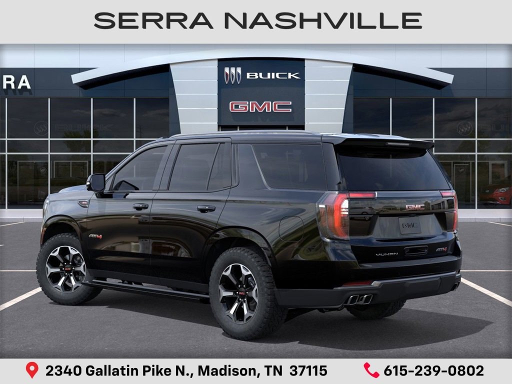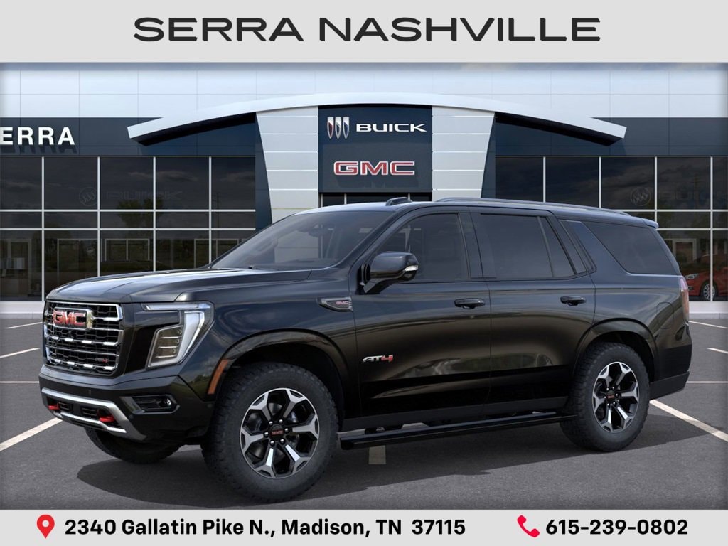 2026 GMC Yukon AT4 For sale at Serra GMC Nashville - Serra Nashville has the largest selection of the new GMC Yukon in Nashville. This vehicle is Onyx Black and well equipped with Floor Liner Package (1st and 2nd Rows All-Weather Floor Liners, 3rd Row All-Weather Floor Liners, and All-Weather Cargo Mat), 4WD, 10 Speakers, 3.23 Rear Axle Ratio, 3rd row seats: split-bench, 4-Way Power Driver Lumbar Seat Adjuster, 4-Way Power Front Passenger Lumbar Seat Adjuster, 4-Wheel Disc Brakes, ABS brakes, Adaptive suspension, Air Conditioning, Alloy wheels, AM/FM radio: SiriusXM with 360L, Apple CarPlay/Android Auto, Audio memory, Auto High-beam Headlights, Auto-dimming door mirrors, Auto-dimming Rear-View mirror, Auto-leveling suspension, Automatic temperature control, AutoSense Hands-Free Power Liftgate, Black Roof-Mounted Luggage Rack Side Rails, Body-Color Door Handles, Bose 10-Speaker Surround with CenterPoint, Brake assist, Bright Front and Rear Door Sill Plates, Bumpers: body-color, Compass, Delay-off headlights, Driver door bin, Driver vanity mirror, Dual Exhaust System, Dual front impact airbags, Dual front side impact airbags, Electronic Stability Control, Emergency communication system: OnStar and GMC connected services capable, Exterior Parking Camera Rear, Four wheel independent suspension, Front anti-roll bar, Front Bucket Seats, Front Center Armrest, Front dual zone A/C, Front fog lights, Front High-Approach Angle Fascia, Front reading lights, Fully automatic headlights, Garage door transmitter, Heated door mirrors, Heated Driver and Front Passenger Seats, Heated front seats, Heated rear seats, Heated steering wheel, Heavy-Duty Air Filter, Hill Descent Control, Illuminated entry, Low tire pressure warning, Magnetic Ride Control Suspension, Memory seat, Navigation system: GMC Connected Navigation, Occupant sensing airbag, Outside temperature display, Overhead airbag, Overhead console, Panic alarm, Passenger door bin, Passenger vanity mirror, Perforated Heather and Ventilated Driver and Front Passenger Seats, Perforated Leather Seating Surfaces, Power door mirrors, Power driver seat, Power Liftgate, Power passenger seat, Power steering, Power Tilt and Telescopic Steering Column, Power windows, Radio: 16.8 Diagonal Premium GMC Infotainment System, Rain sensing wipers, Rear air conditioning, Rear anti-roll bar, Rear reading lights, Rear seat center armrest, Rear window defroster, Rear window wiper, Red Horizontal-Mounted Recovery Hooks, Remote keyless entry, Security system, SiriusXM with 360L, Speed control, Speed-sensing steering, Split folding rear seat, Spoiler, Steering wheel memory, Steering wheel mounted audio controls, Tachometer, Telescoping steering wheel, Tilt steering wheel, Traction control, Trip computer, Turn signal indicator mirrors, Variably intermittent wipers, Ventilated front seats, Voltmeter, and Wheels: 20 x 9 Machined and Painted.