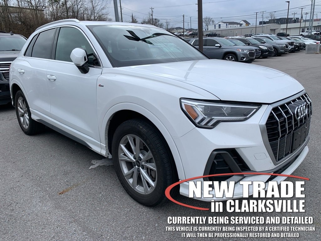 The Pre-Owned 2023 Audi Q3 Premium with 2.0L 4-Cylinder TFSI at Serra Clarksville. Well equipped: 10 Speakers, 3.533 Axle Ratio, 4-Wheel Disc Brakes, ABS brakes, Air Conditioning, Alloy wheels, AM/FM radio, Audi smartphone interface (Apple CarPlay/Android Auto), Auto High-beam Headlights, Automatic temperature control, Brake assist, Bumpers: body-color, Delay-off headlights, Driver door bin, Driver vanity mirror, Dual front impact airbags, Dual front side impact airbags, Electronic Stability Control, Emergency communication system: Audi connect CARE, Exterior Parking Camera Rear, Four wheel independent suspension, Front anti-roll bar, Front Bucket Seats, Front Center Armrest, Front dual zone A/C, Front fog lights, Front reading lights, Fully automatic headlights, Heated door mirrors, Heated Front Bucket Seats, Heated front seats, Illuminated entry, Knee airbag, Leather Seating Surfaces, Leather Shift Knob, Leather steering wheel, Low tire pressure warning, Occupant sensing airbag, Outside temperature display, Overhead airbag, Overhead console, Panic alarm, Passenger door bin, Passenger vanity mirror, Power door mirrors, Power driver seat, Power Liftgate, Power moonroof: Panoramic, Power passenger seat, Power steering, Power windows, Radio data system, Radio: Audi Sound System, Rain sensing wipers, Rear air conditioning, Rear anti-roll bar, Rear fog lights, Rear reading lights, Rear seat center armrest, Rear window defroster, Rear window wiper, Remote keyless entry, Speed control, Speed-sensing steering, Split folding rear seat, Spoiler, Steering wheel mounted audio controls, Tachometer, Telescoping steering wheel, Tilt steering wheel, Traction control, Trip computer, Turn signal indicator mirrors, Variably intermittent wipers, and Wheels: 18 5-V-Spoke-S Design.