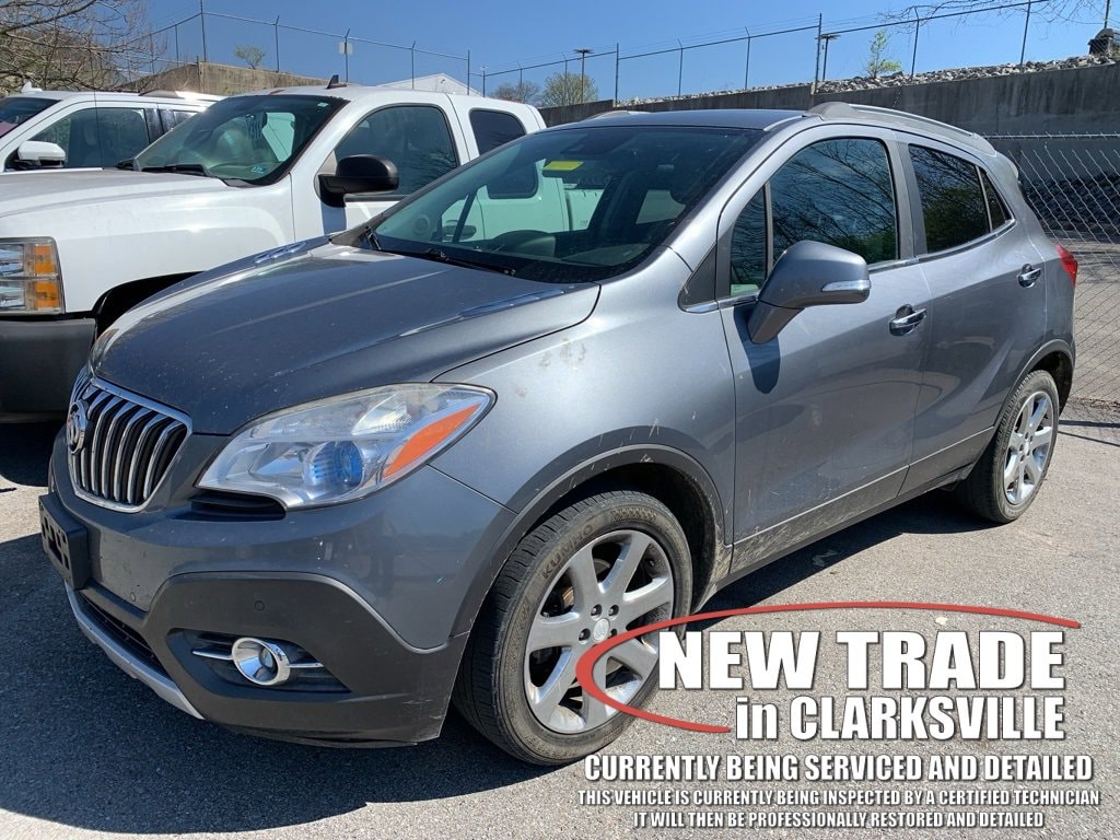 The Pre-Owned 2014 Buick Encore Premium with ECOTEC 1.4L I4 SMPI DOHC Turbocharged VVT at Serra Clarksville. Well equipped: 1SN Equipment Group (120-Volt Power Outlet, Auto-Dimming Inside Rear-View Mirror, Bose Premium 7-Speaker Audio System Feature, Carpeted Load Floor Mat, Dual-Zone Automatic Climate Control, Forward Collision Alert, Front Fog Lamps, Lane Departure Warning System, Rainsense Intermittent Front Wipers, Rear Cargo Net, Remote Vehicle Starter System, and Ultrasonic Front & Rear Park Assist), 18 Chromed Aluminum Wheels, 3.53 Final Drive Ratio, 4-Wheel Disc Brakes, 7 Speakers, ABS brakes, Air Conditioning, Alloy wheels, AM/FM radio: SiriusXM, Auto-dimming Rear-View mirror, Automatic temperature control, Brake assist, Bumpers: body-color, CD player, Compass, Delay-off headlights, Driver door bin, Driver vanity mirror, Driver's Seat Mounted Armrest, Dual front impact airbags, Dual front side impact airbags, Electronic Stability Control, Emergency communication system: OnStar Directions & Connections, Exterior Parking Camera Rear, Front anti-roll bar, Front Bucket Seats, Front dual zone A/C, Front fog lights, Front reading lights, Front wheel independent suspension, Fully automatic headlights, Heated door mirrors, Heated Driver & Front Passenger Seats, Heated front seats, Heated steering wheel, Illuminated entry, Knee airbag, Leather steering wheel, Leather-Appointed Seat Trim, Low tire pressure warning, Memory seat, Occupant sensing airbag, Outside temperature display, Overhead airbag, Panic alarm, Passenger door bin, Passenger vanity mirror, Power door mirrors, Power driver seat, Power passenger seat, Power steering, Power Tilt-Sliding Sunroof, Power windows, Premium audio system: IntelliLink, Radio data system, Radio: AM/FM Audio System w/MP3 CD Player, Radio: AM/FM Audio System w/Nav/Single CD Player, Rain sensing wipers, Rear seat center armrest, Rear side impact airbag, Rear window defroster, Rear window wiper, Remote keyless entry, Ride & Handling Suspension, Roof rack: rails only, Security system, SiriusXM Satellite Radio, Speed control, Speed-sensing steering, Split folding rear seat, Spoiler, Steering wheel mounted audio controls, Tachometer, Telescoping steering wheel, Tilt steering wheel, Traction control, Trip computer, Turn signal indicator mirrors, Variably intermittent wipers, and Wheels: 18 Painted Cast Aluminum.