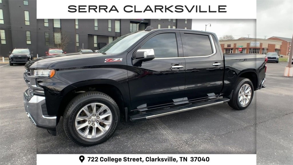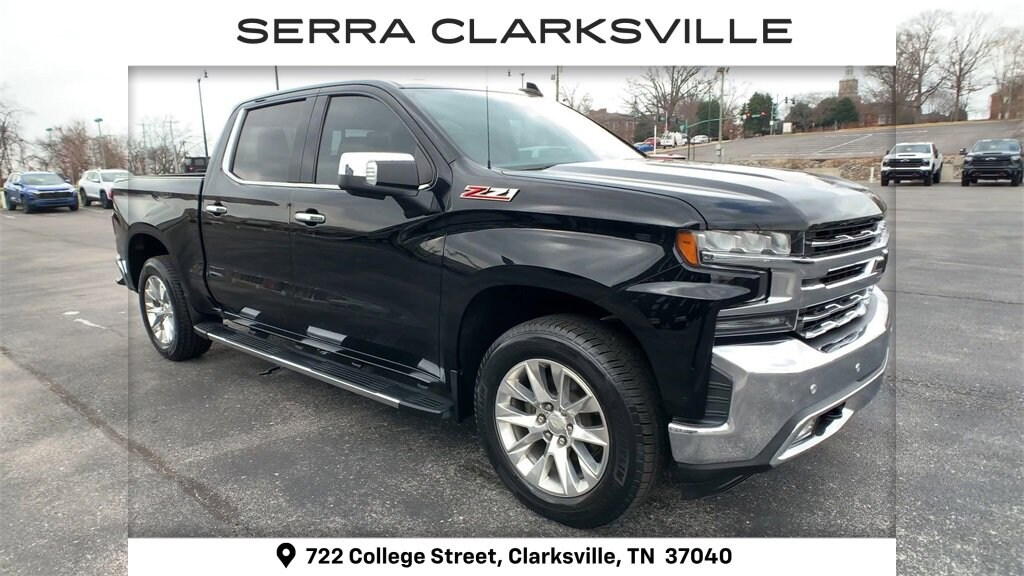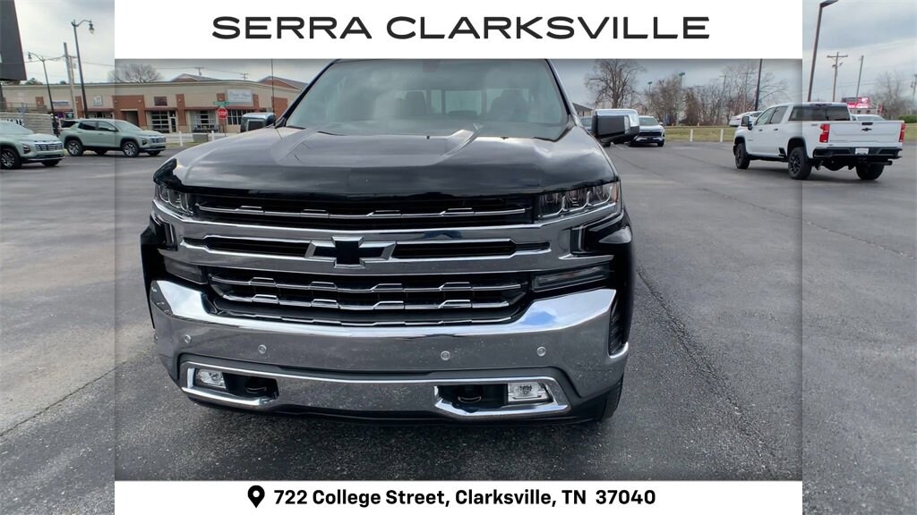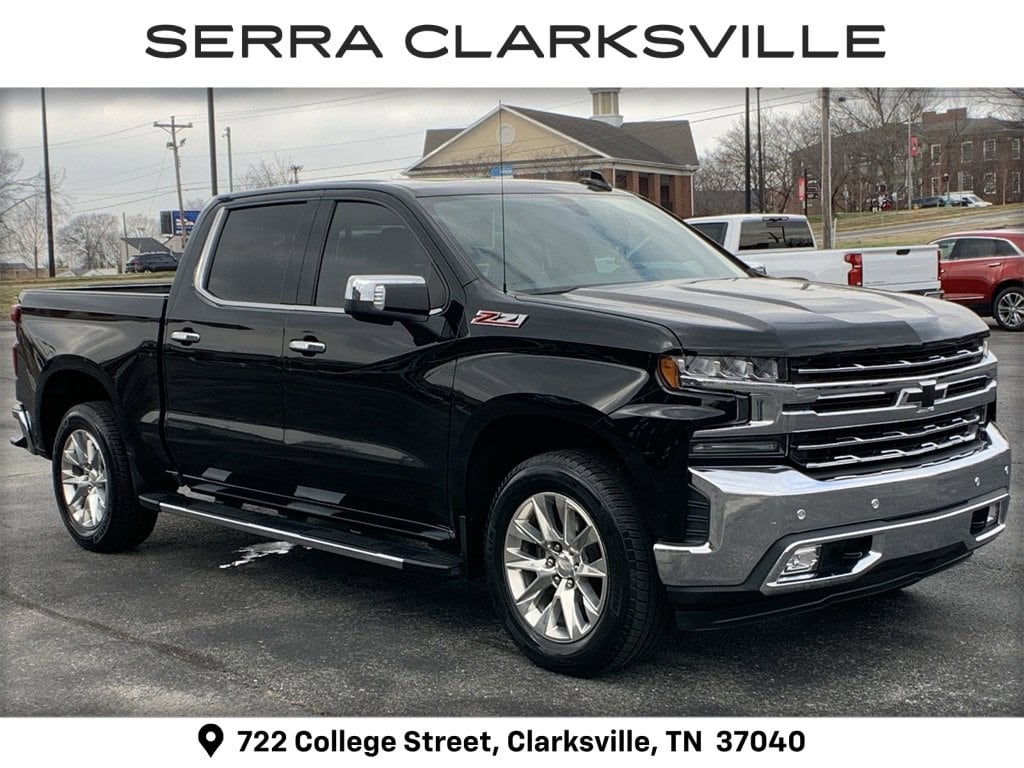 The Pre-Owned 2019 Chevrolet Silverado 1500 LTZ with EcoTec3 5.3L V8 at Serra Clarksville. Well equipped: LTZ Convenience Package (2 USB Ports (First Row), 2nd Row Heated Outboard Seats, Floor Mounted Console, Front Bucket Seats, Power Sliding Rear Window w/Rear Defogger, Power Tailgate, Universal Home Remote, and Ventilated Driver & Front Passenger Seats), LTZ Convenience Package II (Premium Bose 7-Speaker Sound System, Radio: Chevrolet Infotainment 3 Premium System, and Wireless Charging), LTZ Plus Package, Preferred Equipment Group 1LZ (10-Way Power Driver Seat w/Lumbar, 10-Way Power Passenger Seat Adjuster w/Lumbar, 12-Volt Rear Auxiliary Power Outlet, 120-Volt Bed Mounted Power Outlet, 120-Volt Instrument Panel Power Outlet, 170 Amp Alternator, 4.2 Diagonal Color Display Driver Info Center, 6-Speaker Audio System, Advanced Trailering System, Auto-Dimming Inside Rear-View Mirror, Auxiliary External Transmission Oil Cooler, Bluetooth® For Phone, Chevrolet Connected Access, Chevrolet w/4G LTE, Chrome Grille, Chrome Mirror Caps, Color-Keyed Carpeting Floor Covering, Compass, Deep-Tinted Glass, Driver Memory, Electric Rear-Window Defogger, Electrical Lock Control Steering Column, Electronic Cruise Control, EZ Lift Power Lock & Release Tailgate, Front Frame-Mounted Black Recovery Hooks, Front LED Fog Lamps, Front Rubberized Vinyl Floor Mats, HD Radio, HD Rear Vision Camera, Heated Driver & Front Passenger Seats, Heated Steering Wheel, Heavy-Duty Rear Locking Differential, Hitch Guidance, Hitch Guidance w/Hitch View, Integrated Trailer Brake Controller, Keyless Open & Start, Leather Wrapped Steering Wheel, LED Cargo Area Lighting, Manual Tilt/Telescoping Steering Column, OnStar & Chevrolet Connected Services Capable, Outside Heated Power-Adjustable Mirrors, Power Door Locks, Power Front Passenger Windows w/Express Up/Down, Power Front Windows w/Driver Express Up/Down, Power Rear Windows w/Express Down, Rear Dual USB Charging-Only Ports, Rear Rubberized-Vinyl Floor Mats, Rear Wheelhouse Liners, Remote Vehicle Starter System, SiriusXM Radio, Steering Wheel Audio Controls, Theft Deterrent System (Unauthorized Entry), and Trailer Tire Pressure Monitor System), Safety Package (Lane Change Alert w/Side Blind Zone Alert, Perimeter Lighting, Rear Cross Traffic Alert, and Ultrasonic Front & Rear Park Assist), Trailering Package, Up-Level Rear Seat w/Storage Package, Z71 Off-Road Package (Hill Descent Control and Off-Road Suspension), 8-Speed Automatic, 4WD, Jet Black Leather, 3.23 Rear Axle Ratio, 4-Wheel Disc Brakes, 40/20/40 Front Split-Bench Seat, 6 Speakers, ABS brakes, Air Conditioning, All-Weather Floor Liner (LPO) (AAK), Alloy wheels, AM/FM radio: SiriusXM, Apple CarPlay/Android Auto, Auto-dimming door mirrors, Auto-dimming Rear-View mirror, Automatic temperature control, Brake assist, Bumpers: chrome, Chrome Assist Steps, Delay-off headlights, Driver door bin, Driver vanity mirror, Dual Exhaust w/Polished Outlets, Dual front impact airbags, Dual front side impact airbags, Electronic Stability Control, Front anti-roll bar, Front Black Bowtie Emblem (LPO), Front Center Armrest w/Storage, Front dual zone A/C, Front fog lights, Front reading lights, Front wheel independent suspension, Fully automatic headlights, Heated door mirrors, Heated front seats, Heated steering wheel, Heavy Duty Suspension, High Capacity Air Filter, Illuminated entry, Low tire pressure warning, Memory seat, Occupant sensing airbag, Outside temperature display, Overhead airbag, Overhead console, Panic alarm, Passenger door bin, Passenger vanity mirror, Perforated Leather Appointed Seat Trim, Power door mirrors, Power driver seat, Power passenger seat, Power steering, Power Sunroof, Power windows, Premium audio system: Chevrolet Infotainment System 3, Radio data system, Radio: Chevrolet Infotainment 3 Plus System, Rear reading lights,