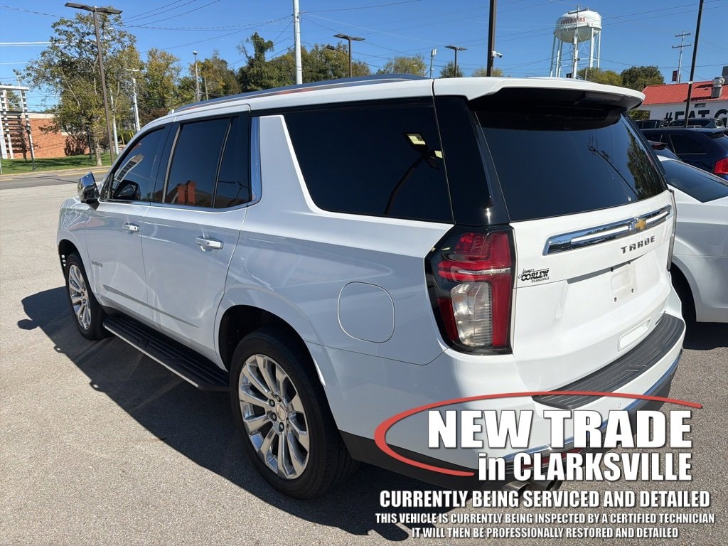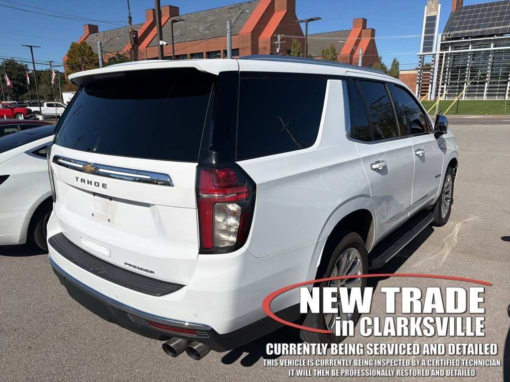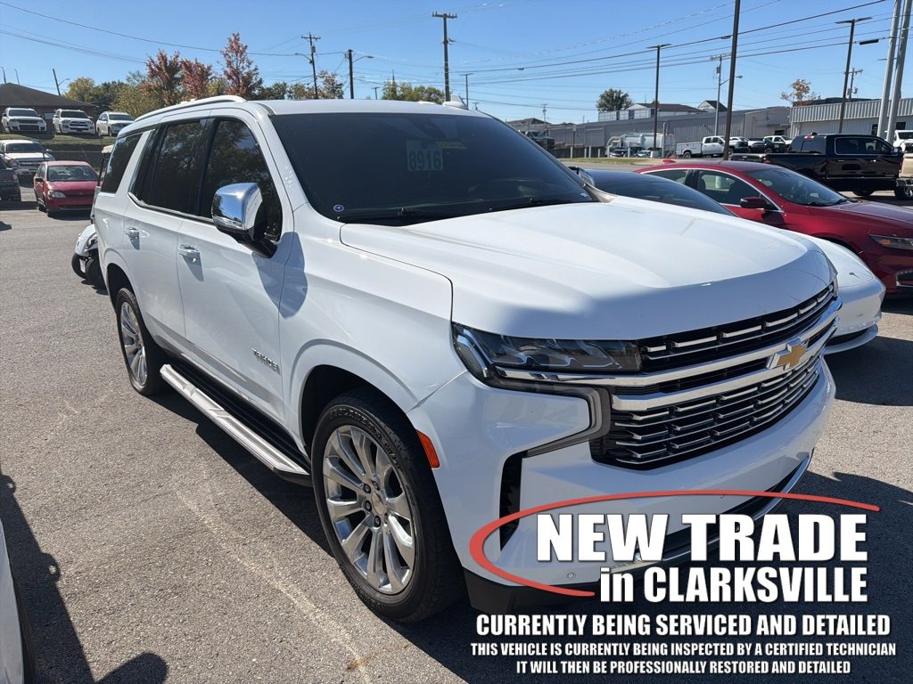 One-owner local new car trade-in! Clean CARFAX. The Pre-Owned 2021 Chevrolet Tahoe Premier with EcoTec3 5.3L V8 at Serra Clarksville. Well equipped: Enhanced Display & Alert Package (15 Diagonal Multi-Color Head-Up Display, HD Surround Vision, Inside Rearview Auto-Dimming Rear Camera Mirror, Rear Camera Mirror Washer, and Rear Pedestrian Alert), Preferred Equipment Group 1LZ (1st & 2nd Row Color-Keyed Carpeted Floor Mats, 2 USB Data Ports, 2-Speed Active Electronic AutoTrac Transfer Case, 3rd Row 60/40 Power-Folding Split-Bench Seat, Auto-Dimming Inside Rear-View Mirror, Automatic Heated Steering Wheel, Bright Front & Rear Door Sill Plates, Chrome Door Handles w/Body-Color Strip, Chrome Mirror Caps, Color-Keyed Carpeting Floor Covering, Driver & Front Outboard Passenger Airbags, Dual Exhaust System, Enhanced Driver Information Center, Floor Console w/Storage Area, Front & Rear Park Assist, Hands-Free Rear Power Programmable Liftgate, HD Radio, Heated 2nd Row Outboard Seats, Hill Descent Control, Infotainment Display, Lane Change Alert w/Side Blind Zone Alert, Lane Keep Assist w/Lane Departure Warning, Leather-Wrapped Steering Wheel, LED Daytime Running Lamps, Memory Settings, Outside Heated Power-Adjustable Mirrors, Power Release 2nd Row Bucket Seats, Power Tilt & Telescopic Steering Column, Rear Cross Traffic Alert, Remote Start, Safety Alert Seat, SiriusXM NavTraffic, SiriusXM Radio w/360L, and Universal Home Remote), 4WD, Jet Black/Maple Sugar Leather, 10 Speakers, 12-Way Power Driver & Passenger Seat Adjusters, 20 x 9 Polished Aluminum Wheels, 3.23 Rear Axle Ratio, 3rd row seats: split-bench, 4-Wheel Disc Brakes, ABS brakes, Adaptive Cruise Control, Adaptive suspension, Air Conditioning, Alloy wheels, AM/FM radio: SiriusXM with 360L, Apple CarPlay/Android Auto, Auto High-beam Headlights, Auto-dimming door mirrors, Auto-dimming Rear-View mirror, Auto-leveling suspension, Automatic temperature control, Bose 10-Speaker Centerpoint Surround Audio Sys Ft, Brake assist, Bumpers: body-color, Compass, Delay-off headlights, Driver door bin, Driver vanity mirror, Dual front impact airbags, Dual front side impact airbags, Dual-Pane Power Panoramic Sunroof, Electronic Stability Control, Emergency communication system: OnStar and Chevrolet connected services capable, Enhanced Automatic Emergency Braking, Four wheel independent suspension, Front anti-roll bar, Front Bucket Seats, Front Center Armrest, Front dual zone A/C, Front High-Back Reclining Bucket Seats, Front reading lights, Fully automatic headlights, Garage door transmitter, Heated & Ventilated Driver & Front Passenger Seats, Heated door mirrors, Heated Driver & Front Passenger Seats, Heated front seats, Heated rear seats, Heated steering wheel, Illuminated entry, Leather steering wheel, Low tire pressure warning, Magnetic Ride Control Suspension, Memory seat, Navigation System, Occupant sensing airbag, Outside temperature display, Overhead airbag, Overhead console, Panic alarm, Passenger door bin, Passenger vanity mirror, Perforated Leather Seat Trim, Power door mirrors, Power driver seat, Power Liftgate, Power passenger seat, Power steering, Power windows, Premium audio system: Chevrolet Infotainment 3, Radio: Chevrolet Infotainment 3 Premium System, Rain sensing wipers, Rear air conditioning, Rear anti-roll bar, Rear reading lights, Rear Seat Media System, Rear window defroster, Rear window wiper, Remote keyless entry, Roof rack: rails only, Security system, Set of 4 Wheel Locks (LPO), Speed control, Speed-sensing steering, Split folding rear seat, Spoiler, Steering wheel memory, Steering wheel mounted audio controls, Tachometer, Telescoping steering wheel, Tilt steering wheel, Traction control, Trip computer, Turn signal indicator mirrors, Variably intermittent wipers, Ventilated front seats, Voltmeter, and Wheels: 22 x 9 Polished Aluminum.