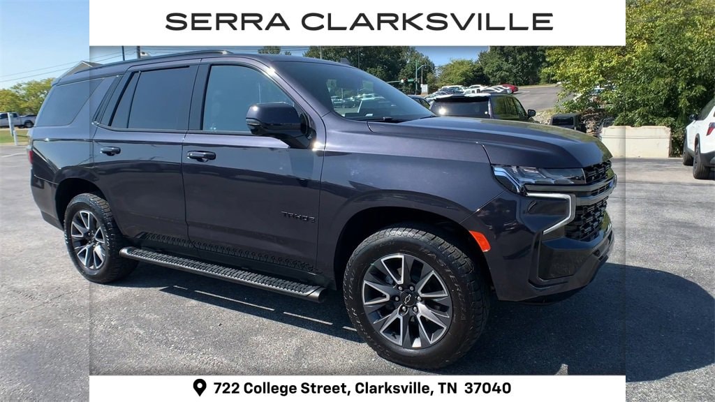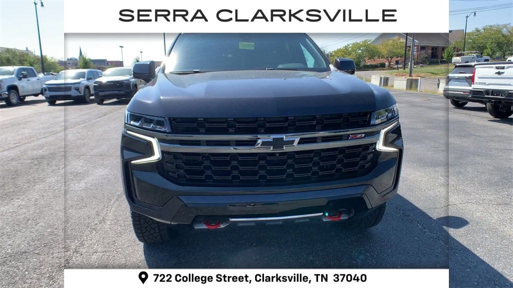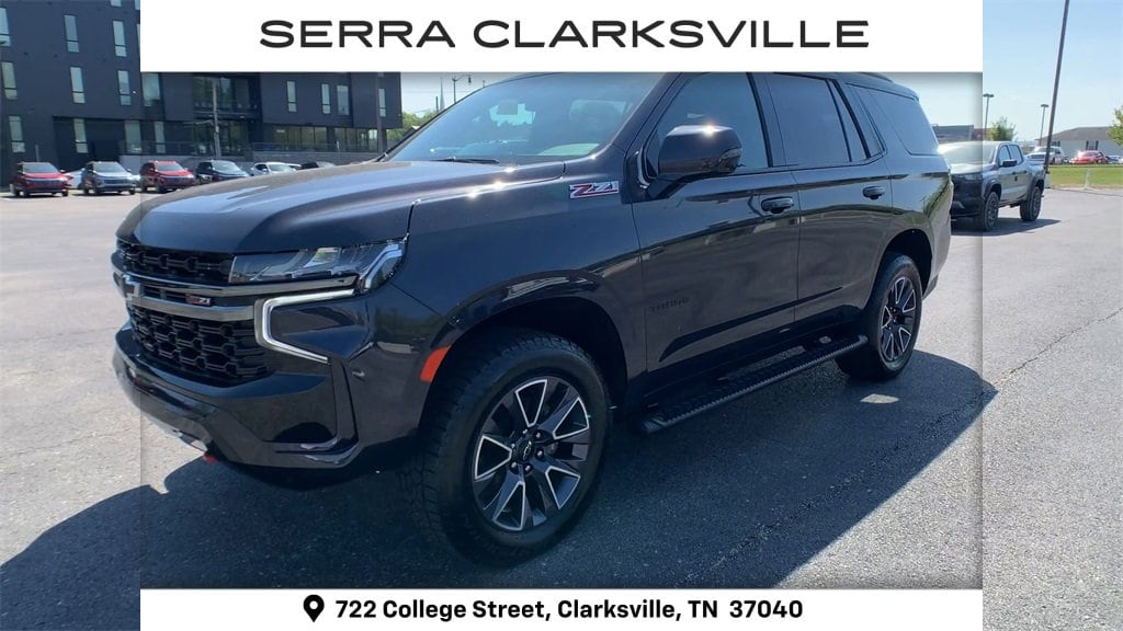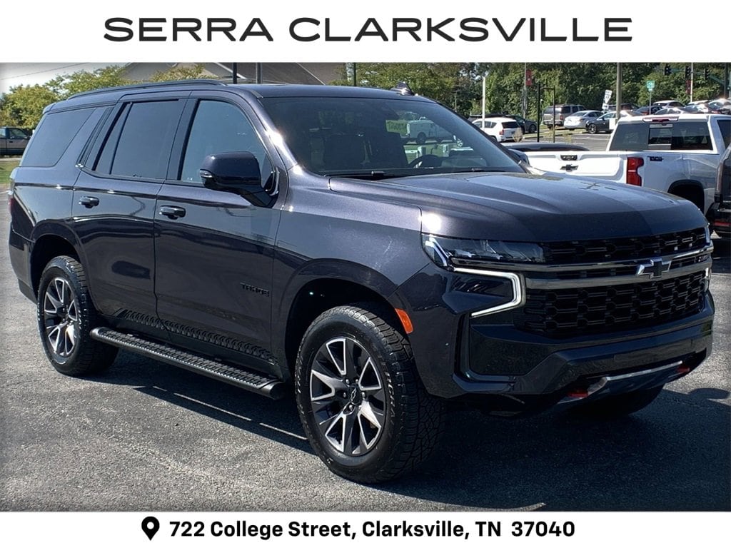 One-owner local new car trade-in! The Pre-Owned 2022 Chevrolet Tahoe Z71 with EcoTec3 5.3L V8 at Serra Clarksville. Well equipped: Advanced Trailering Package (Hitch Guidance w/Hitch View, Integrated Trailer Brake Controller, and Smart Trailer Integration Indicator), Driver Alert Package (Lane Change Alert w/Side Blind Zone Alert and Rear Cross Traffic Alert), Luxury Package (2nd Row Pwr Release 60/40 Split-Folding Bench Seat, 3rd Row 60/40 Power-Folding Split-Bench Seat, HD Surround Vision, Heated 2nd Row Outboard Seats, Heated Steering Wheel, Memory Settings, Outside Heated Power-Adjustable Mirrors, Power Tilt & Telescopic Steering Column, and Rear Pedestrian Alert), Max Trailering Package (Extra Capacity Cooling System), Off-Road Capability Package (Air Ride Adaptive Suspension, Electronic Limited-Slip Differential, and Magnetic Ride Control Suspension), Preferred Equipment Group 2Z7 (1st & 2nd Row Color-Keyed Carpeted Floor Mats, 2-Speed Active Electronic AutoTrac Transfer Case, Auto-Dimming Inside Rear-View Mirror, Automatic Stop/Start, Black Tubular Assist Steps, Bose 9-Speaker Stereo Audio System Feature, Bright Front & Rear Door Sill Plates, Color-Keyed Carpeting Floor Covering, Driver & Front Outboard Passenger Airbags, Enhanced Driver Information Center, Floor Console w/Storage Area, Front High-Approach Angle Fascia, Hands-Free Rear Power Programmable Liftgate, Hill Descent Control, Infotainment Display, Leather-Wrapped Steering Wheel, LED Daytime Running Lamps, Memory Settings for Driver, Red Horizontal-Mounted Recovery Hooks, Remote Start, SiriusXM Radio w/360L, Start/Stop System Disable Button, Universal Home Remote, and Wireless Charging), 4WD, Black Leather, 10-Way Power Driver & Passenger Seat Adjusters, 3.23 Rear Axle Ratio, 3rd row seats: split-bench, 4-Wheel Disc Brakes, 9 Speakers, ABS brakes, Air Conditioning, Alloy wheels, AM/FM radio: SiriusXM with 360L, Apple CarPlay/Android Auto, Auto High-beam Headlights, Auto-dimming Rear-View mirror, Automatic temperature control, Brake assist, Bumpers: body-color, Compass, Delay-off headlights, Driver door bin, Driver vanity mirror, Dual front impact airbags, Dual front side impact airbags, Dual-Pane Power Panoramic Sunroof, Electronic Stability Control, Emergency communication system: OnStar and Chevrolet connected services capable, Four wheel independent suspension, Front anti-roll bar, Front Bucket Seats, Front Center Armrest, Front dual zone A/C, Front High-Back Reclining Bucket Seats, Front reading lights, Fully automatic headlights, Garage door transmitter, Heated door mirrors, Heated Driver & Front Passenger Seats, Heated front seats, Illuminated entry, Leather steering wheel, Leather-Appointed Seat Trim, Low tire pressure warning, Memory seat, Navigation System, Not Equipped w/Front & Rear Park Assist, Not Equipped w/Heated Rear Outboard Seats, Not Equipped w/Heated/Ventilated Front Seats, Not Equipped w/Steering Column Lock, Occupant sensing airbag, Outside temperature display, Overhead airbag, Overhead console, Panic alarm, Passenger door bin, Passenger vanity mirror, Power door mirrors, Power driver seat, Power Liftgate, Power passenger seat, Power Release 2nd Row Bucket Seats, Power steering, Power windows, Premium audio system: Chevrolet Infotainment System 3, Premium Smooth Ride Suspension, Radio: Chevrolet Infotainment 3 Premium System, Rain sensing wipers, Rear air conditioning, Rear anti-roll bar, Rear reading lights, Rear seat center armrest, Rear window defroster, Rear window wiper, Remote keyless entry, Roof rack: rails only, Security system, Speed control, Speed-sensing steering, Split folding rear seat, Spoiler, Steering wheel mounted audio controls, Tachometer, Telescoping steering wheel, Tilt steering wheel, Traction control, Trip computer, Variably intermittent wipers, Voltmeter, and Wheels: 20 x 9 Machined Aluminum.