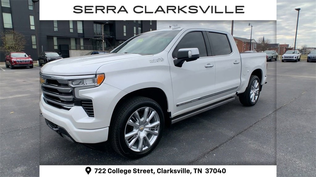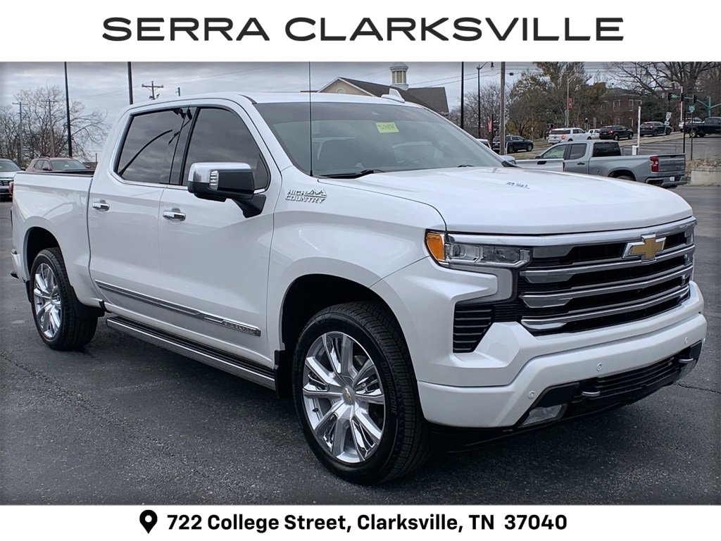 The Pre-Owned 2023 Chevrolet Silverado 1500 High Country with EcoTec3 6.2L V8 at Serra Clarksville. Well equipped: High Capacity Suspension Package, High Country Premium Package (All-Weather Floor Liner (LPO), Power Sunroof, and Wheels: 22 x 9 Painted Aluminum), Preferred Equipment Group 3LZ (10-Way Power Driver Seat w/Lumbar, 10-Way Power Passenger Seat Adjuster w/Lumbar, 12.3 Multicolor Reconfigurable Digital Display, 120-Volt Bed Mounted Power Outlet, 120-Volt Instrument Panel Power Outlet, 2 USB Data Ports, 2nd Row Heated Outboard Seats, Auto-Dimming Inside Rear-View Mirror, Auto-Locking Rear Differential, Bed View Camera, Bluetooth® For Phone, Body-Color Painted Mirror Caps, Chevrolet Connected Access Capable, Chevytec Spray-On Black Bedliner, Chrome Assist Steps, Chrome Recovery Hooks, Color-Keyed Carpeting Floor Covering, Compass, Deep-Tinted Glass, Driver Memory, Dual Exhaust w/Polished Outlets, Dual Rear USB Ports (Charge Only), Electric Rear-Window Defogger, Electrical Steering Column Lock, Electronic Cruise Control, Floor Mounted Center Console, Front Carpeted Floor Mats, Front LED Fog Lamps, Front Rainsensing Wipers, HD Surround Vision, Heated Driver & Front Outboard Passenger Seats, Heated Steering Wheel, Hitch Guidance w/Hitch View, Integrated Trailer Brake Controller, Keyless Open & Start, LED Cargo Area Lighting, OnStar & Chevrolet Connected Services Capable, Outside Heated Power-Adjustable Mirrors, Perimeter Lighting, Power Front Passenger Windows w/Express Up/Down, Power Front Windows w/Driver Express Up/Down, Power Rear Windows w/Express Down, Power Sliding Rear Window w/Rear Defogger, Power Tailgate, Power Tilt & Telescoping Steering Column, Rear Carpeted Floor Mats, Rear Cross Traffic Alert-Braking, Rear Pedestrian Alert, Rear Wheelhouse Liners, Remote Vehicle Starter System, Safety Alert Seat, SiriusXM w/360L, Standard Tailgate, Steering Wheel Audio Controls, Theft Deterrent System (Unauthorized Entry), Trailer Camera Provisions, Trailer Side Blind Zone Alert, Trailering App, Ultrasonic Front & Rear Park Assist, Universal Home Remote, Ventilated Driver & Front Passenger Seats, Wi-Fi Hot Spot Capable, Wireless Charging, Wireless Phone Projection, and Wrapped Steering Wheel), Technology Package (15 Diagonal Multicolor Head-Up Display, Adaptive Cruise Control, and Rear Camera Mirror), Trailering Package (Hitch Guidance), Up-Level Rear Seat w/Storage Package, 10-Speed Automatic, 4WD, Jet Black/Umber Leather, 170 Amp Alternator, 3.23 Rear Axle Ratio, 4-Wheel Disc Brakes, 7 Speakers, ABS brakes, Adaptive Ride Control Suspension, Air Conditioning, Alloy wheels, AM/FM radio: SiriusXM with 360L, Apple CarPlay/Android Auto, Auto High-beam Headlights, Auto-dimming door mirrors, Auto-dimming Rear-View mirror, Automatic Emergency Braking, Automatic temperature control, Bodyside moldings, Brake assist, Bumpers: body-color, Delay-off headlights, Driver door bin, Driver vanity mirror, Dual front impact airbags, Dual front side impact airbags, Electronic Stability Control, Electronic Transmission Range Selector Shifter, Following Distance Indicator, Forward Collision Alert, Front anti-roll bar, Front Bucket Seats, Front Center Armrest, Front dual zone A/C, Front fog lights, Front Pedestrian Braking, Front reading lights, Front wheel independent suspension, Fully automatic headlights, Garage door transmitter, Genuine wood console insert, Genuine wood dashboard insert, Genuine wood door panel insert, Heated door mirrors, Heated front seats, Heated rear seats, Heated steering wheel, Illuminated entry, IntelliBeam Automatic High Beam On/Off, Lane Keep Assist w/Lane Departure Warning, Low tire pressure warning, Memory seat, Not Equipped w/Steering Column Lock, Occupant sensing airbag, Outside temperature display, Overhead airbag, Overhead console, Panic alarm, Passenger door bin, Passen