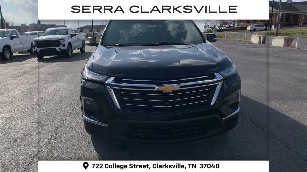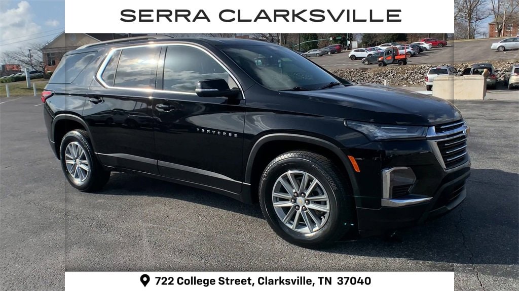 The Pre-Owned 2023 Chevrolet Traverse LT with 3.6L V6 SIDI VVT at Serra Clarksville. Well equipped: Cargo Package (LPO) (Retractable Cargo Shade and Vertical Cargo Net (LPO)), Convenience & Driver Confidence Package (4.2 Multi-Color Enhanced Driver Instrument Display, Heated Driver & Front Passenger Seats, Radio: Chevrolet Infotainment 3 Plus System, Rear Power Liftgate, Remote Start, SiriusXM w/360L, and Universal Home Remote), Preferred Equipment Group 1LT, Rear Camera Mirror Package (HD Surround Vision, Rear Camera Mirror Washer, and Rear Pedestrian Alert), Trailering Equipment (Heavy-Duty Cooling System and Trailering Assist Guidelines), 2-Way Manual Front Passenger Seat Adjuster, 3.49 Axle Ratio, 3rd row seats: split-bench, 4-Wheel Disc Brakes, 6 Speakers, 6-Speaker Audio System Feature, 8-Way Power Driver Seat Adjuster, ABS brakes, Air Conditioning, Alloy wheels, AM/FM radio: SiriusXM, Apple CarPlay/Android Auto, Auto High-beam Headlights, Automatic temperature control, Black Roof Rails, Brake assist, Bumpers: body-color, Compass, Delay-off headlights, Driver door bin, Driver vanity mirror, Dual front impact airbags, Dual front side impact airbags, Electronic Stability Control, Emergency communication system, Exterior Parking Camera Rear, Four wheel independent suspension, Front anti-roll bar, Front Bucket Seats, Front Center Armrest, Front dual zone A/C, Front reading lights, Fully automatic headlights, Heated door mirrors, Hitch Guidance w/Hitch View, Illuminated entry, Leather steering wheel, Low tire pressure warning, Not Equipped w/Rear Park Assist (060), Occupant sensing airbag, Outside temperature display, Overhead airbag, Overhead console, Panic alarm, Passenger door bin, Passenger vanity mirror, Power door mirrors, Power Driver Lumbar Control, Power driver seat, Power steering, Power windows, Premium Cloth Seat Trim, Radio data system, Radio: Chevrolet Infotainment System AM/FM Stereo, Rear air conditioning, Rear anti-roll bar, Rear reading lights, Rear window defroster, Rear window wiper, Remote keyless entry, Security system, SiriusXM Radio, Speed control, Speed-sensing steering, Spoiler, Steering wheel mounted audio controls, Tachometer, Telescoping steering wheel, Tilt steering wheel, Traction control, Trip computer, Turn signal indicator mirrors, Variably intermittent wipers, Voltmeter, and Wheels: 18 Bright Silver-Painted Aluminum.
