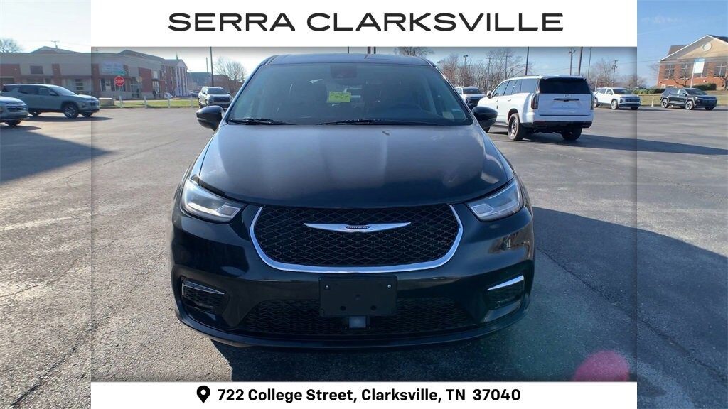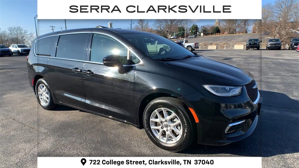 The Pre-Owned 2023 Chrysler Pacifica Touring L with 3.6L V6 24V VVT at Serra Clarksville. Well equipped: Quick Order Package 27L, 10.1 Touchscreen Display, 17 x 7.0 Aluminum Wheels, 3.25 Axle Ratio, 3rd row seats: split-bench, 4-Wheel Disc Brakes, 6 Speakers, ABS brakes, Air Conditioning, Alloy wheels, AM/FM radio: SiriusXM, Apple CarPlay, Apple CarPlay/Android Auto, Audio memory, Automatic temperature control, Black Seats, Brake assist, Bumpers: body-color, Caprice Leatherette Bucket Seats, Compass, Delay-off headlights, Disassociated Touchscreen Display, Driver door bin, Driver vanity mirror, Driver's Seat Mounted Armrest, Dual front impact airbags, Dual front side impact airbags, Electronic Stability Control, Four wheel independent suspension, Front anti-roll bar, Front Bucket Seats, Front dual zone A/C, Front Fascia Air Deflectors, Front fog lights, Front reading lights, Fully automatic headlights, Google Android Auto, GPS Antenna Input, Heated door mirrors, Heated front seats, Heated steering wheel, Illuminated entry, Integrated Active Noise Cancellation, Integrated Center Stack Radio, Knee airbag, Low tire pressure warning, Memory seat, Occupant sensing airbag, Outside temperature display, Overhead airbag, Overhead console, Panic alarm, ParkView Rear Back-Up Camera, Passenger door bin, Passenger seat mounted armrest, Passenger vanity mirror, Power door mirrors, Power driver seat, Power Liftgate, Power steering, Power windows, Radio data system, Radio: Uconnect 5 w/10.1 Display, Rain sensing wipers, Rear air conditioning, Rear reading lights, Rear window defroster, Rear window wiper, Reclining 3rd row seat, Remote keyless entry, Security system, Speed control, Split folding rear seat, Spoiler, Steering wheel mounted audio controls, Tachometer, Telescoping steering wheel, Tilt steering wheel, Touring Suspension, Traction control, Trip computer, Turn signal indicator mirrors, USB Host Flip, Variably intermittent wipers, and Voltmeter.