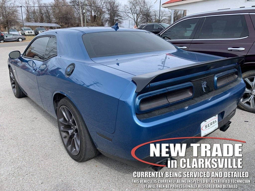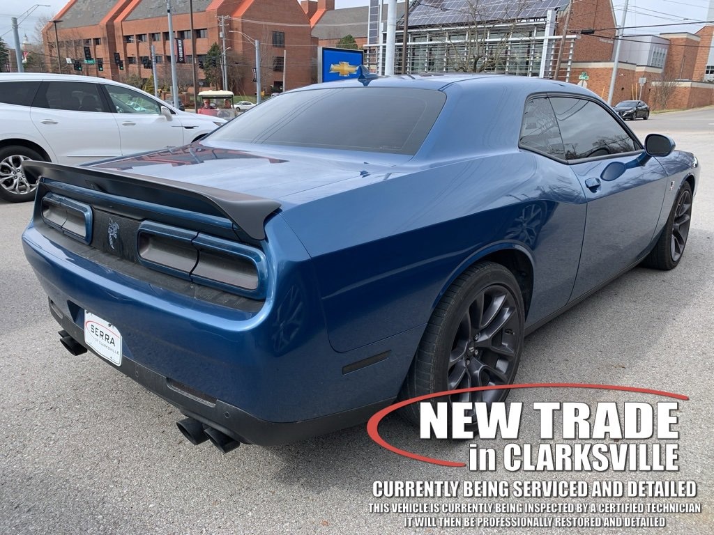 The Pre-Owned 2021 Dodge Challenger R/T Scat Pack with SRT HEMI 6.4L V8 at Serra Clarksville. Well equipped: Quick Order Package 23G R/T Scat Pack, 1-Yr SiriusXM Guardian Trial, 230MM Rear Axle, 4-Wheel Disc Brakes, 6 Speakers, ABS brakes, Air Conditioning, Alloy wheels, AM/FM radio: SiriusXM, Anti-whiplash front head restraints, Apple CarPlay, Apple CarPlay/Android Auto, Auto-dimming Rear-View mirror, Automatic temperature control, Brake assist, Bumpers: body-color, Compass, Delay-off headlights, Driver door bin, Driver vanity mirror, Dual front impact airbags, Dual front side impact airbags, Electronic Stability Control, Emergency communication system: SiriusXM Guardian, Four wheel independent suspension, Front anti-roll bar, Front Bucket Seats, Front Center Armrest, Front dual zone A/C, Front fog lights, Front reading lights, Fully automatic headlights, Garage door transmitter, Google Android Auto, GPS Antenna Input, Heated door mirrors, Heated front seats, Heated steering wheel, Illuminated entry, Integrated Center Stack Radio, Integrated Voice Command w/Bluetooth, Leather Shift Knob, Low tire pressure warning, Media Hub (2 USB, AUX), Outside temperature display, Overhead airbag, Overhead console, Panic alarm, ParkView Rear Back-Up Camera, Passenger door bin, Passenger vanity mirror, Power door mirrors, Power driver seat, Power steering, Power windows, Radio data system, Radio: Uconnect 4C w/8.4 Display, Rear anti-roll bar, Rear reading lights, Rear seat center armrest, Rear window defroster, Remote keyless entry, Scat Pack Logo Houndstooth Seat, Security system, Shark Fin Antenna, SiriusXM Satellite Radio, Speed control, Speed-sensing steering, Split folding rear seat, Spoiler, Sport steering wheel, Steering wheel mounted audio controls, Tachometer, Telescoping steering wheel, Tilt steering wheel, Traction control, Trip computer, USB Host Flip, Variably intermittent wipers, and Wheels: 20 x 9 Lo Gloss Granite Crystal.