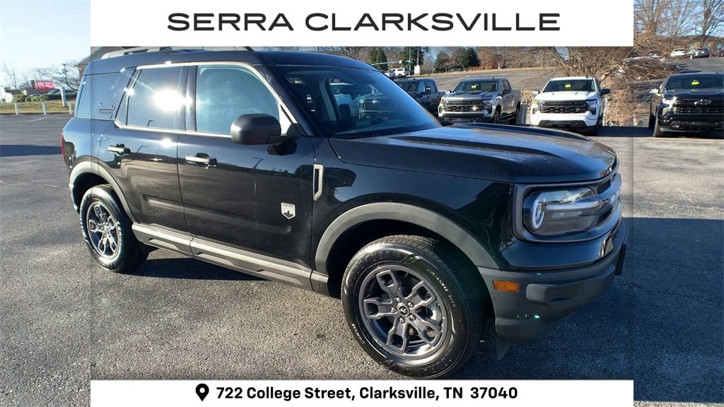 The Pre-Owned 2022 Ford Bronco Sport Big Bend with 1.5L EcoBoost at Serra Clarksville. Well equipped: Equipment Group 200A, 3.80 Axle Ratio, 4-Wheel Disc Brakes, 6 Speakers, ABS brakes, Air Conditioning, Alloy wheels, AM/FM radio: SiriusXM, AM/FM Stereo, Auto High-beam Headlights, Automatic temperature control, Brake assist, Compass, Delay-off headlights, Driver door bin, Driver vanity mirror, Dual front impact airbags, Dual front side impact airbags, Electronic Stability Control, Emergency communication system: SYNC 3 911 Assist, Four wheel independent suspension, Front anti-roll bar, Front Bucket Seats, Front Center Armrest, Front reading lights, Fully automatic headlights, Heated door mirrors, Illuminated entry, Knee airbag, Low tire pressure warning, Occupant sensing airbag, Outside temperature display, Overhead airbag, Overhead console, Panic alarm, Passenger door bin, Passenger vanity mirror, Power door mirrors, Power steering, Power windows, Radio data system, Rear anti-roll bar, Rear reading lights, Rear seat center armrest, Rear window defroster, Rear window wiper, Remote keyless entry, Roof rack: rails only, Security system, SiriusXM Radio, Speed control, Speed-sensing steering, Speed-Sensitive Wipers, Split folding rear seat, Steering wheel mounted audio controls, SYNC 3 Communications & Entertainment System, SYNC 3/Apple CarPlay/Android Auto, Tachometer, Telescoping steering wheel, Tilt steering wheel, Traction control, Trip computer, Unique Cloth Front Bucket Seats, Variably intermittent wipers, and Wheels: 17 Carbonized Gray-Painted Aluminum.