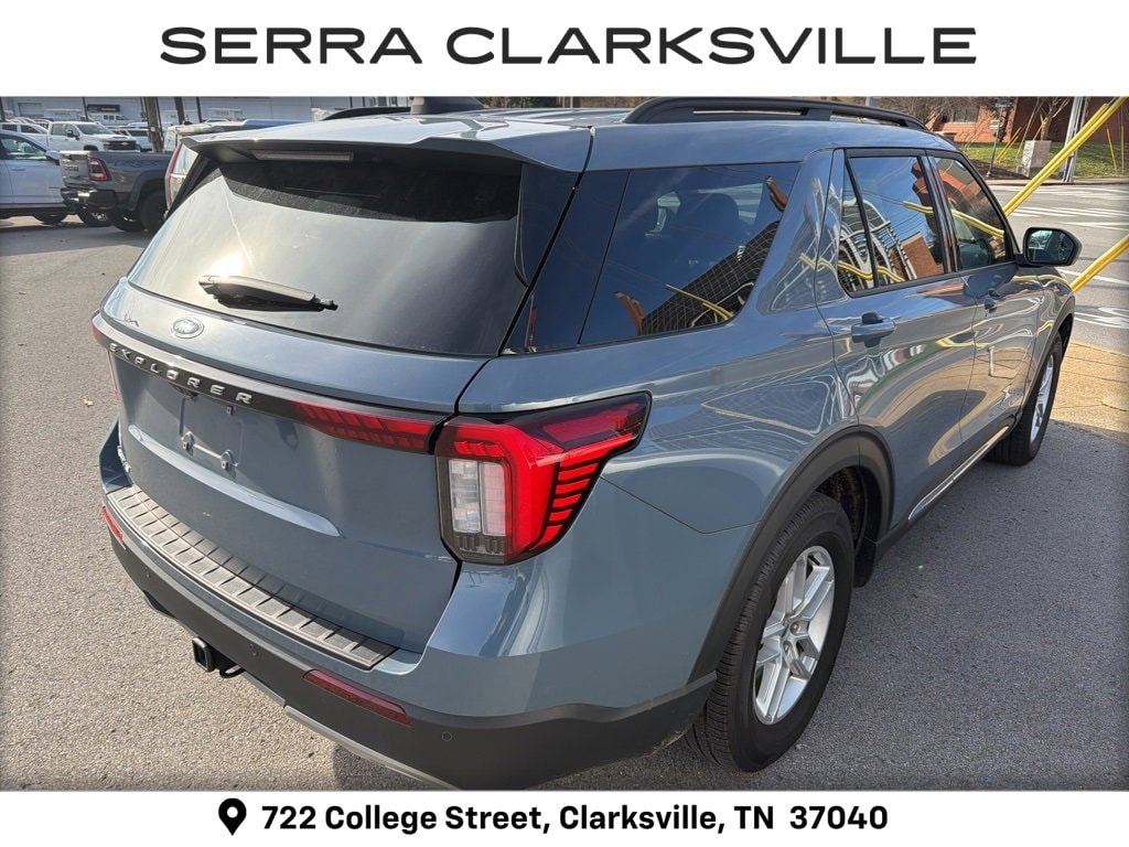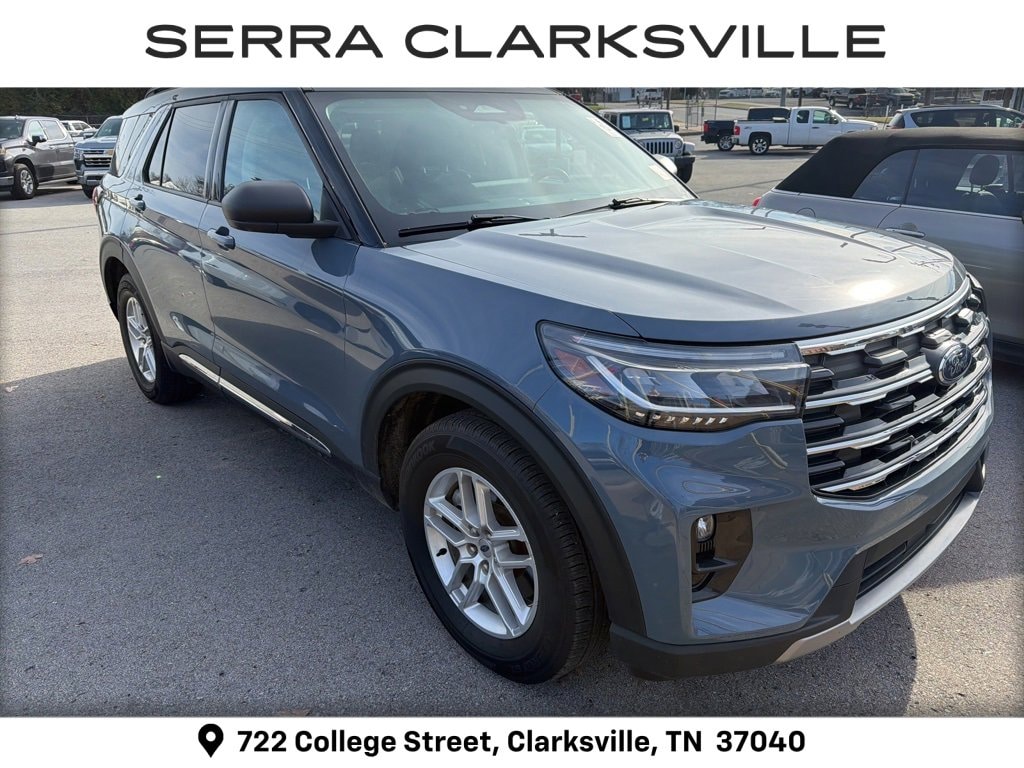 The Pre-Owned 2025 Ford Explorer Active with 2.3L EcoBoost I-4 at Serra Clarksville. Well equipped: Active Comfort Package (Front Fascia, Heated ActiveX Seating Material Captain's Chairs, Heated Steering Wheel, Remote Start System, Second Row HVAC Controls, and Universal Garage Door Opener (UGDO)), Equipment Group 200A Standard Package, 3.58 Non-Limited Slip Rear Axle, 3rd row seats: bench, 4-Wheel Disc Brakes, 6 Speakers, ABS brakes, Air Conditioning, Alloy wheels, AM/FM radio: SiriusXM with 360L, AM/FM Stereo, Apple CarPlay/Android Auto, Auto High-beam Headlights, Automatic temperature control, Brake assist, Bumpers: body-color, Compass, Delay-off headlights, Driver door bin, Driver vanity mirror, Dual front impact airbags, Dual front side impact airbags, Electronic Stability Control, Emergency communication system: 911 Assist, Exterior Parking Camera Rear, Four wheel independent suspension, Front anti-roll bar, Front Bucket Seats, Front Center Armrest, Front dual zone A/C, Front reading lights, Fully automatic headlights, Heated door mirrors, Heated front seats, Illuminated entry, Knee airbag, Leather steering wheel, Low tire pressure warning, Navigation System, Occupant sensing airbag, Outside temperature display, Overhead airbag, Overhead console, Panic alarm, Passenger door bin, Passenger vanity mirror, Power door mirrors, Power driver seat, Power Liftgate, Power passenger seat, Power steering, Power windows, Rear air conditioning, Rear anti-roll bar, Rear reading lights, Rear window defroster, Rear window wiper, Remote keyless entry, Security system, Speed control, Speed-sensing steering, Speed-Sensitive Wipers, Split folding rear seat, Spoiler, Steering wheel mounted audio controls, Tachometer, Telescoping steering wheel, Tilt steering wheel, Traction control, Trip computer, Unique Heated Cloth Captain's Chairs, Variably intermittent wipers, and Wheels: 18 Sparkle Silver-Painted Aluminum.
