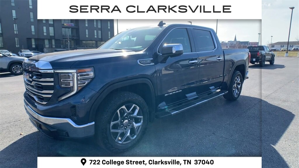 CARFAX One-Owner. Clean CARFAX. Pacific Blue Metallic 2023 GMC Sierra 1500 SLTThe Pre-Owned 2023 GMC Sierra 1500 SLT with EcoTec3 5.3L V8 at Serra Clarksville. Well equipped: High Capacity Suspension Package, Preferred Equipment Group 4SA (120-Volt Bed Mounted Power Outlet, 120-Volt Instrument Panel Power Outlet, 170 Amp Alternator, 2 Charge/Data USB Ports, 2 Type-C Charge-Only Rear USB Ports, 6-Speaker Audio System Feature, Auto-Locking Rear Differential, Auxiliary External Transmission Oil Cooler, Chrome Header & Chrome Grille Insert Bars, Color-Keyed Carpeting Floor Covering, Compass, Deep-Tinted Glass, Electric Rear-Window Defogger, Electrical Steering Column Lock, Front Frame-Mounted Black Recovery Hooks, Front Rainsensing Wipers, GMC Connected Access Capable, HD Rear Vision Camera, Keyless Open & Start, LED Cargo Area Lighting, Manual Tilt-Wheel & Telescoping Steering Column, OnStar & GMC Connected Services Capable, Perimeter Lighting, Power Door Locks, Power Front Passenger Windows w/Express Up/Down, Power Front Windows w/Driver Express Up/Down, Power Rear Windows w/Express Down, Push Button Start, Rear Wheelhouse Liners, Remote Vehicle Starter System, SiriusXM w/360L, Steering Wheel Audio Controls, Theft Deterrent System (Unauthorized Entry), Wi-Fi Hotspot Capable, and Wireless Phone Projection), SLT Convenience Package (2 Charge/Data USB Ports Inside Center Console, Electronic Precision Shift, Floor-Mounted Center Console, Front Bucket Seats, Power Rake & Telescoping Steering Column, Premium Bose 7-Speaker Sound System, Ventilated Driver & Front Passenger Seats, and Wireless Charging), SLT Preferred Package (Adaptive Cruise Control, Heated 2nd Row Outboard Seats, Power Sliding Rear Window w/Rear Defogger, and Universal Home Remote), Standard Suspension Package, Trailering Package (Hitch Guidance), X31 Off-Road Package (Dual Exhaust System, Heavy-Duty Air Filter, Hill Descent Control, Off-Road Suspension, and X31 Hard Badge), 10-Speed Automatic, 4WD, Jet Black Leather, 10-Way Power Driver Seat Adjuster w/Lumbar, 10-Way Power Passenger Seat Adjuster w/Lumbar, 20 Polished Aluminum Wheels, 3.23 Rear Axle Ratio, 4-Wheel Disc Brakes, 6 Speakers, ABS brakes, Air Conditioning, Alloy wheels, AM/FM radio, Apple CarPlay/Android Auto, Auto High-beam Headlights, Auto-dimming door mirrors, Auto-dimming Rear-View mirror, Automatic Emergency Braking, Automatic temperature control, Brake assist, Buckle to Drive, Bumpers: chrome, Chrome Wheel To Wheel Assist Steps, Delay-off headlights, Driver door bin, Driver Memory, Driver vanity mirror, Dual front impact airbags, Dual front side impact airbags, Electronic Stability Control, Emergency communication system: OnStar and GMC connected services capable, Following Distance Indicator, Forward Collision Alert, Front 40/20/40 Split-Bench Seat, Front anti-roll bar, Front Center Armrest w/Storage, Front dual zone A/C, Front fog lights, Front Pedestrian Braking, Front reading lights, Front wheel independent suspension, Fully automatic headlights, Heated door mirrors, Heated Driver & Front Outboard Passenger Seating, Heated front seats, Heated steering wheel, Illuminated entry, IntelliBeam Automatic High Beam On/Off, Lane Keep Assist w/Lane Departure Warning, Low tire pressure warning, Memory seat, Navigation System, Not Equipped w/Steering Column Lock, Occupant sensing airbag, Outside temperature display, Overhead airbag, Overhead console, Panic alarm, Passenger door bin, Passenger vanity mirror, Perf Leather-Appointed Front Outboard Seat Trim, Power door mirrors, Power driver seat, Power passenger seat, Power steering, Power windows, Premium audio system: GMC Infotainment System, Radio data system, Radio: Premium GMC Infotainment Audio System, Rain sensing wipers, Rear reading lights, Rear seat center armrest, Rear step bumper, Rear window defroster, Remote keyless entry, Security system, Speed control, Speed-sensing steering, Split folding rear seat, Steering wheel mounted audio contr