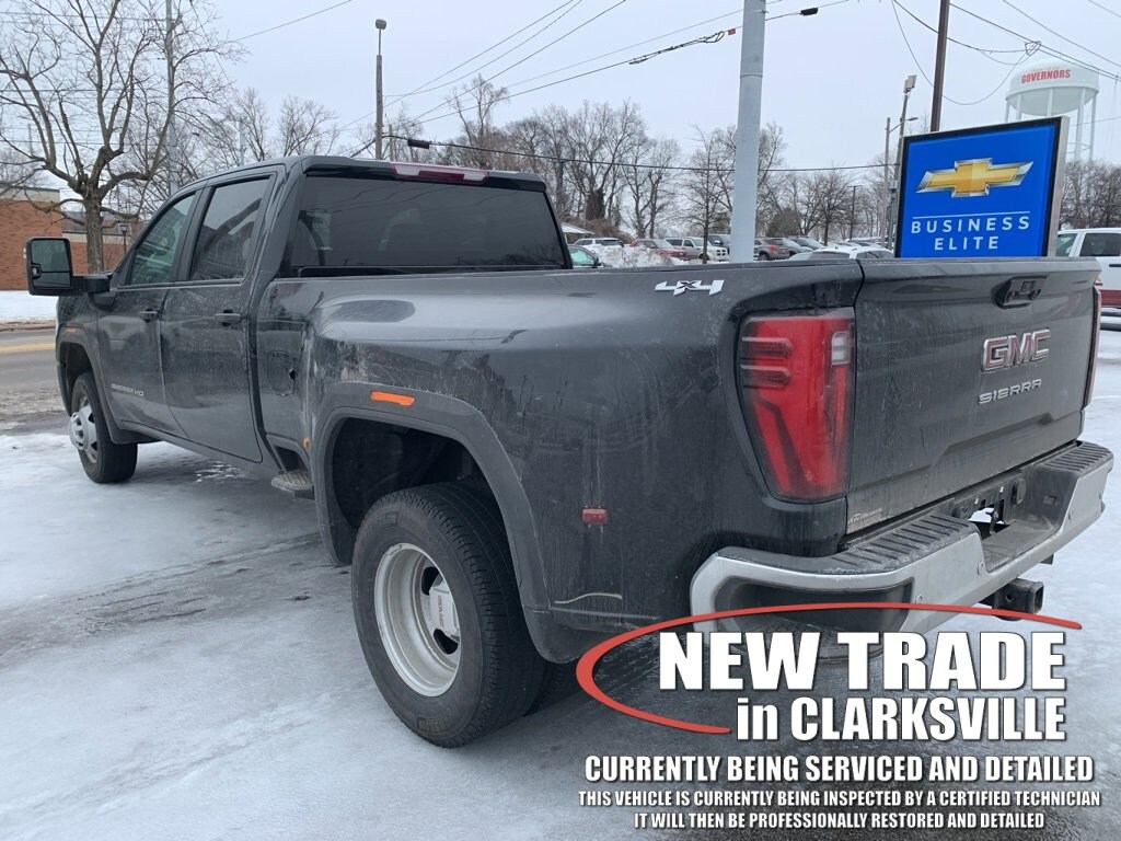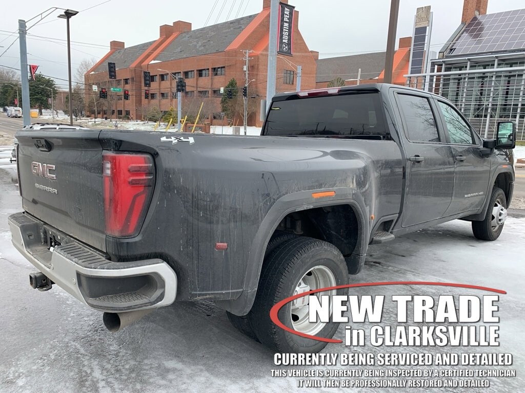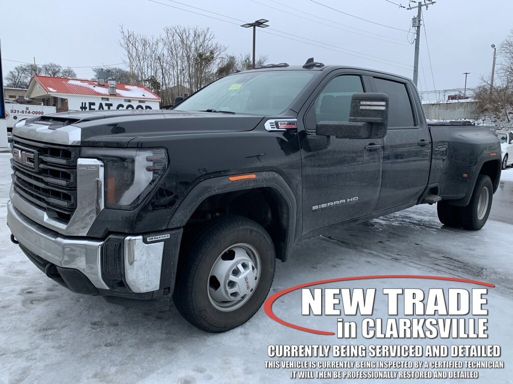 The Pre-Owned 2024 GMC Sierra 3500HD Pro with Duramax 6.6L V8 Turbodiesel at Serra Clarksville. Well equipped: 1SA Pro Safety Plus Package (Auto-Dimming Inside Rear-View Mirror, Lane Change Alert w/Side Blind Zone Alert, Power-Adjustable Black Outside Mirrors, Rear Cross Traffic Alert, and Rear Parking Assist), Convenience Package (Deep-Tinted Glass, Electric Rear-Window Defogger, EZ Lift Power Lock & Release Tailgate, LED Cargo Area Lighting, and Steering Wheel-Mounted Cruise Control), Gooseneck/5th Wheel Prep Package (Integrated Trailer Brake Controller and Spray-On Pickup Bedliner), Preferred Equipment Group 1SA (2 Charge/Data USB Ports, 2-Speed Electronic Shift Transfer Case, Chrome Grille w/Flat Black Grille Insert Bars, Push Button Start, Remote Keyless Entry, Solar Absorbing Tinted Glass, and Wireless Phone Projection), Suspension Package, 10-Speed Automatic, 4WD, Jet Black Vinyl, 120-Volt Bed Mounted Power Outlet, 120-Volt Instrument Panel Power Outlet, 2 Charge-Only Rear USB Ports, 220 Amp Alternator, 4-Way Manual Driver Seat Adjuster, 4-Way Manual Passenger Seat Adjuster, 4-Wheel Disc Brakes, 6 Speakers, 6-Speaker Audio System Feature, ABS brakes, Air Conditioning, AM/FM radio, Apple CarPlay/Android Auto, Auto High-beam Headlights, Automatic Emergency Braking, Brake assist, Buckle to Drive, Bumpers: chrome, Compass, Delay-off headlights, Driver door bin, Dual front impact airbags, Dual front side impact airbags, Electronic Stability Control, Engine Block Heater, Exhaust Brake, Following Distance Indicator, Forward Collision Alert, Front 40/20/40 Split-Bench Seats w/Lockable Storage, Front anti-roll bar, Front Center Armrest w/Storage, Front Pedestrian Braking, Front reading lights, Front wheel independent suspension, Fully automatic headlights, Heavy-Duty 80 Amp-Hr Battery, Illuminated entry, IntelliBeam Automatic High Beam On/Off, Lane Departure Warning System, Low tire pressure warning, Manual Tilt-Wheel/Telescoping Steering Column, Not Equipped w/Rear USB Ports, Occupant sensing airbag, Outside temperature display, Overhead airbag, Overhead console, Panic alarm, Passenger door bin, Passenger vanity mirror, Pickup Bed, Power steering, Power windows, Premium audio system: GMC Infotainment System, Radio: AM/FM w/GMC Infotainment System, Rear reading lights, Rear step bumper, Remote keyless entry, Split folding rear seat, Tachometer, Tilt steering wheel, Traction control, Trip computer, Variably intermittent wipers, Vinyl Seat Trim, Voltmeter, and Winter Grille Cover.
