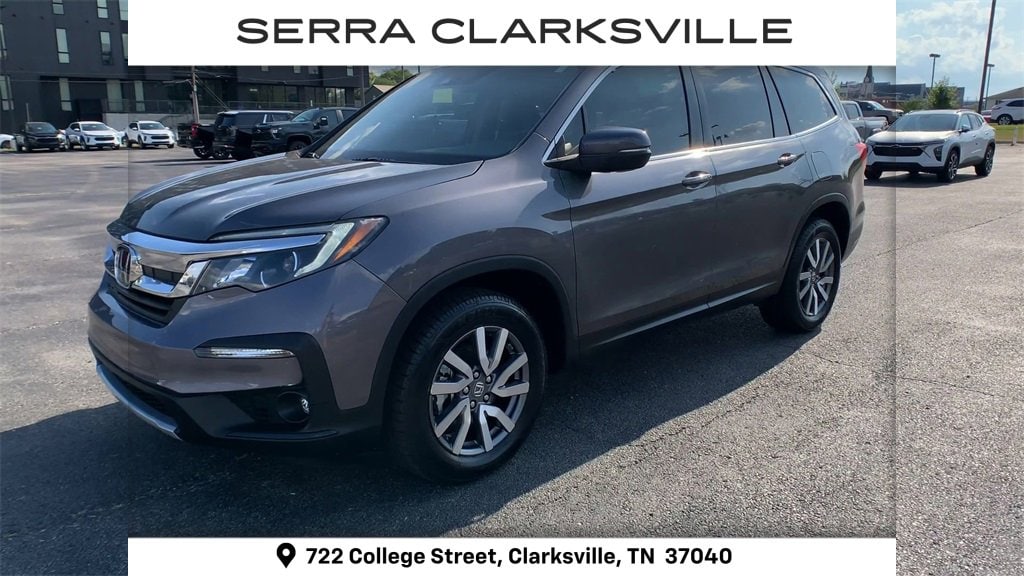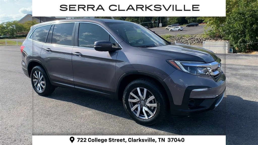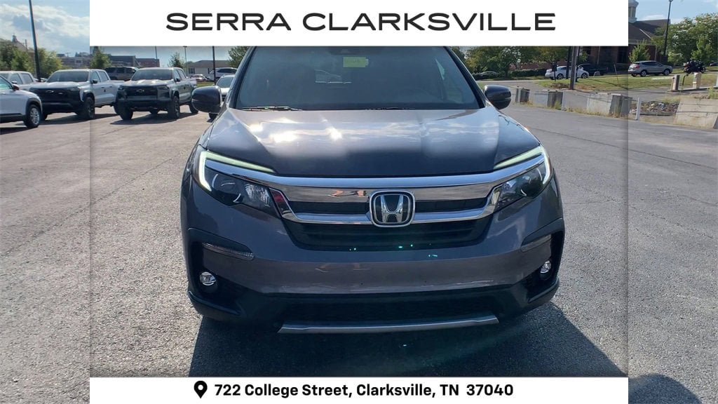 One-owner local trade-in! The Pre-Owned 2021 Honda Pilot EX-L with 3.5L V6 24V SOHC i-VTEC at Serra Clarksville. Well equipped: AWD, 18 Machine-Finished Alloy Wheels, 3rd row seats: split-bench, 4-Wheel Disc Brakes, 4.33 Axle Ratio, 7 Speakers, A/V remote: CabinControl, ABS brakes, Air Conditioning, Alloy wheels, AM/FM radio: SiriusXM, Apple CarPlay/Android Auto, Auto High-beam Headlights, Auto-dimming Rear-View mirror, Automatic temperature control, Blind Spot Information (BSI) System warning, Brake assist, Bumpers: body-color, Delay-off headlights, Driver door bin, Driver vanity mirror, Dual front impact airbags, Dual front side impact airbags, Electronic Stability Control, Emergency communication system: HondaLink Assist, Exterior Parking Camera Rear, Forward collision: Collision Mitigation Braking System (CMBS) + FCW mitigation, Four wheel independent suspension, Front anti-roll bar, Front Bucket Seats, Front Center Armrest, Front dual zone A/C, Front fog lights, Front reading lights, Fully automatic headlights, Garage door transmitter: HomeLink, Heated door mirrors, Heated Front Bucket Seats, Heated front seats, Illuminated entry, Lane departure: Lane Keeping Assist System (LKAS) active, Leather Seat Trim, Low tire pressure warning, Memory seat, Occupant sensing airbag, Outside temperature display, Overhead airbag, Overhead console, Panic alarm, Passenger door bin, Passenger vanity mirror, Power door mirrors, Power driver seat, Power Liftgate, Power moonroof, Power passenger seat, Power steering, Power windows, Radio data system, Radio: 215-Watt Audio System, Rear air conditioning, Rear anti-roll bar, Rear reading lights, Rear seat center armrest, Rear window defroster, Rear window wiper, Reclining 3rd row seat, Remote keyless entry, Security system, Speed control, Speed-sensing steering, Speed-Sensitive Wipers, Split folding rear seat, Spoiler, Steering wheel mounted audio controls, Tachometer, Telescoping steering wheel, Tilt steering wheel, Traction control, Trip computer, Turn signal indicator mirrors, and Variably intermittent wipers.