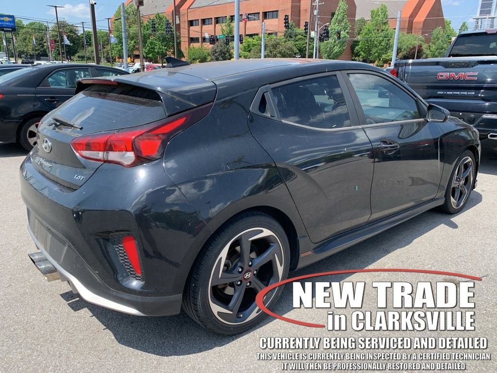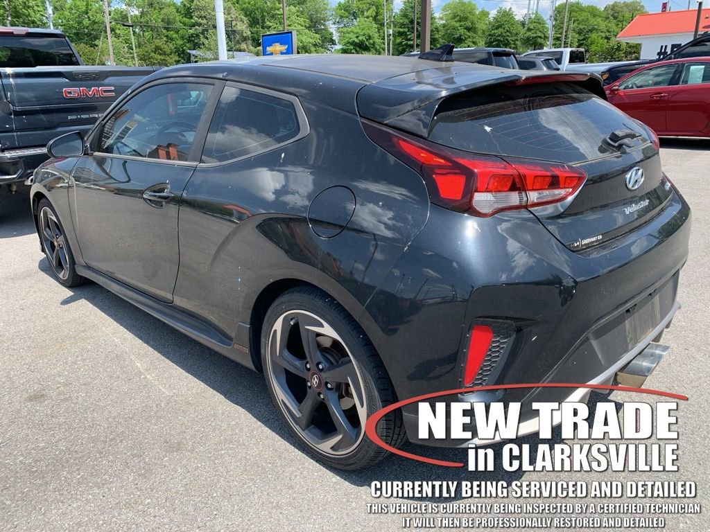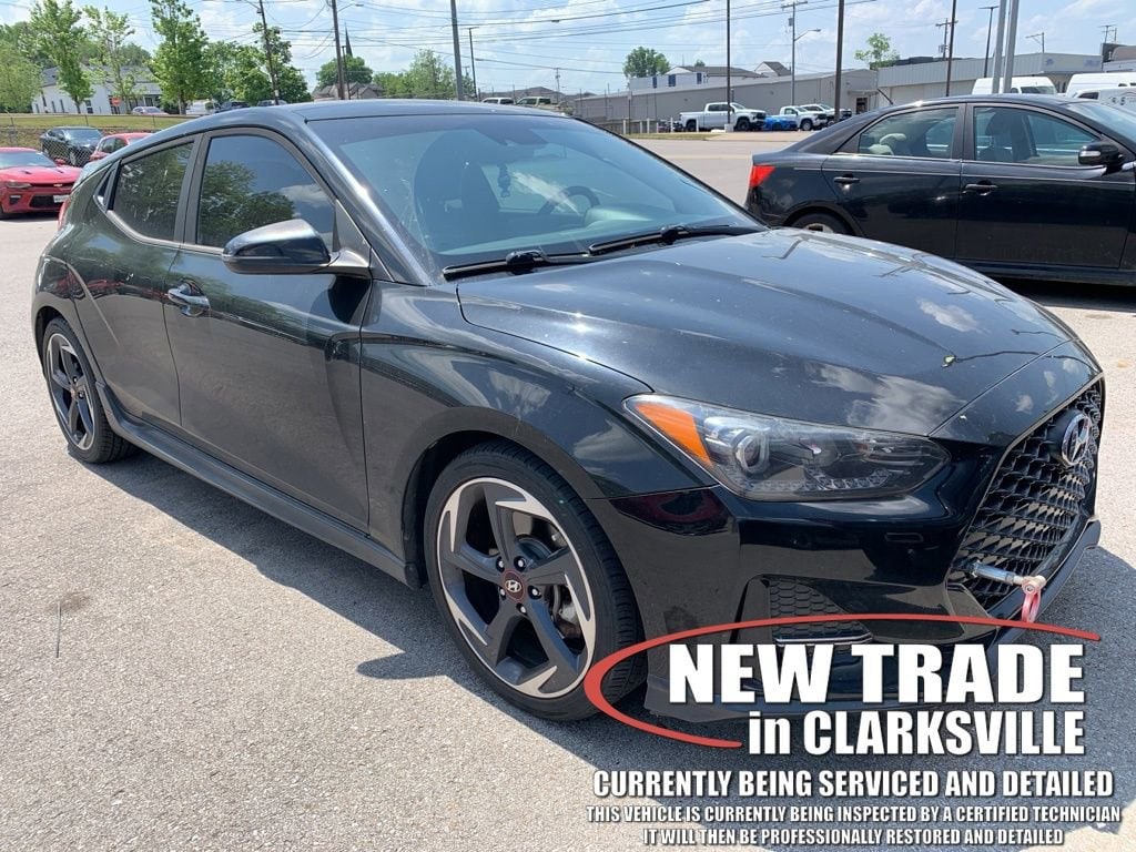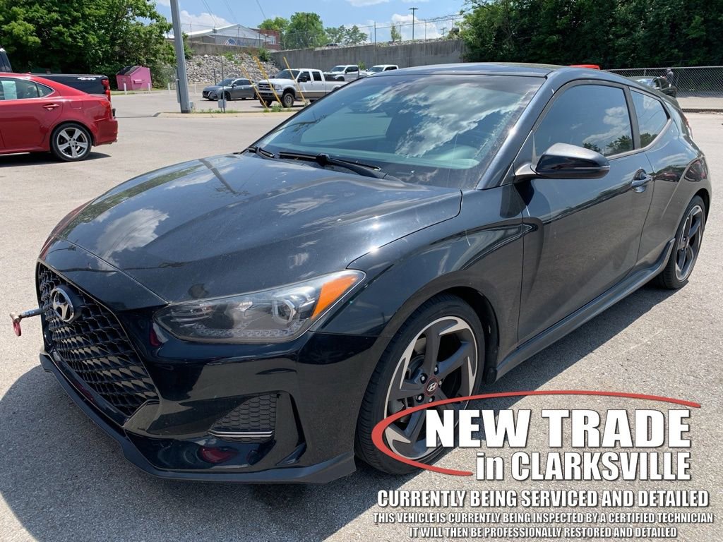 Clean CARFAX. Phantom Black 2019 Hyundai Veloster TurboThe Pre-Owned 2019 Hyundai Veloster Turbo with 1.6L 4-Cylinder DGI DOHC at Serra Clarksville. Well equipped: Option Group 01, 4-Wheel Disc Brakes, 8 Speakers, ABS brakes, Air Conditioning, Alloy wheels, AM/FM radio: SiriusXM, Apple CarPlay & Android Auto, Automatic temperature control, Brake assist, Bumpers: body-color, Carpeted Floor Mats, Delay-off headlights, Driver door bin, Driver vanity mirror, Dual front impact airbags, Dual front side impact airbags, Electronic Stability Control, Emergency communication system: Blue Link, Exterior Parking Camera Rear, Four wheel independent suspension, Front anti-roll bar, Front Bucket Seats, Front Center Armrest, Front reading lights, Fully automatic headlights, Heated door mirrors, Heated Front Bucket Seats, Heated front seats, Illuminated entry, Leather Shift Knob, Leather steering wheel, Low tire pressure warning, Occupant sensing airbag, Outside temperature display, Overhead airbag, Overhead console, Panic alarm, Passenger door bin, Passenger vanity mirror, Power door mirrors, Power moonroof, Power steering, Power windows, Premium audio system: Infinity, Radio: AM/FM 8 Display Audio, Rear anti-roll bar, Rear window defroster, Rear window wiper, Remote keyless entry, Security system, Speed control, Speed-sensing steering, Split folding rear seat, Spoiler, Steering wheel mounted audio controls, Tachometer, Telescoping steering wheel, Tilt steering wheel, Traction control, Trip computer, Turbo Combination Leather/Cloth Insert Seat Trim, Turn signal indicator mirrors, Variably intermittent wipers, and Wheels: 18 x 7.5J Alloy (C-Type)FWD 1.6L 4-Cylinder DGI DOHC ShiftronicRecent Arrival! 28/34 City/Highway MPGAwards:* 2019 KBB.com Our 10 Most Awarded Cars of 2019 * 2019 KBB.com 10 Coolest New Cars Under $20,000 * 2019 KBB.com 10 Favorite New-for-2019 Cars