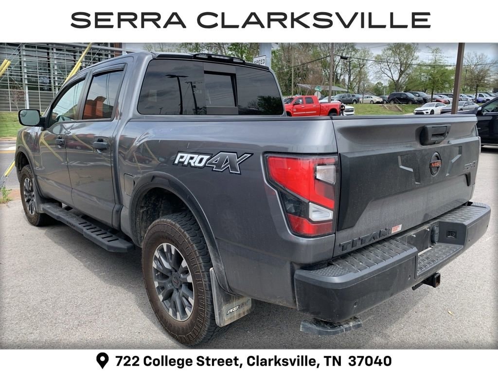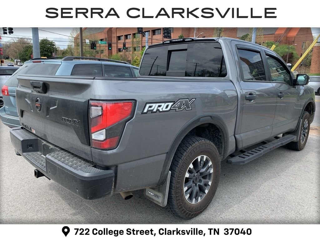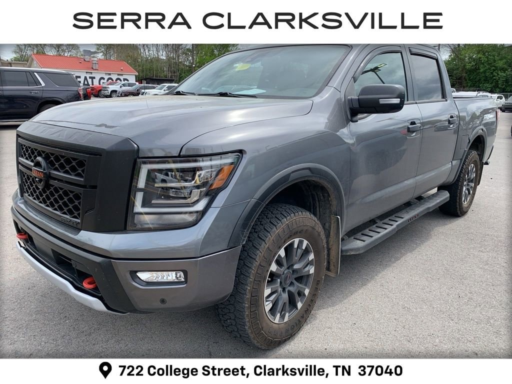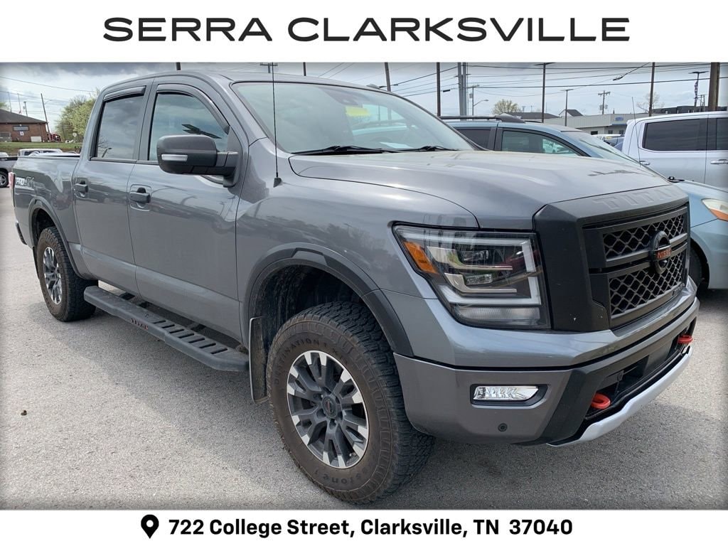 The Pre-Owned 2021 Nissan Titan PRO-4X with 5.6L V8 DOHC 32V 400hp at Serra Clarksville. Well equipped: Off Road Protection Package (All Season Floor Mats), PRO-4X Convenience Package (4-Way Power Assist Seat, Heated Driver & Passenger Seat, Heated Power Tilt/Telescopic Steering Wheel, Heated Rear Seats, Intelligent Around View Monitor (I-AVM), Leather Seat Trim, Memory Driver Seat w/Auto Entry/Exit Feature, Power Folding Auto Dimming Outside Mirrors, and Side Turn Signal Lamps on Mirror Housing), PRO-4X Moonroof Package (Driver & Passenger Ventilated Front Seats and Dual Panel Panoramic Moonroof w/Tilt & Slide), PRO-4X Utility Package (Fender Premium Audio System w/12 Speakers and Proximity Activation), 4WD, 3.692 Axle Ratio, 4-Wheel Disc Brakes, 6 Speakers, ABS brakes, Air Conditioning, Alloy wheels, AM/FM radio: SiriusXM, Auto High-beam Headlights, Auto-dimming Rear-View mirror, Auto-leveling suspension, Automatic temperature control, Bed Assist Grip, Blind Spot Warning, Brake assist, Cloth Seat Trim w/Vinyl Bolsters, Compass, Delay-off headlights, Driver door bin, Driver vanity mirror, Dual front impact airbags, Dual front side impact airbags, Electronic Stability Control, Emergency communication system: NissanConnect Services, Front anti-roll bar, Front Bucket Seats, Front Captain's Seats, Front Center Armrest, Front dual zone A/C, Front fog lights, Front reading lights, Front wheel independent suspension, Fully automatic headlights, Garage door transmitter: HomeLink, Heated door mirrors, Illuminated entry, Knee airbag, Leather steering wheel, Low tire pressure warning, Navigation system: NissanConnect Navigation, NissanConnect featuring Apple CarPlay and Android Auto, Occupant sensing airbag, Outside temperature display, Overhead airbag, Overhead console, Panic alarm, Passenger door bin, Passenger vanity mirror, Power door mirrors, Power driver seat, Power steering, Power windows, PRO-4X Badged Floor Mats (DISC), PRO-4X Illuminated Kick Plate, Pro4X Mud Flaps, Pro4X Rugged Step Boards, Radio data system, Radio: NissanConnect w/Navigation, Rain sensing wipers, Rear anti-roll bar, Rear Bumper Step w/Electronic Tailgate Lock, Rear Parking Sensors, Rear seat center armrest, Rear Seat Entertainment (H93) (DISC), Rear step bumper, Rear window defroster, Remote keyless entry, Security system, Speed control, Speed-sensing steering, Speed-Sensitive Wipers, Split folding rear seat, Steering wheel mounted audio controls, Tachometer, Telescoping steering wheel, Tilt steering wheel, Traction control, Trip computer, Variably intermittent wipers, Voltmeter, and Wheels: 18 x 8 Painted Dark Finish Alloy.