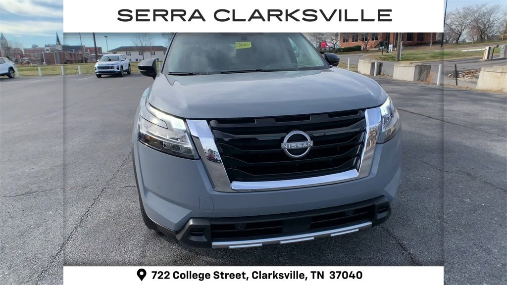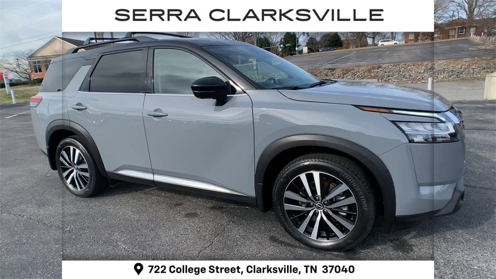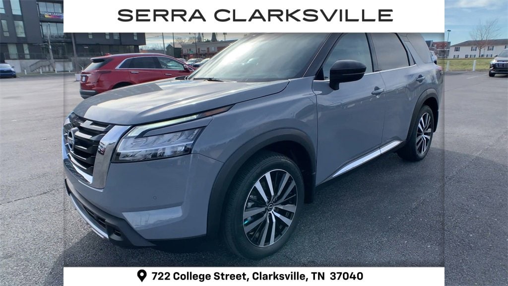 The Pre-Owned 2024 Nissan Pathfinder Platinum with 3.5L V6 DOHC at Serra Clarksville. Well equipped: Cargo Package (Cargo Area Protector, Cargo Net, and First Aid Kit), Platinum Captain Chairs Package (2nd-Row Captain Chairs and 2nd-Row Rear Headrest), 4WD, 13 Speakers, 3rd row seats: bench, 4-Wheel Disc Brakes, ABS brakes, Air Conditioning, Alloy wheels, AM/FM radio: SiriusXM, Auto High-beam Headlights, Auto tilt-away steering wheel, Auto-dimming Rear-View mirror, Automatic temperature control, Axle Ratio: 4.334, Black Splash Guards (Set of 4), Bodyside moldings, Bose Premium Audio System, Brake assist, Bumpers: body-color, Captain's Chairs Carpeted Floor Mats (Set of 4), Cross Bars, Delay-off headlights, Driver door bin, Driver vanity mirror, Dual front impact airbags, Dual front side impact airbags, Electronic Stability Control, Emergency communication system, Exterior Parking Camera Rear, Four wheel independent suspension, Front anti-roll bar, Front Bucket Seats, Front Center Armrest, Front dual zone A/C, Front reading lights, Fully automatic headlights, Garage door transmitter: HomeLink, Heads-Up Display, Heated & Cooled Front Bucket Seats, Heated door mirrors, Heated front seats, Heated rear seats, Heated steering wheel, Illuminated entry, Knee airbag, Leather steering wheel, Low tire pressure warning, Memory seat, Navigation system: NissanConnect with Navigation and Services, Nissan USB Charging Cable Set, NissanConnect featuring Apple CarPlay and Android Auto, NissanConnect w/Navigation & Services, Occupant sensing airbag, Outside temperature display, Overhead airbag, Overhead console, Panic alarm, Passenger door bin, Passenger vanity mirror, Power door mirrors, Power driver seat, Power Liftgate, Power moonroof, Power passenger seat, Power steering, Power windows, Radio data system, Radio: AM/FM Audio System, Rain sensing wipers, Rear air conditioning, Rear anti-roll bar, Rear reading lights, Rear seat center armrest, Rear side impact airbag, Rear window defroster, Rear window wiper, Reclining 3rd row seat, Remote keyless entry, Security system, Semi-Aniline Leather-Appointed Seating Surfaces, Speed control, Speed-sensing steering, Speed-Sensitive Wipers, Split folding rear seat, Spoiler, Steering wheel memory, Steering wheel mounted audio controls, Tachometer, Telescoping steering wheel, Tilt steering wheel, Traction control, Trip computer, Turn signal indicator mirrors, Variably intermittent wipers, Ventilated front seats, and Wheels: 20 x 8J Machined Alloy.