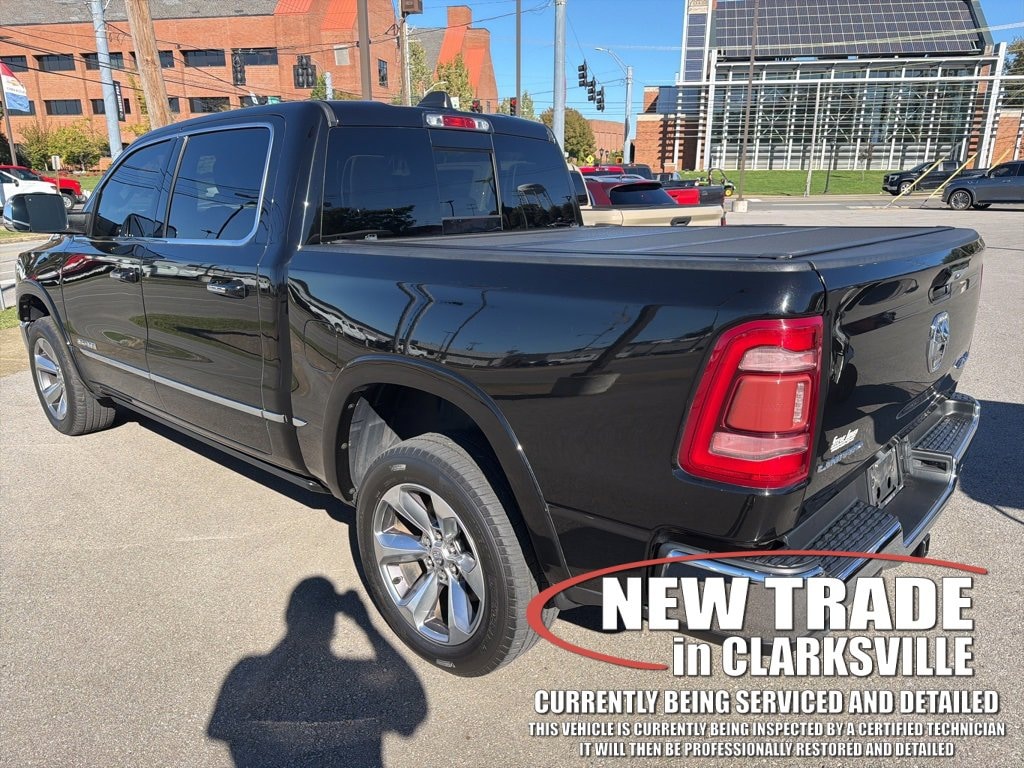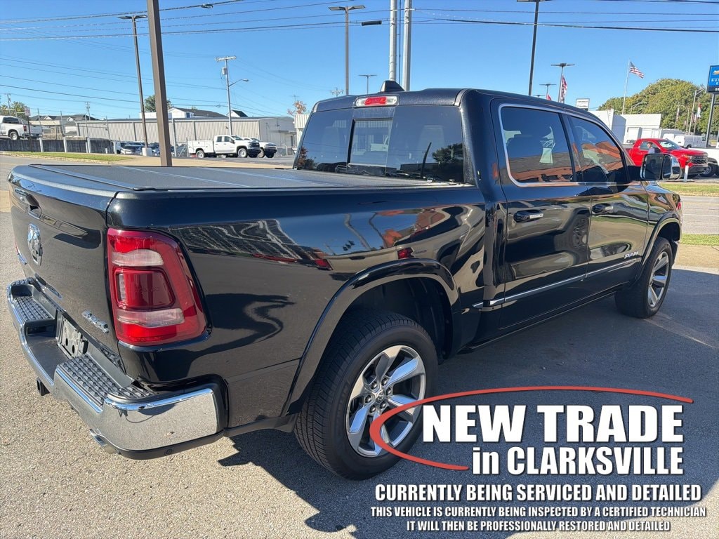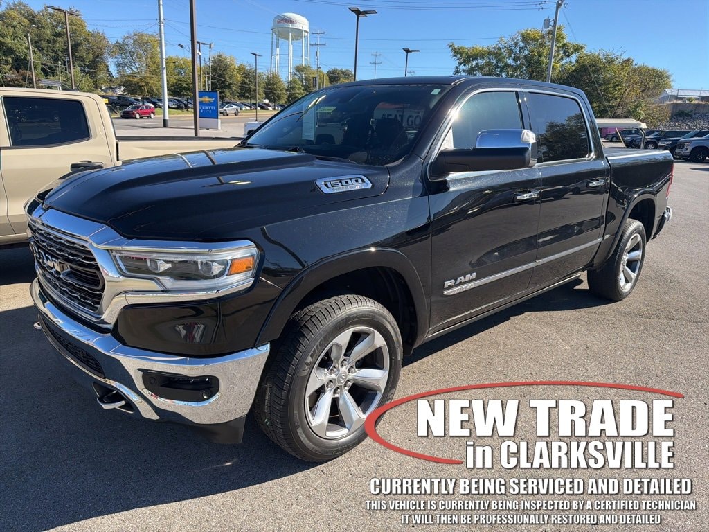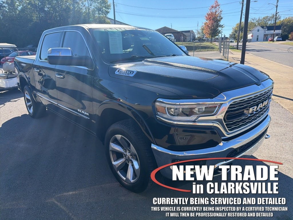 One-owner local new car trade-in! The Pre-Owned 2019 Ram 1500 Limited with HEMI 5.7L V8 Multi Displacement VVT at Serra Clarksville. Well equipped: Advanced Safety Group (Adaptive Cruise Control w/Stop & Go, Advanced Brake Assist, Full Speed Forward Collision Warning Plus, Lane Keep Assist, and Parallel & Perp Park Assist w/Stop), Protection Group, Quick Order Package 27M Limited, Trailer Tow Group (Power Chrome Trailer Tow Mirrors, Trailer Brake Control, and Trailer Tow Mirrors), 1-Yr SiriusXM Guardian Trial, 10 Speakers, 12 Touchscreen Display, 4-Wheel Disc Brakes, 48V Belt Starter Generator, ABS brakes, Adjustable pedals, Air Conditioning, Alloy wheels, AM/FM radio: SiriusXM with 360L, Apple CarPlay, Apple CarPlay/Android Auto, Audio memory, Auto High-beam Headlights, Auto-dimming door mirrors, Auto-dimming Rear-View mirror, Auto-leveling suspension, Automatic temperature control, Bodyside moldings, Brake assist, Bumpers: chrome, Compass, Delay-off headlights, Disassociated Touchscreen Display, Dome Dual LED Reading Lamp, Driver door bin, Driver vanity mirror, Dual front impact airbags, Dual front side impact airbags, Dual-Pane Panoramic Sunroof, E-Locker Rear Axle, Electronic Stability Control, Emergency communication system: SiriusXM Guardian, Front anti-roll bar, Front Bucket Seats, Front Center Armrest w/Storage, Front dual zone A/C, Front fog lights, Front reading lights, Front wheel independent suspension, Fully automatic headlights, Garage door transmitter, Genuine wood console insert, Genuine wood dashboard insert, Genuine wood door panel insert, Google Android Auto, GPS Antenna Input, GPS Navigation, HD Radio, Heated door mirrors, Heated front seats, Heated rear seats, Heated steering wheel, Illuminated entry, Integrated Center Stack Radio, Leather steering wheel, LED Dome/Reading Lamp, Low tire pressure warning, Manufacturer's Statement of Origin, Memory seat, Navigation System, Occupant sensing airbag, Outside temperature display, Overhead airbag, Overhead console, Panic alarm, ParkView Rear Back-Up Camera, Passenger door bin, Passenger vanity mirror, Pedal memory, Power door mirrors, Power driver seat, Power passenger seat, Power steering, Power windows, Premium Leather Trimmed Bucket Seats, Radio data system, Radio: Uconnect 12 w/Navigation, Rain sensing wipers, Rear anti-roll bar, Rear seat center armrest, Rear step bumper, Rear window defroster, Remote CD player, Remote keyless entry, Security system, SiriusXM Satellite Radio, SiriusXM Traffic Plus, SiriusXM Travel Link, SiriusXM w/360L, Speed control, Split folding rear seat, Steering wheel mounted audio controls, Tachometer, Telescoping steering wheel, Tilt steering wheel, Traction control, Trip computer, Turn signal indicator mirrors, USB Host Flip, Variably intermittent wipers, Ventilated front seats, Voltmeter, and Wheels: 20 x 9 Polished w/Inserts.