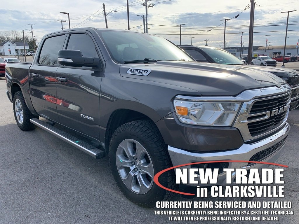 The Pre-Owned 2021 Ram 1500 Big Horn/Lone Star with HEMI 5.7L V8 Multi Displacement VVT at Serra Clarksville. Well equipped: Bed Utility Group (MOPAR 4 Adjustable Cargo Tie-Down Hooks, MOPAR Deployable Bed Step, MOPAR Spray In Bedliner, and Pick-Up Box Lighting), Big Horn Level 2 Equipment Group (115V Auxiliary Power Outlet, 115V Auxiliary Rear Power Outlet, 2nd Row In Floor Storage Bins, 400W Inverter, Air Conditioning ATC w/Dual Zone Control, Auto-Dimming Exterior Driver Mirror, Auto-Dimming Rear-View Mirror, Black Premium Power Mirrors, Class IV Receiver Hitch, Cluster 7.0 TFT Color Display, Exterior Mirrors Courtesy Lamps, Exterior Mirrors w/Supplemental Signals, Foam Bottle Insert (Door Trim Panel), For More Info, Call 800-643-2112, Glove Box Lamp, Heated Front Seats, Heated Steering Wheel, Media Hub w/2 Charge Only USBs, ParkSense Front/Rear Park Assist w/Stop, Power 4-Way Driver Lumbar Adjust, Power 8-Way Driver Seat, Power Adjustable Pedals, Power-Folding Mirrors, Rear Dome w/On/Off Switch Lamp, Rear Power Sliding Window, Rear Window Defroster, Security Alarm, SiriusXM Radio Service, Sun Visors w/Illuminated Vanity Mirrors, and Universal Garage Door Opener), Quick Order Package 23Z Big Horn (Big Horn Badge), Quick Order Package 25Z Big Horn, 3 Rear Seat Head Restraints, 3.21 Rear Axle Ratio, 33 Gallon Fuel Tank, 4 Way Front Headrests, 4-Wheel Disc Brakes, 40/20/40 Split Bench Seat, 48V Belt Starter Generator, 6 Speakers, ABS brakes, Air Conditioning, Alloy wheels, AM/FM radio, Anti-Spin Differential Rear Axle, Black Exterior Mirrors, Brake assist, Bumpers: chrome, Cloth Bench Seat, Compass, Delay-off headlights, Driver door bin, Dual front impact airbags, Dual front side impact airbags, Electronic Stability Control, Front anti-roll bar, Front Center Armrest w/Storage, Front fog lights, Front License Plate Bracket, Front reading lights, Front Seat Back Map Pockets, Front wheel independent suspension, Fully automatic headlights, GPS Antenna Input, Heated door mirrors, Illuminated entry, Integrated Voice Command w/Bluetooth, Leather steering wheel, Low tire pressure warning, Manufacturer's Statement of Origin, Occupant sensing airbag, Outside temperature display, Overhead airbag, Overhead console, Panic alarm, ParkView Rear Back-Up Camera, Passenger door bin, Passenger vanity mirror, Power door mirrors, Power steering, Power windows, Radio data system, Radio: Uconnect 3 w/5 Display, Radio: Uconnect 4 w/8.4 Display, Rear 60/40 Folding Seat, Rear anti-roll bar, Rear seat center armrest, Rear step bumper, Remote keyless entry, Remote Start System, Speed control, Split folding rear seat, Steering wheel mounted audio controls, Tachometer, Telescoping steering wheel, Tilt steering wheel, Traction control, Trip computer, Variably intermittent wipers, Voltmeter, Wheels: 18 x 8 Cast-Aluminum Painted, and Wheels: 20 x 9 Aluminum Chrome Clad.