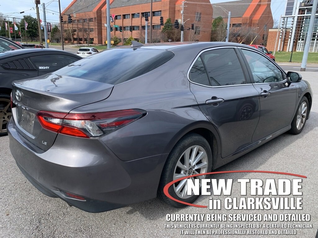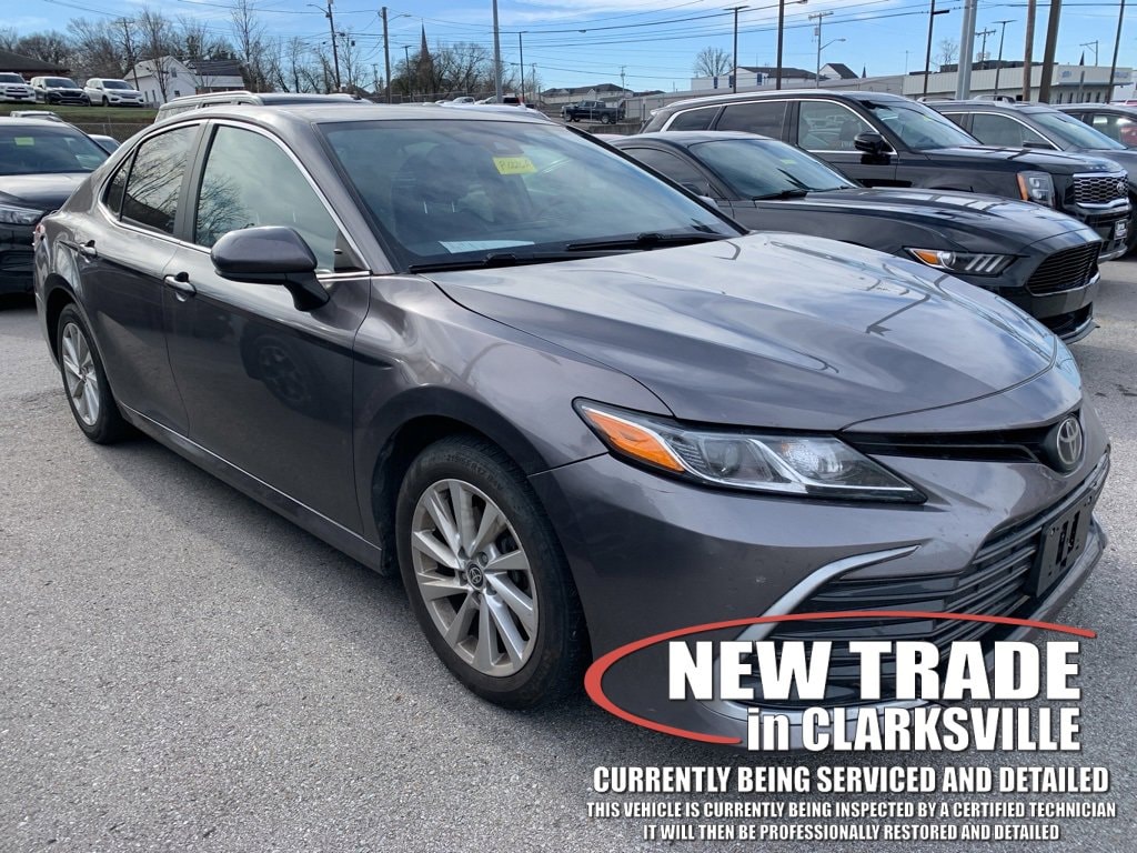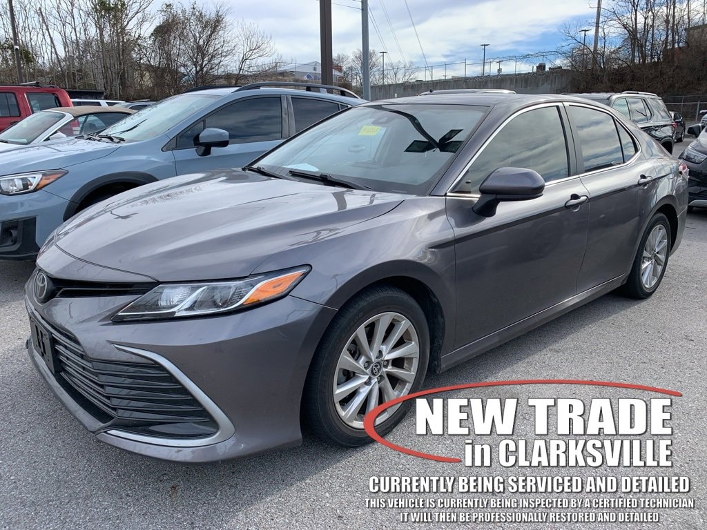 The Pre-Owned 2021 Toyota Camry LE with 2.5L I4 DOHC 16V at Serra Clarksville. Well equipped: Ash Cloth, 4-Wheel Disc Brakes, 6 Speakers, 7.5J x 17 Alloy Wheels, ABS brakes, Air Conditioning, Alloy wheels, AM/FM radio: SiriusXM, Apple CarPlay/Android Auto, Auto High-beam Headlights, Brake assist, Bumpers: body-color, Delay-off headlights, Driver door bin, Driver vanity mirror, Dual front impact airbags, Dual front side impact airbags, Electronic Stability Control, Emergency communication system: Safety Connect with 1-year trial, Exterior Parking Camera Rear, Fabric Seat Trim, Four wheel independent suspension, Front anti-roll bar, Front Bucket Seats, Front Center Armrest, Front reading lights, Fully automatic headlights, Illuminated entry, Knee airbag, Low tire pressure warning, Occupant sensing airbag, Outside temperature display, Overhead airbag, Overhead console, Panic alarm, Passenger door bin, Passenger vanity mirror, Power door mirrors, Power driver seat, Power steering, Power windows, Radio data system, Radio: AM/FM Audio System, Rear anti-roll bar, Rear seat center armrest, Rear side impact airbag, Rear window defroster, Remote keyless entry, Security system, Speed control, Speed-sensing steering, Split folding rear seat, Steering wheel mounted audio controls, Tachometer, Telescoping steering wheel, Tilt steering wheel, Traction control, Trip computer, and Variably intermittent wipers.