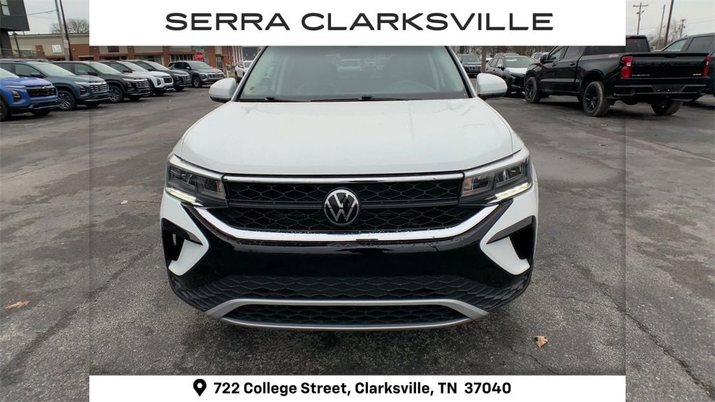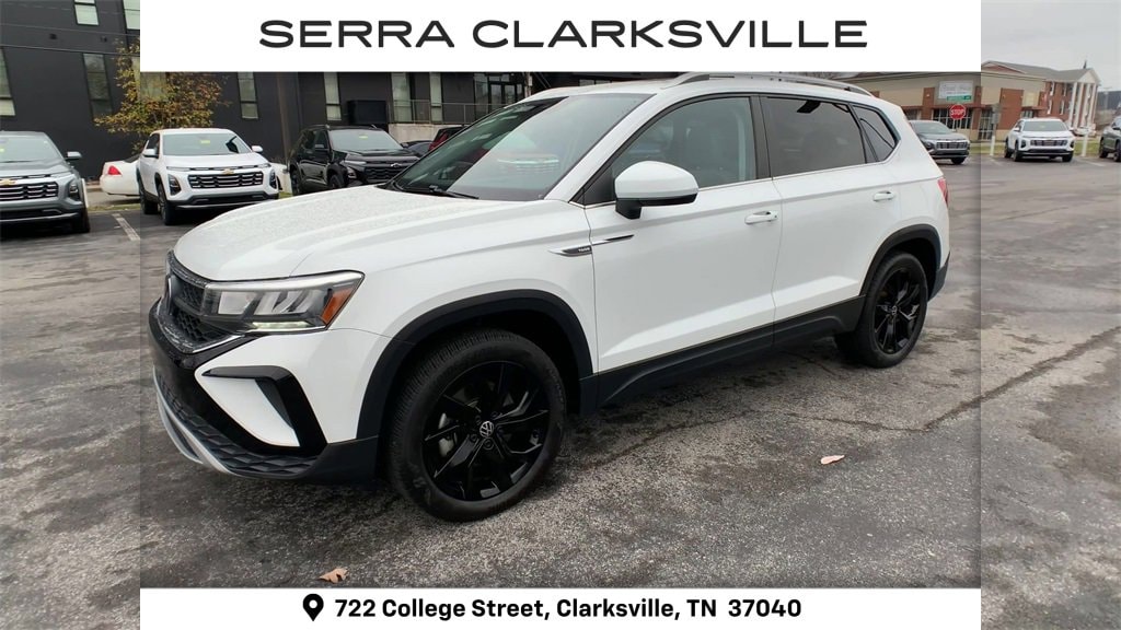 The Pre-Owned 2023 Volkswagen Taos 1.5T SE with 1.5L I4 Turbocharged DOHC 16V LEV3-SULEV30 158hp at Serra Clarksville. Well equipped: 4-Wheel Disc Brakes, 5.20 Axle Ratio, 6 Speakers, ABS brakes, Active Blind Spot Monitor, Air Conditioning, Alloy wheels, AM/FM radio: SiriusXM with 360L, Auto High-beam Headlights, Brake assist, Bumpers: body-color, CloudTex & Cloth Seating Surfaces, Compass, Delay-off headlights, Driver door bin, Driver vanity mirror, Dual front impact airbags, Dual front side impact airbags, Electronic Stability Control, Emergency communication system: VW Car-Net Safe & Secure 5-year, Exterior Parking Camera Rear, Four wheel independent suspension, Front anti-roll bar, Front Bucket Seats, Front Center Armrest, Front reading lights, Front Strut Rear Multi-Link Suspension, Fully automatic headlights, Heated door mirrors, Heated Front Comfort Seats, Heated front seats, Heated steering wheel, Illuminated entry, Leather Shift Knob, Low tire pressure warning, Occupant sensing airbag, Outside temperature display, Overhead airbag, Overhead console, Panic alarm, Passenger door bin, Passenger vanity mirror, Power door mirrors, Power driver seat, Power steering, Power windows, Radio data system, Radio: MIB3 Composition Media AM/FM/HD, Rain sensing wipers, Rear anti-roll bar, Rear seat center armrest, Rear window defroster, Rear window wiper, Remote keyless entry, Security system, Speed control, Speed-sensing steering, Split folding rear seat, Spoiler, Steering wheel mounted audio controls, Tachometer, Telescoping steering wheel, Tilt steering wheel, Traction control, Trip computer, Variably intermittent wipers, and Wheels: 18 2-Tone Machined Alloy.